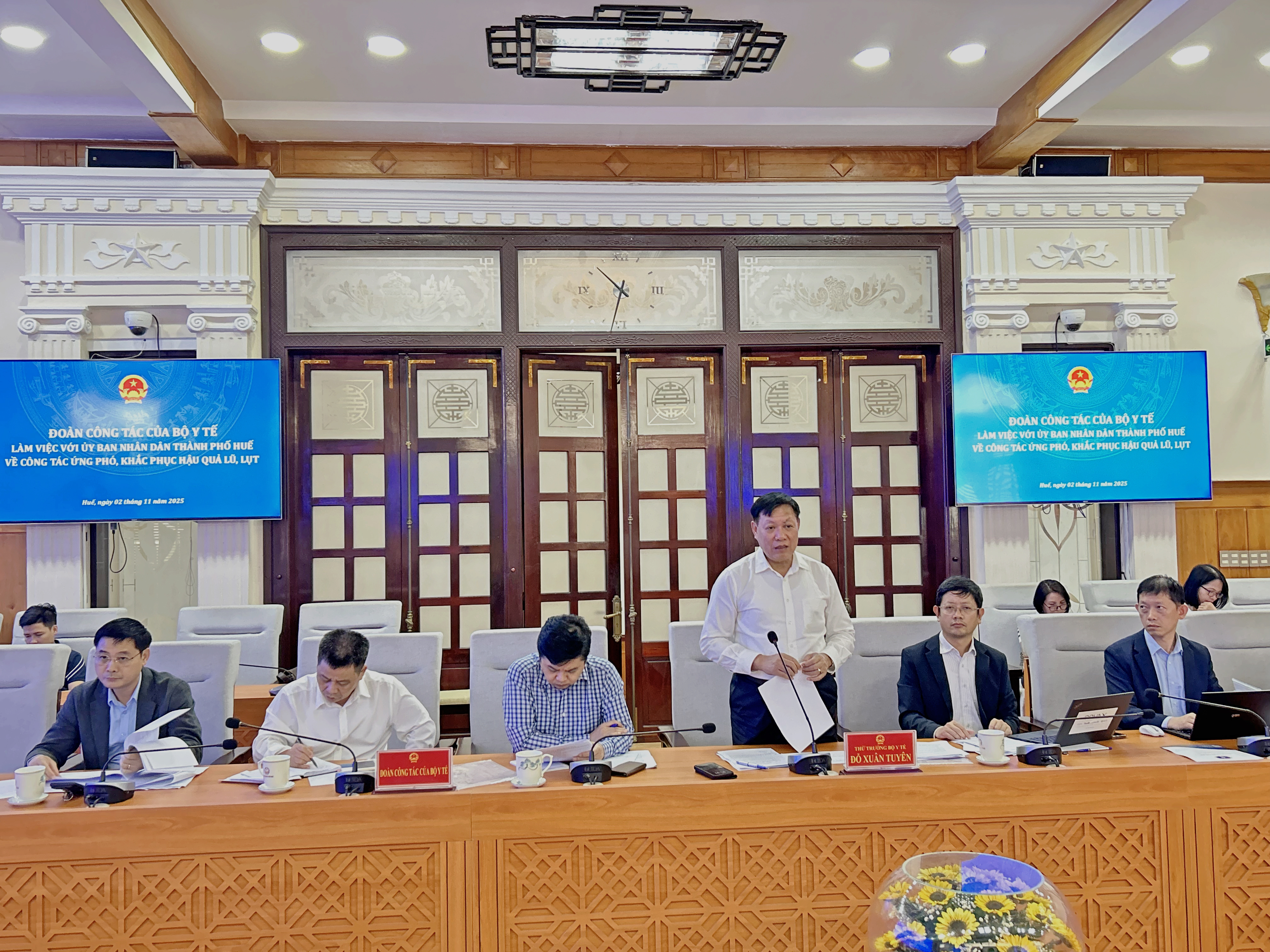Sáng 2/11, Đoàn công tác Bộ Y tế do Thứ trưởng Đỗ Xuân Tuyên làm trưởng đoàn, cùng lãnh đạo các Vụ, Cục và Công đoàn Y tế Việt Nam có buổi làm việc với UBND TP Huế về công tác ứng phó, khắc phục hậu quả lũ, lụt.Tham gia buổi làm việc về phía TP Huế có ông Nguyễn Thanh Bình, Phó Chủ tịch Thường trực UBND thành phố; PGS.TS Trần Kiêm Hảo, Giám đốc Sở Y tế cùng lãnh đạo các sở, ngành, đơn vị liên quan.