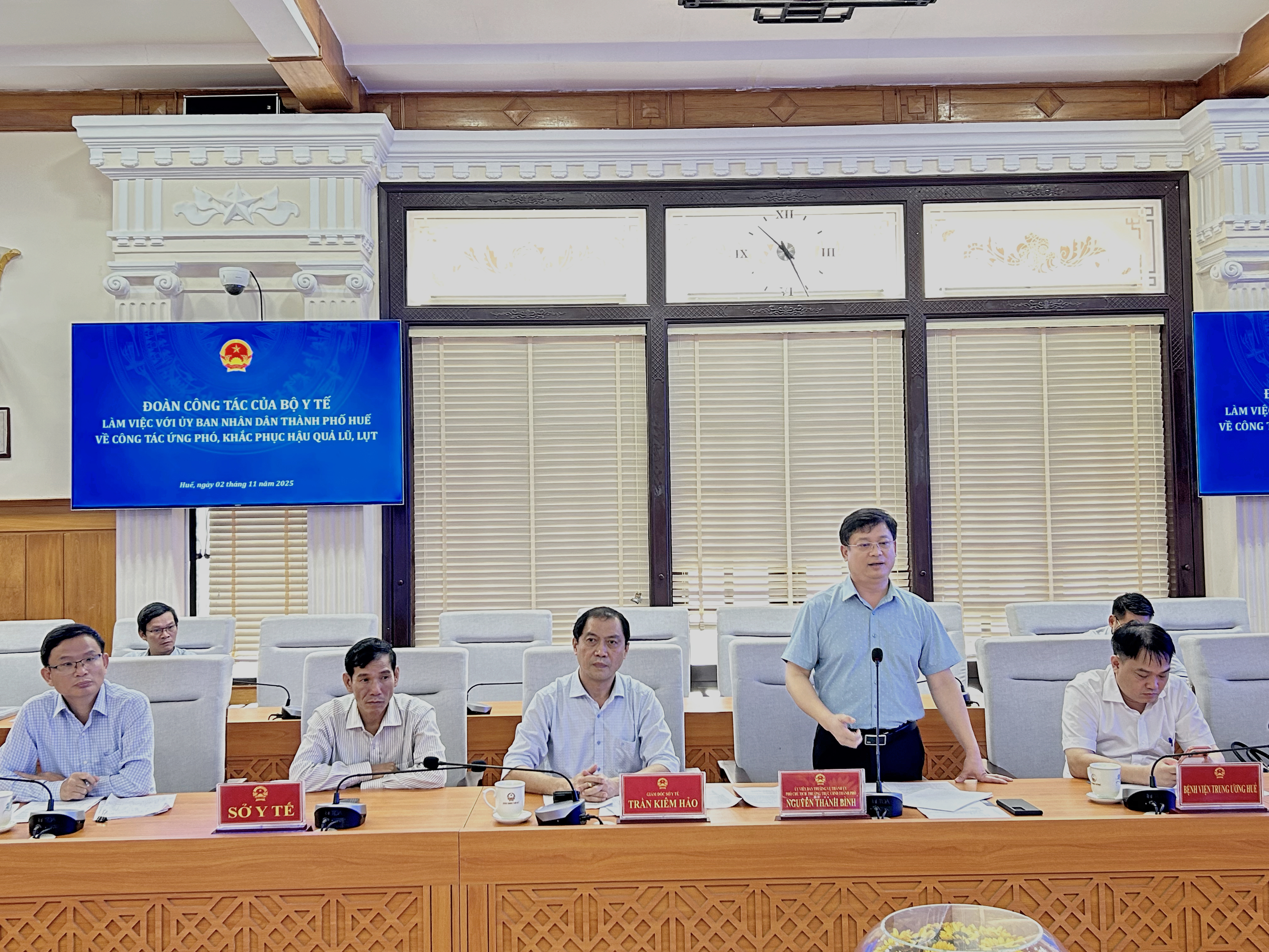 Phát biểu tại buổi làm việc, Thứ trưởng Bộ Y tế Đỗ Xuân Tuyên đánh giá cao tinh thần chủ động, khẩn trương của TP Huế và ngành y tế địa phương trong công tác ứng phó, bảo đảm sức khỏe nhân dân trong mưa lũ.