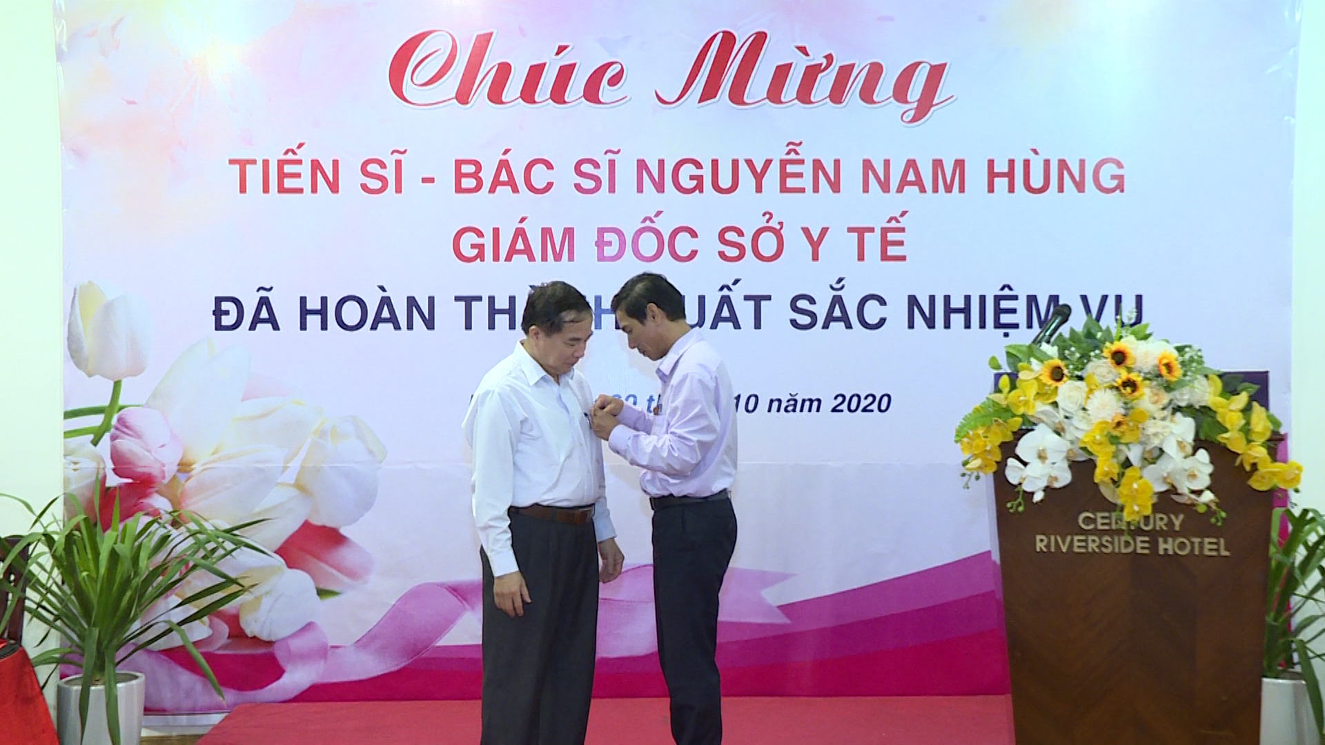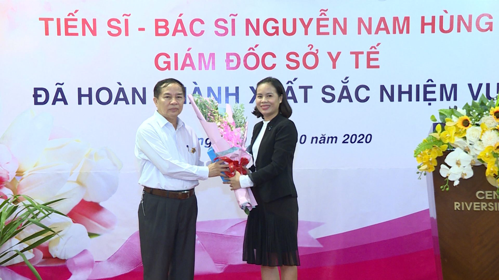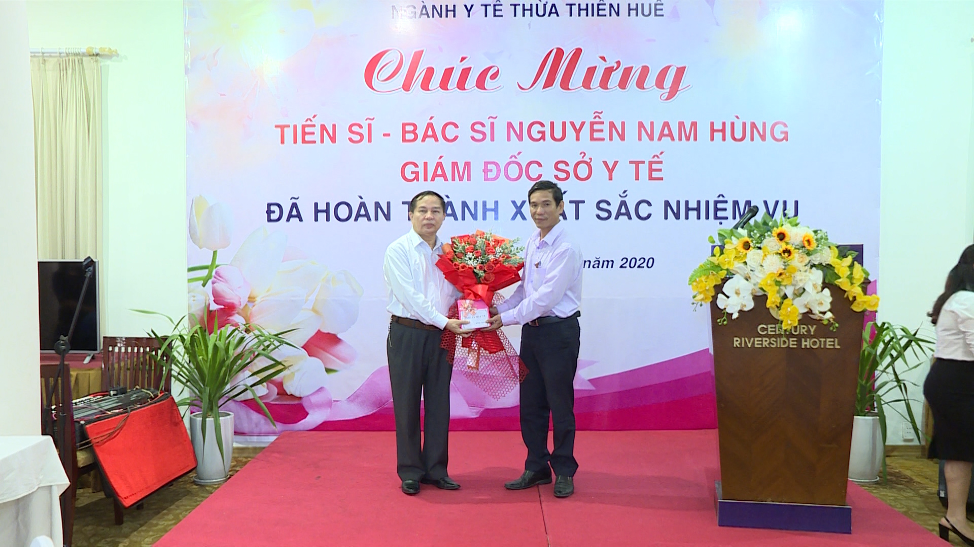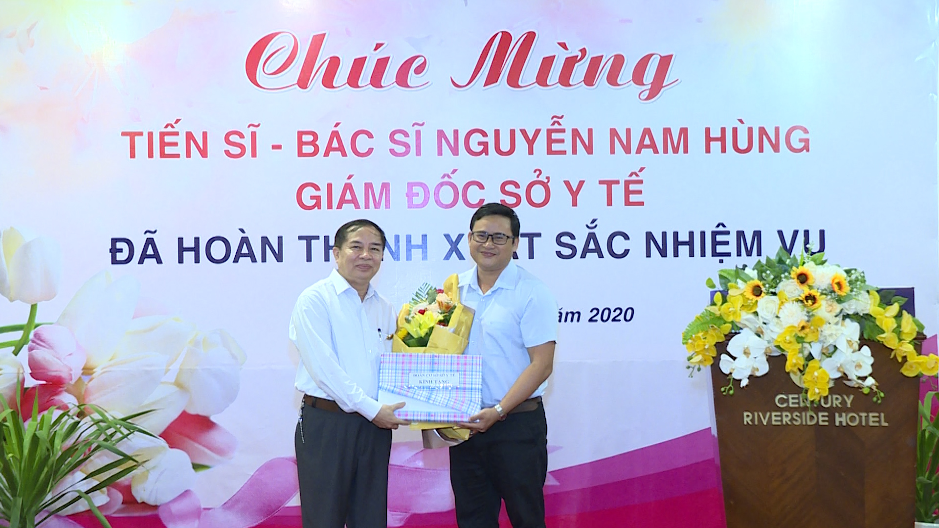 Đại diện Ban Chấp hành Công đoàn ngành và Đoàn Thanh niên Cộng sản Hồ Chí Minh trao hoa TS.BS Nguyễn Nam Hùng trong buổi gặp mặt.