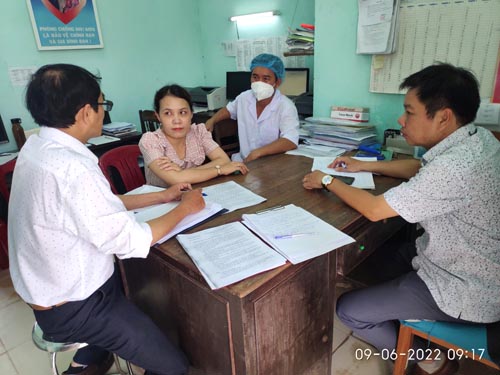 Bs Lê Đình Nhân (bên trái) Sở Y tế đã làm việc với lãnh đạo UBND xã, TYT xã Quảng Thọ