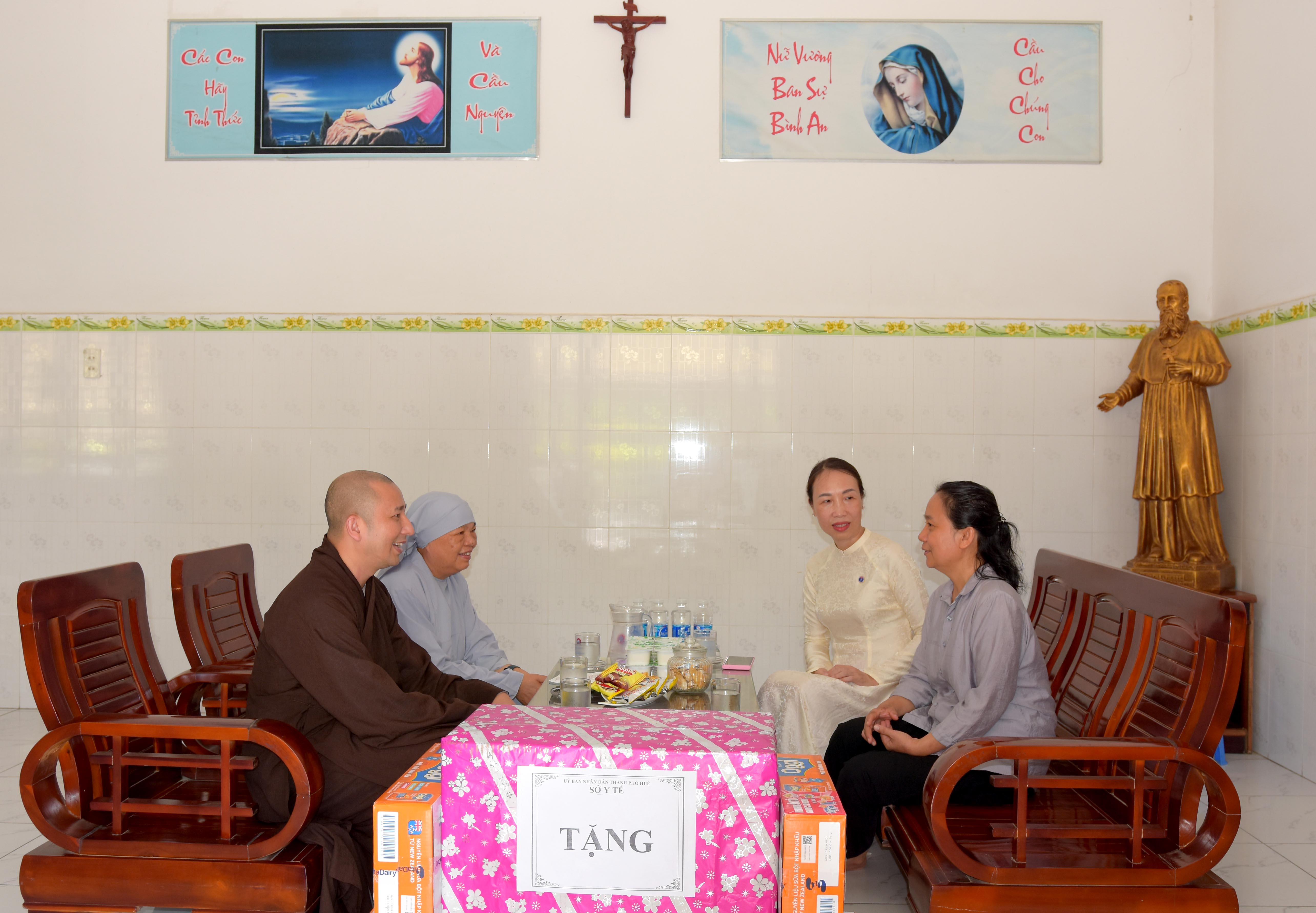 PGS.TS Trần Kiêm Hảo - Giám đốc và ThS Phan Minh Nguyệt - Phó Giám đốc Sở Y tế và Ban Từ thiện xã hội Giáo hội Phật giáo Việt Nam thành phố Huế thăm hỏi, tặng quà cho Trung tâm bảo trợ người khuyết tật Tịnh Trúc Gia, phường Thuỷ Xuân, Tp Huế.