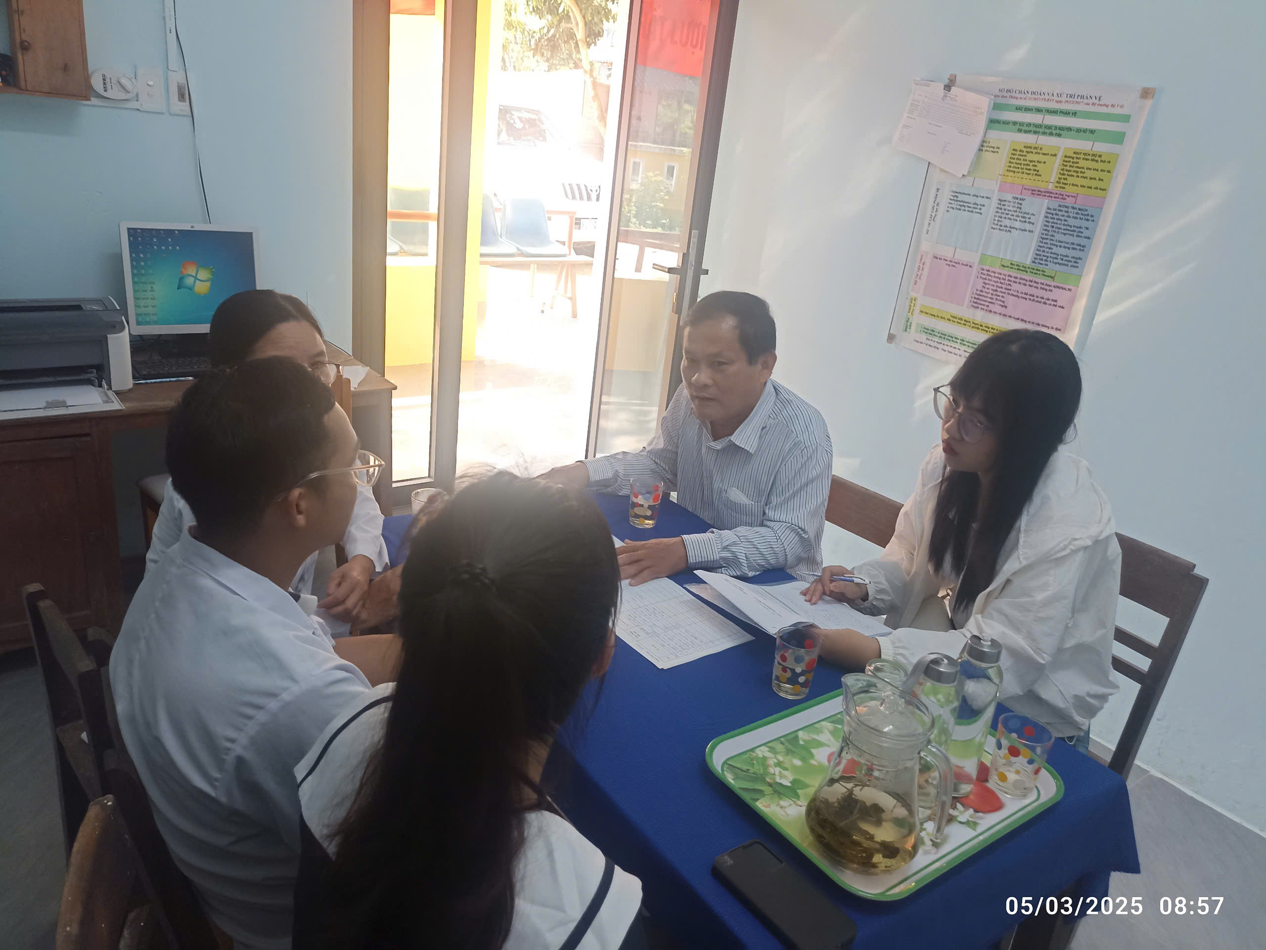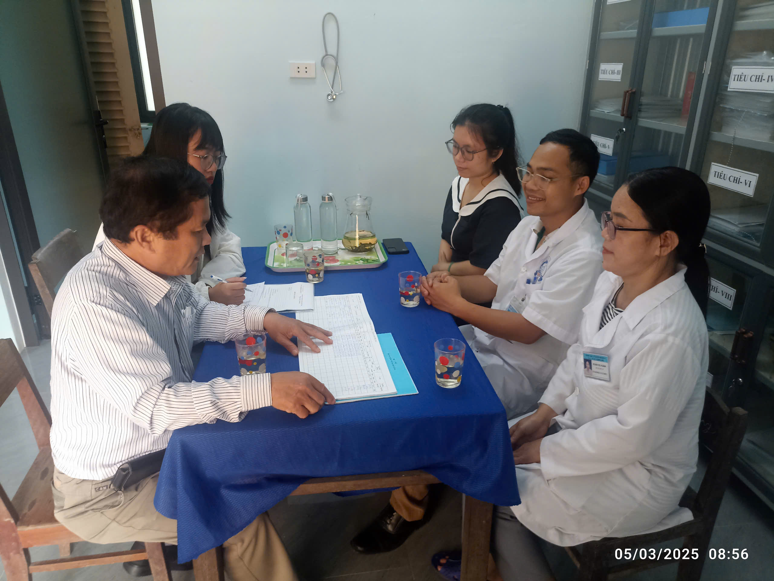 Cán bộ CDC tỉnh trao đổi các nội dung giám sát và kiểm tra công tác TCMR tại TYT xã Hương Hữu.