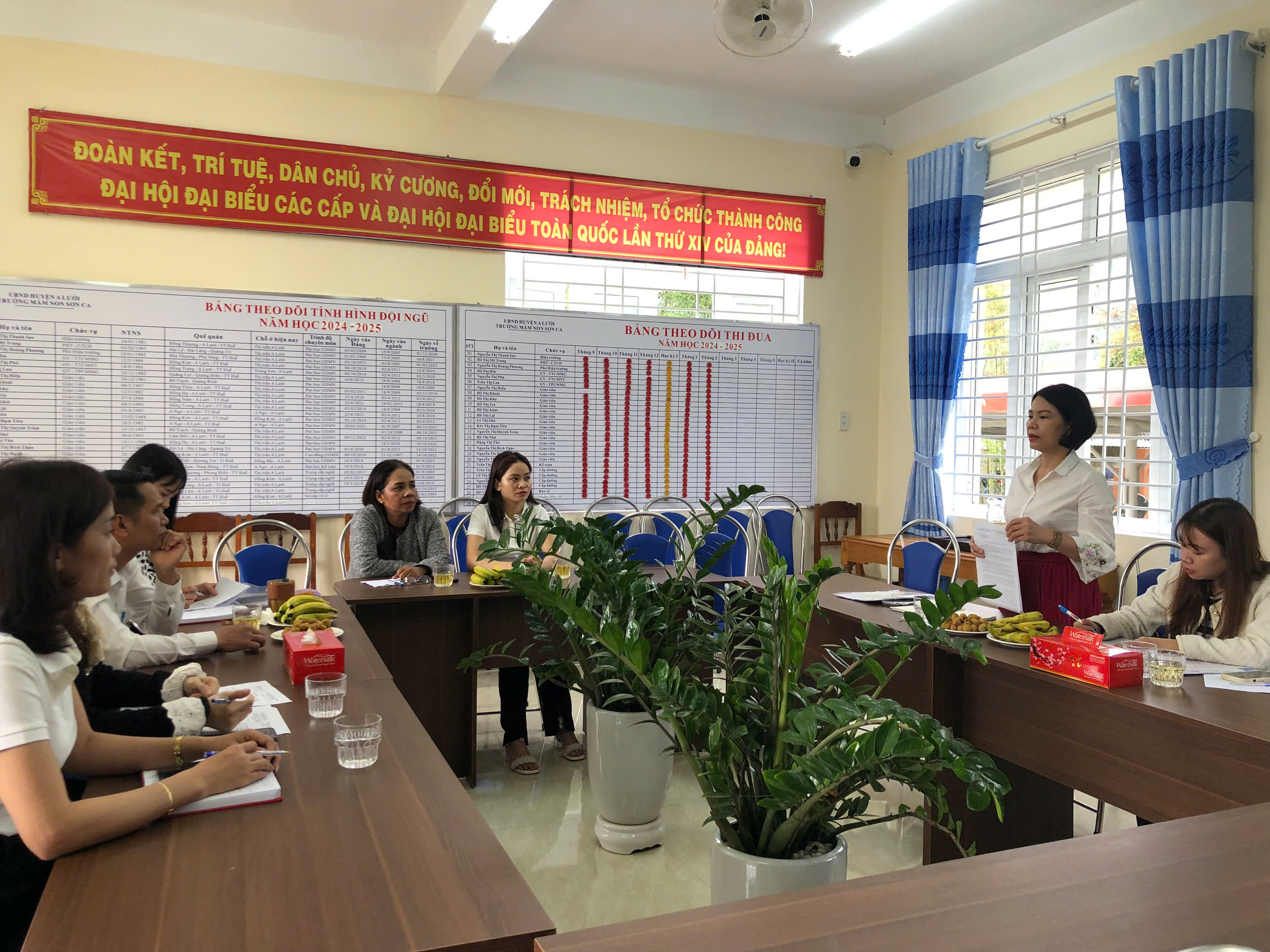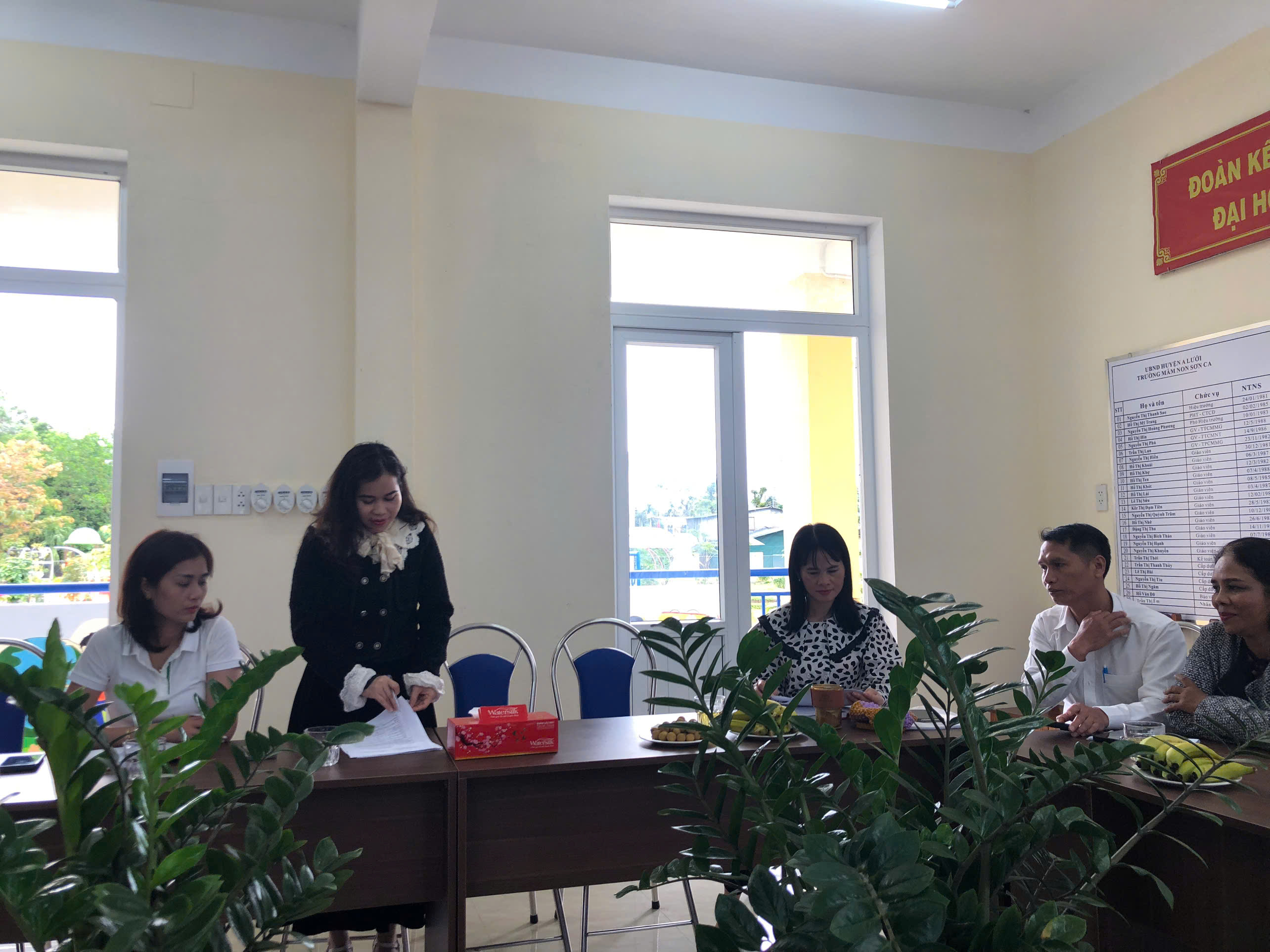 Đại diện Ban giám hiệu trường MN Sơn Ca báo cáo tình hình chung về quá trình thực hiện chương trình sức khỏe dinh dưỡng học đường