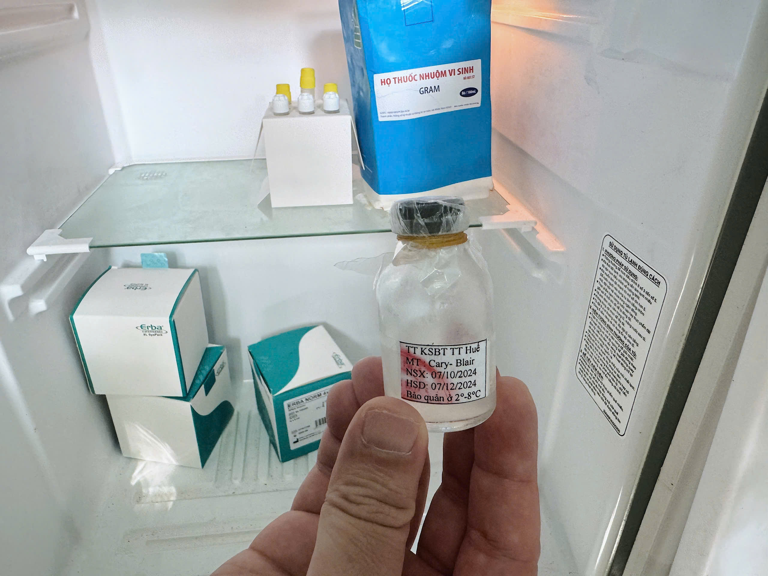- Dụng cụ lấy mẫu được được chuẩn bị đầy đủ. Môi trường vận chuyển vi rút còn hạn sử dụng và được bảo quản đúng nhiệt độ yêu cầu (2 – 80C). Tuy nhiên môi trường Carry blair đã hết hạn sử dụng. Đoàn đã nhắc nhở Khoa XN – TTYT Thành phố liên hệ Khoa XN – CĐHA – TDCN – TTKSBT tỉnh TT Huế để nhận môi trường Carry blair hạn sử dụng mới để phục vụ kịp thời cho công tác lấy mẫu.