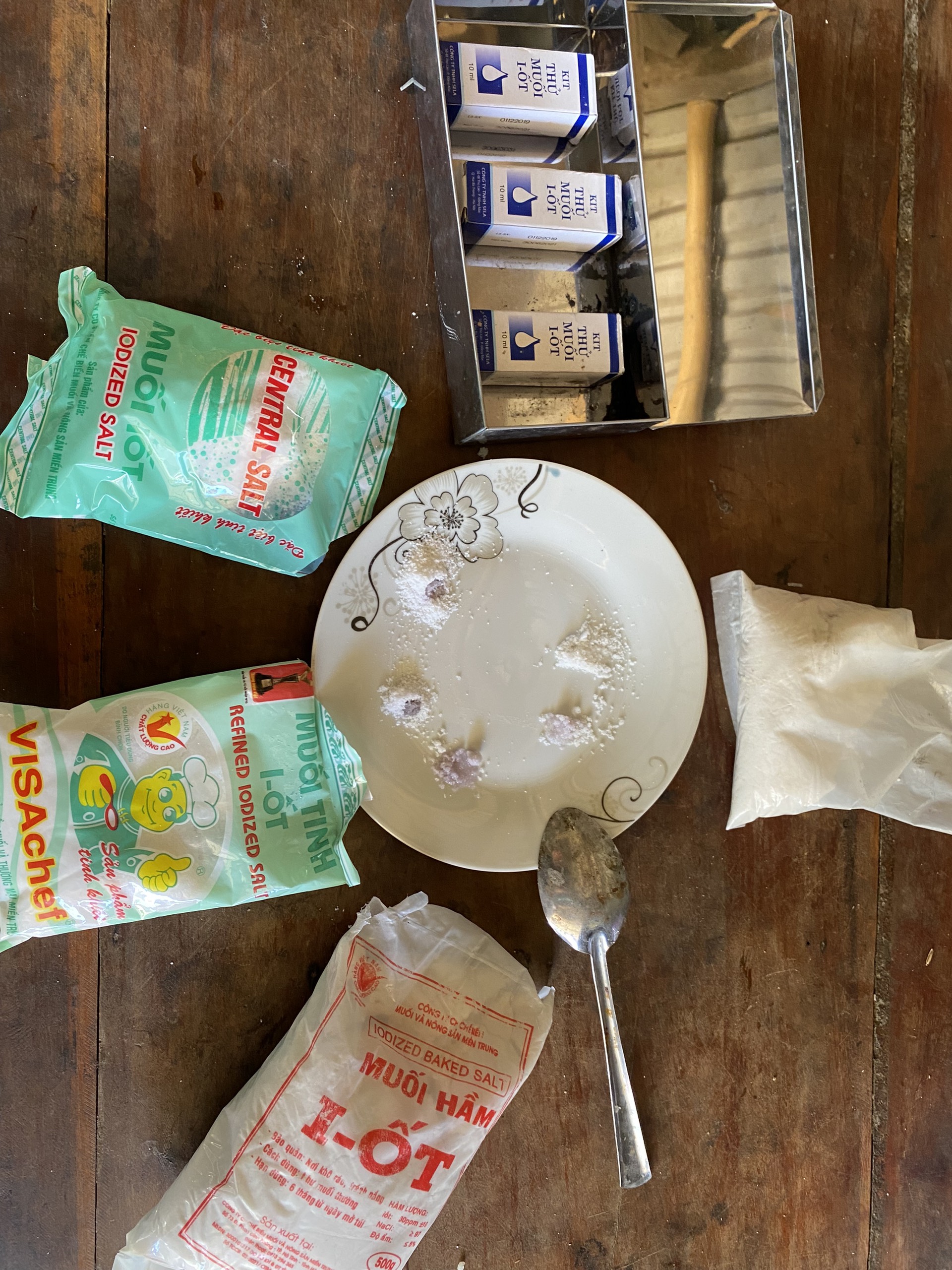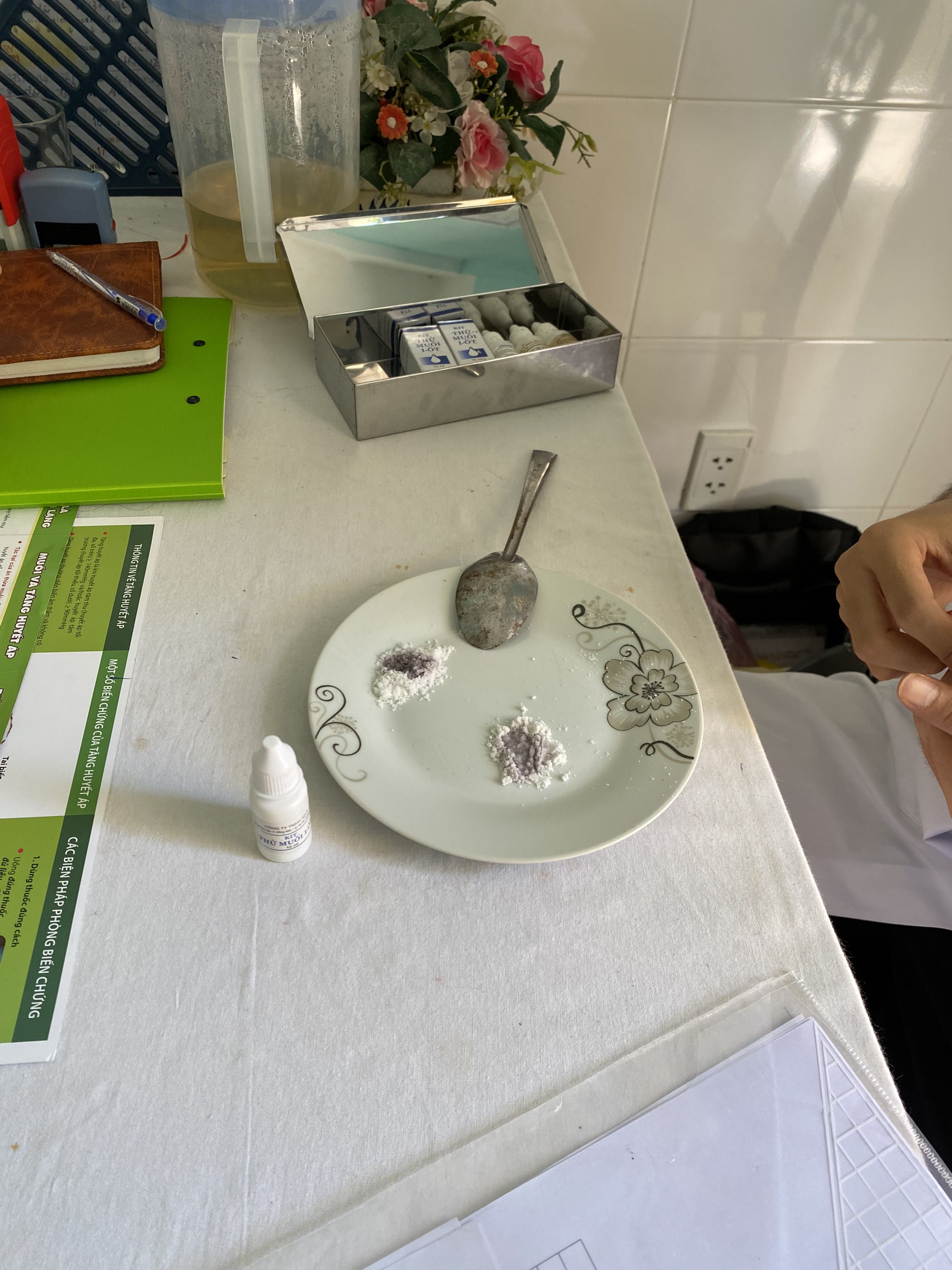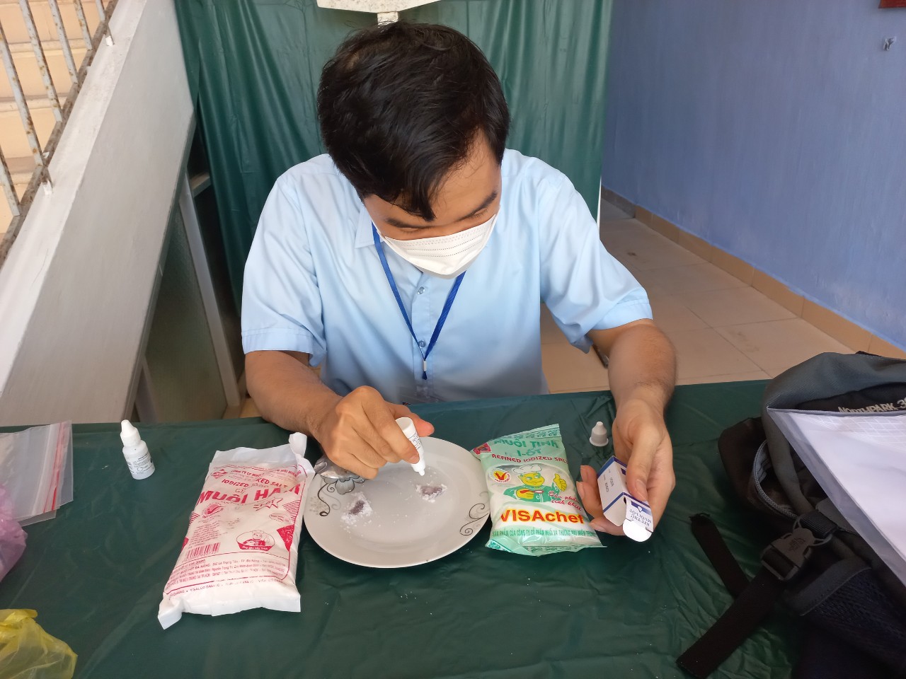 Thực hiện kế hoạch giám sát chất lượng muối và gia vị mặn có chứa I ốt trên địa bàn tỉnh Thừa Thiên Huế, từ ngày 02 đến 04-08-2022, cán bộ khoa PCBKLN-DD đã tiến hành lấy mẫu và kiểm tra chất lượng muối I ốt nhằm phòng chống các rối loạn do thiếu I ốt tại các cơ sở kinh doanh và hộ gia đình trên địa bàn các xã thuộc huyện Phú Lộc, Phong Điền, Nam Đông, A Lưới. Kết quả giám sát cho thấy hầu hết người dân đã sử dụng muối và các gia vị mặn chứa I ốt; các mẫu muối kiểm tra hàm lượng I ốt bằng dung dịch thử đều đạt.