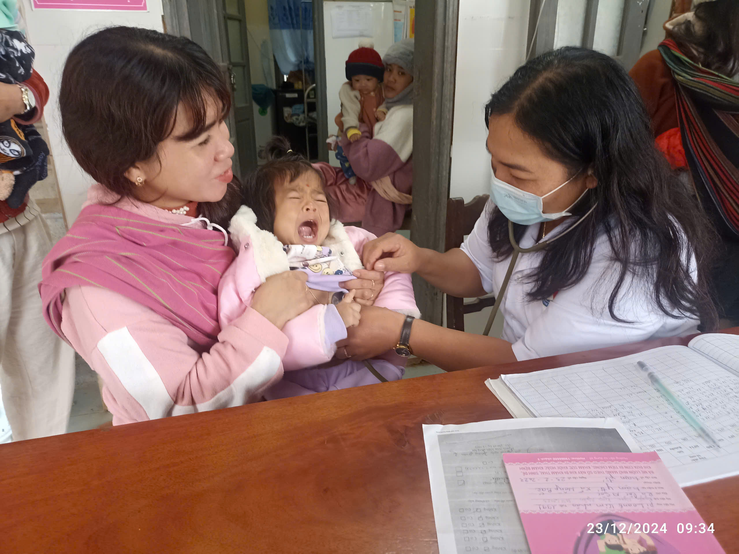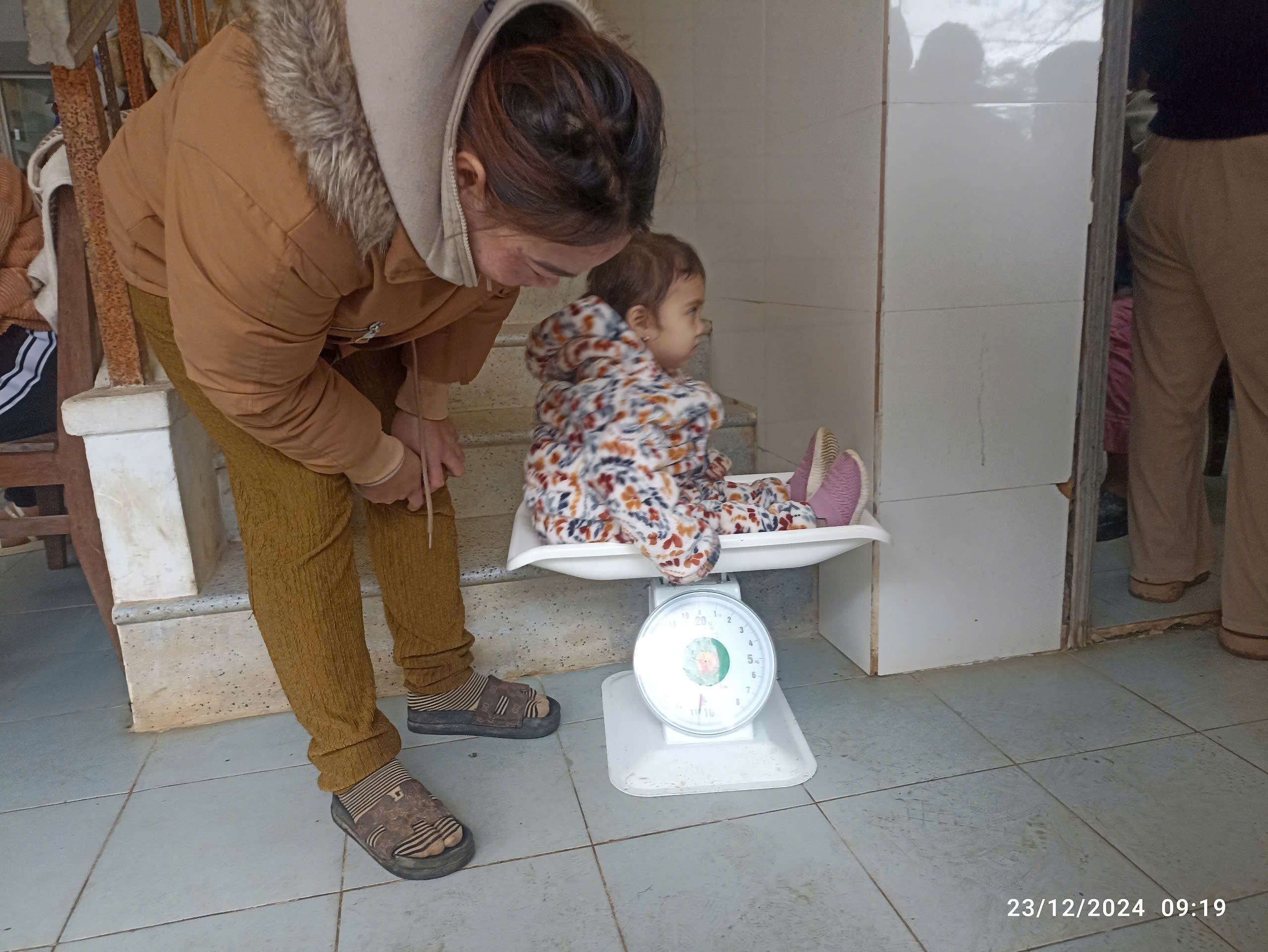 Khám sàng lọc trước tiêm chủng và cân trẻ.