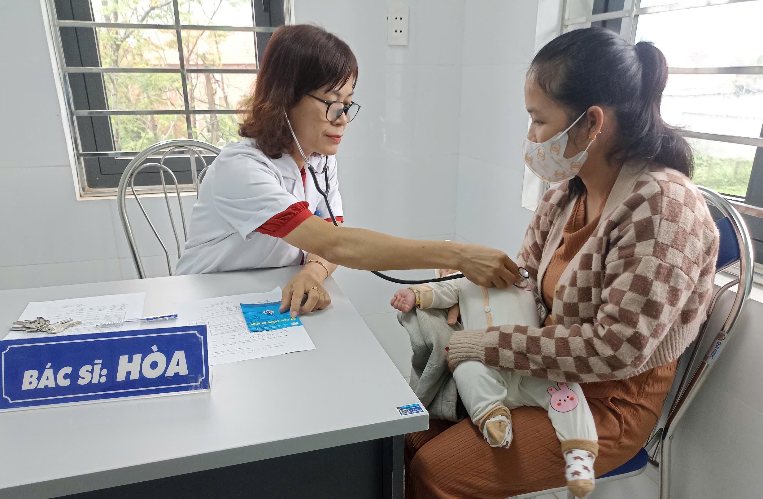 Cân trẻ và khám sàng lọc tại trạm Y tế xã.