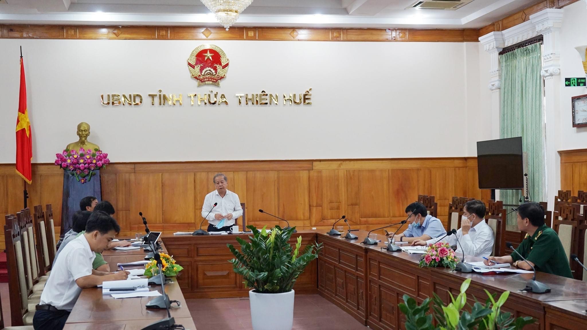 Sáng 29-7-2020, Chủ tịch UBND tỉnh Phan Ngọc Thọ chủ trì cuộc họp giao ban trực tuyến phòng chống dịch Covid-19 cùng với lãnh đạo các Sở, ban, ngành; lãnh đạo Bệnh viện TƯ Huế, Đại học Huế; lãnh đạo các UBND huyện/thị xã/thành phố tại các điểm cầu trên toàn tỉnh. Tham dự tại điểm cầu Sở Y tế có Ban lãnh đạo Sở Y tế cùng các phòng chức năng; các thành viên của 3 tiểu ban (truyền thông, giám sát - Điều trị - Hậu cần) và đại diện lãnh đạo Chi cục ATVSTP, bệnh viện Da liễu, bệnh viện Lao - bệnh phổi.