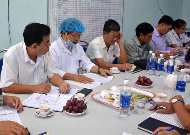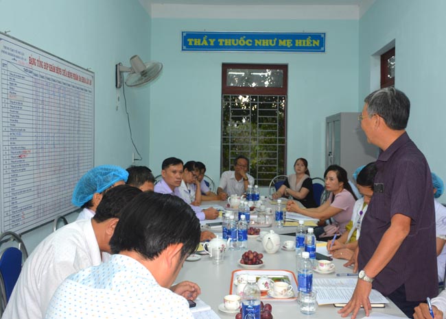 BSCKI Nguyễn Hồng Phong - Trưởng PKĐK Lộc An (mặc áo bờ-lu) báo cáo tình hình hoạt động tại phòng khám.