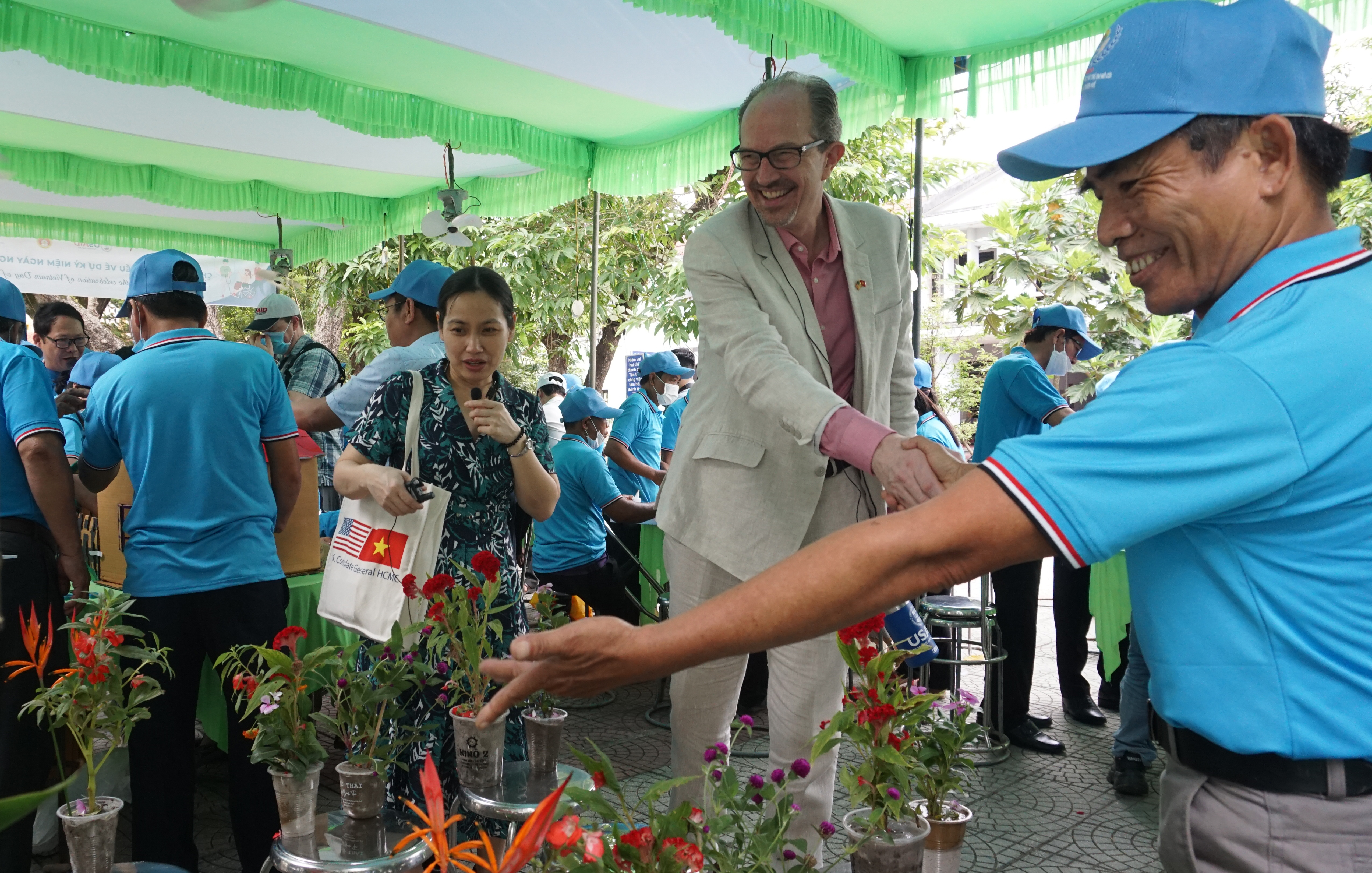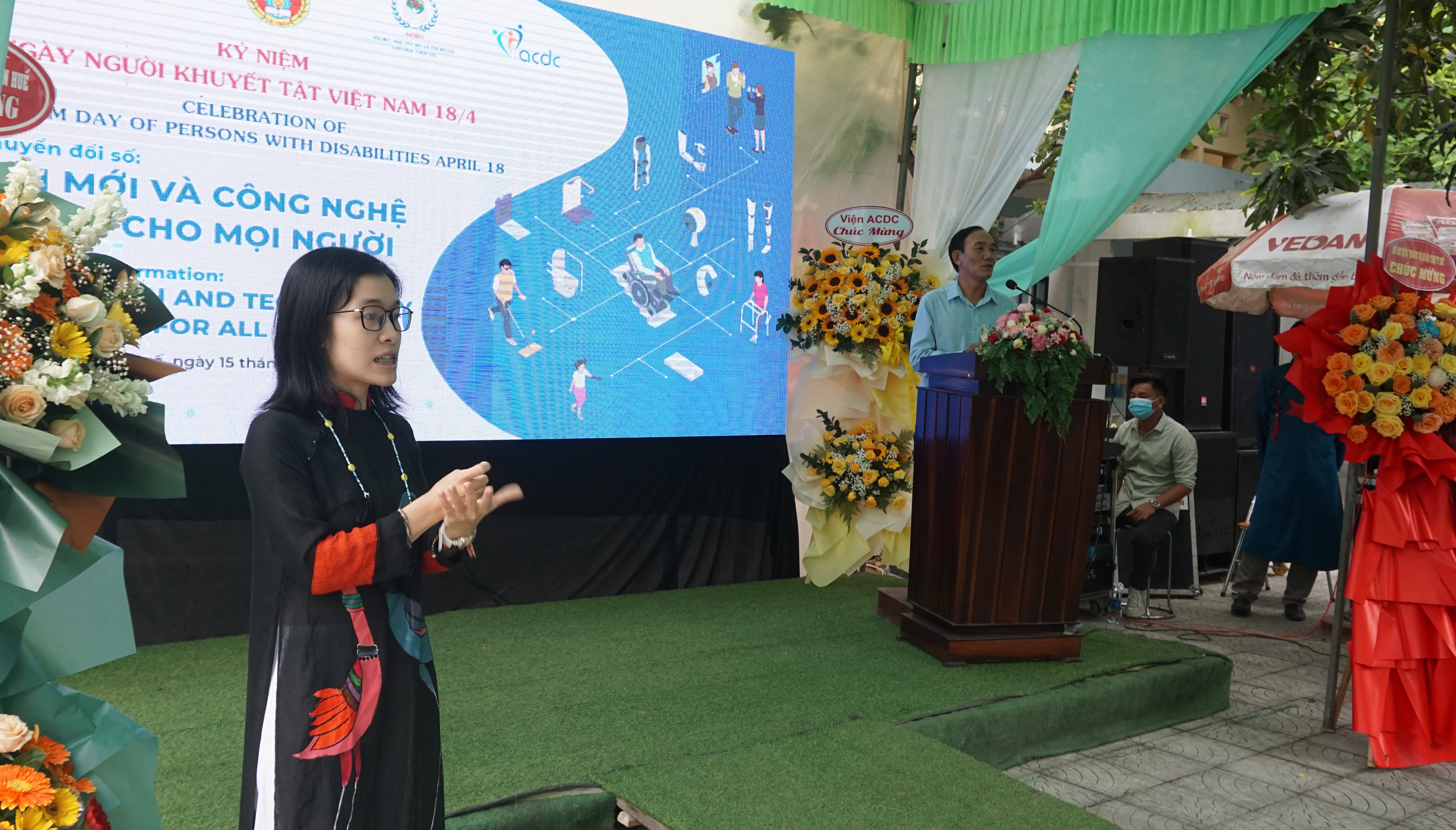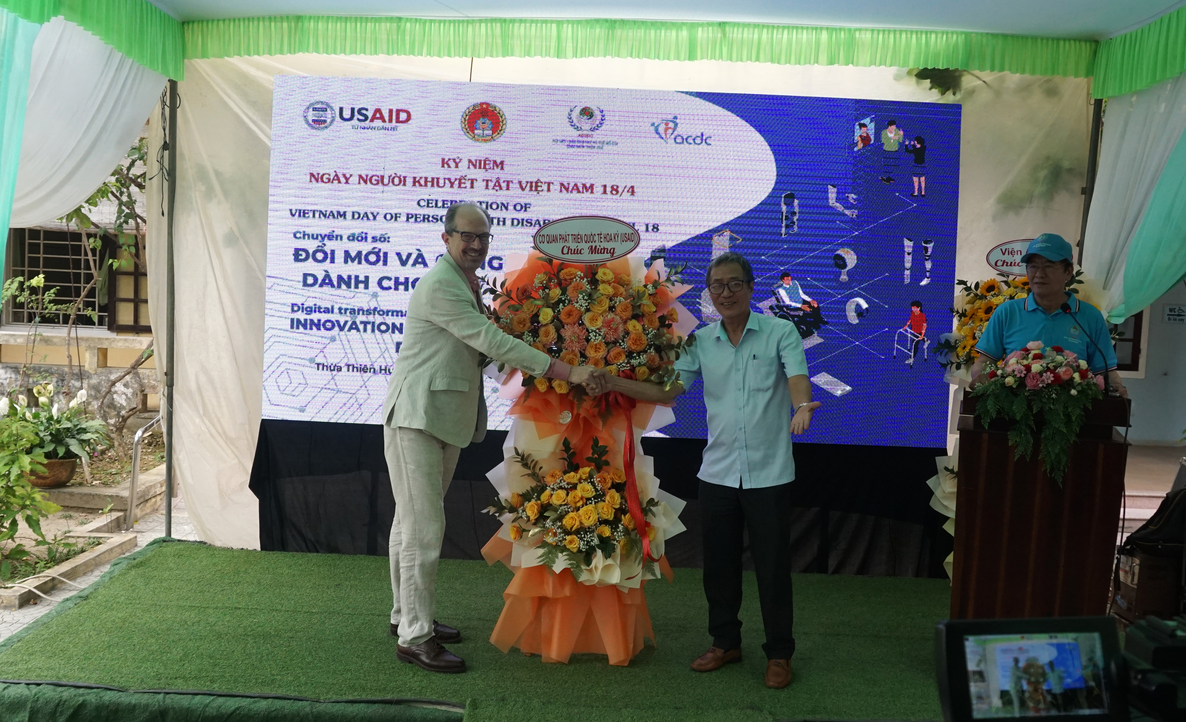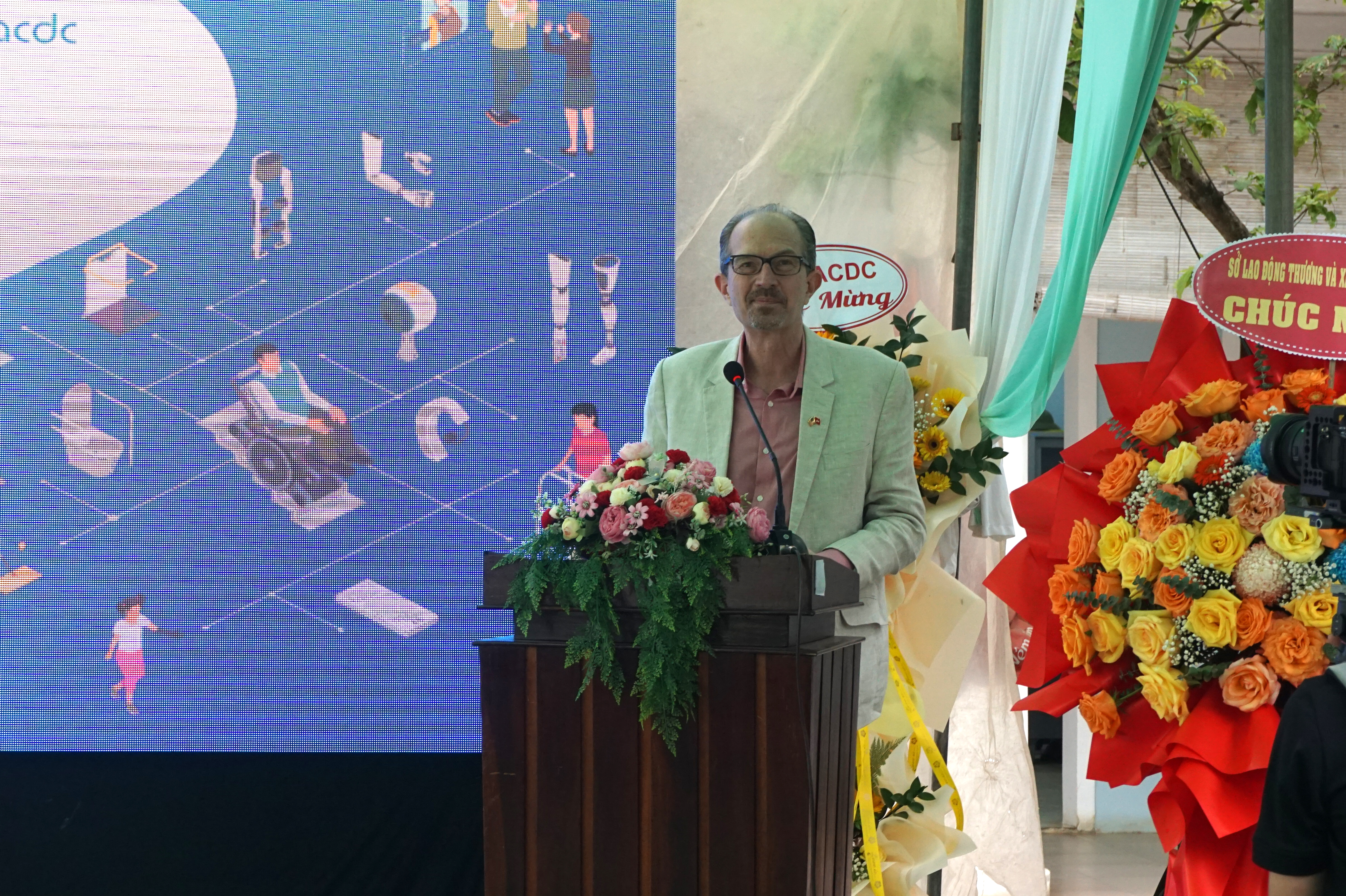 Ông Hồ Dần - Phó Giám đốc sở LĐTB - XH và Ông Anthony Alexander Kolb - Phó Giám đốc Phòng hàn gắn và Phát triển hòa nhập USAID phát biểu chào mừng và tri ân các cá nhân có những đóng góp cho hoạt động NKT.