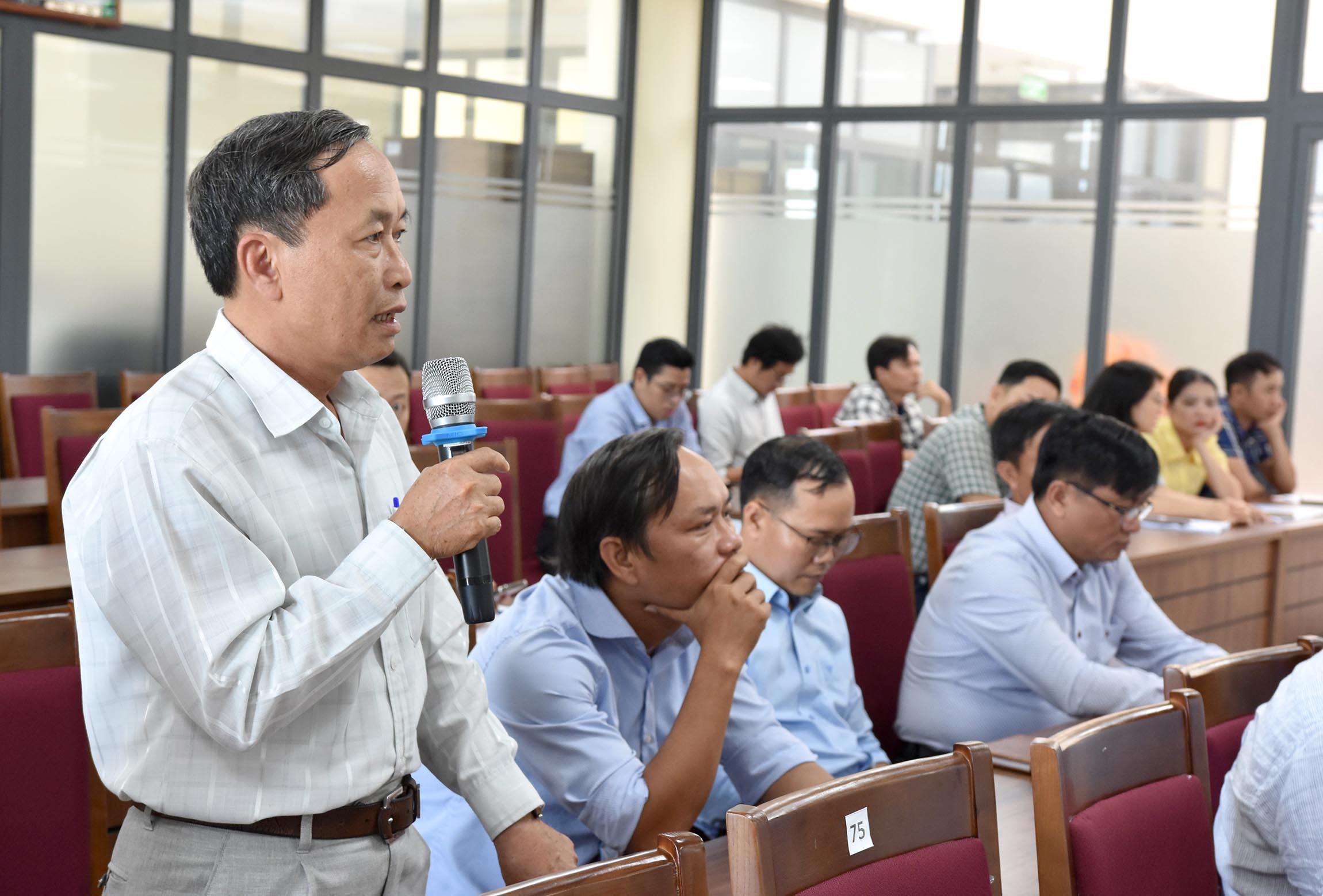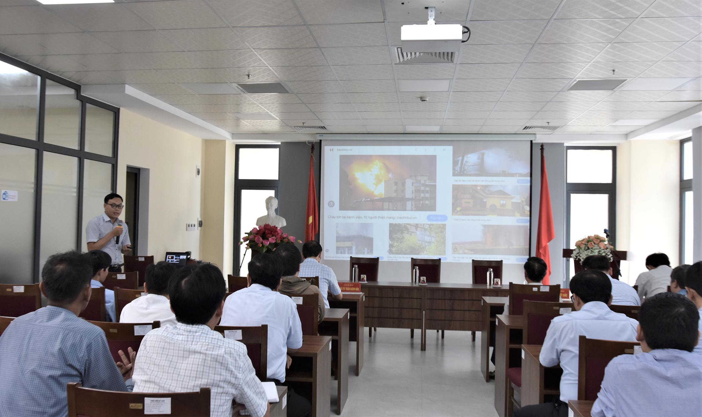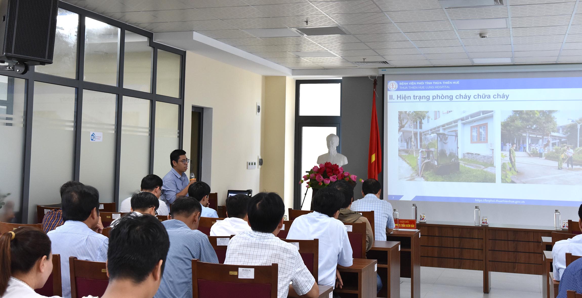 ThS.BS Phan Nguyễn Văn Triều báo cáo thực trạng và việc thực hiện công tác PCCC tại 25 đơn vị thuộc Sở Y tế.