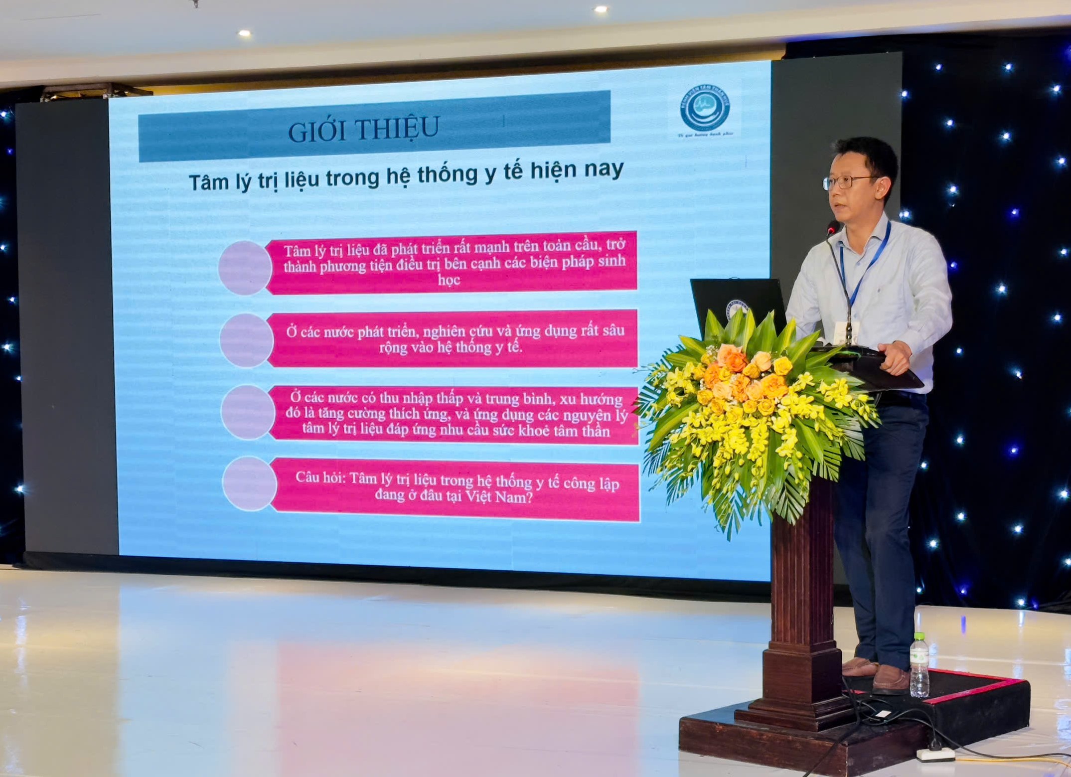 ThS.BS. Hồ Dũng - Giám đốc bệnh viện Tâm thần Huế báo cáo đề tài "Hiện trạng thực hành và nhu cầu phát triển tâm lý trị liệu tại một số bệnh viện chuyên khoa Tâm thần ở Miền Trung Việt Nam".