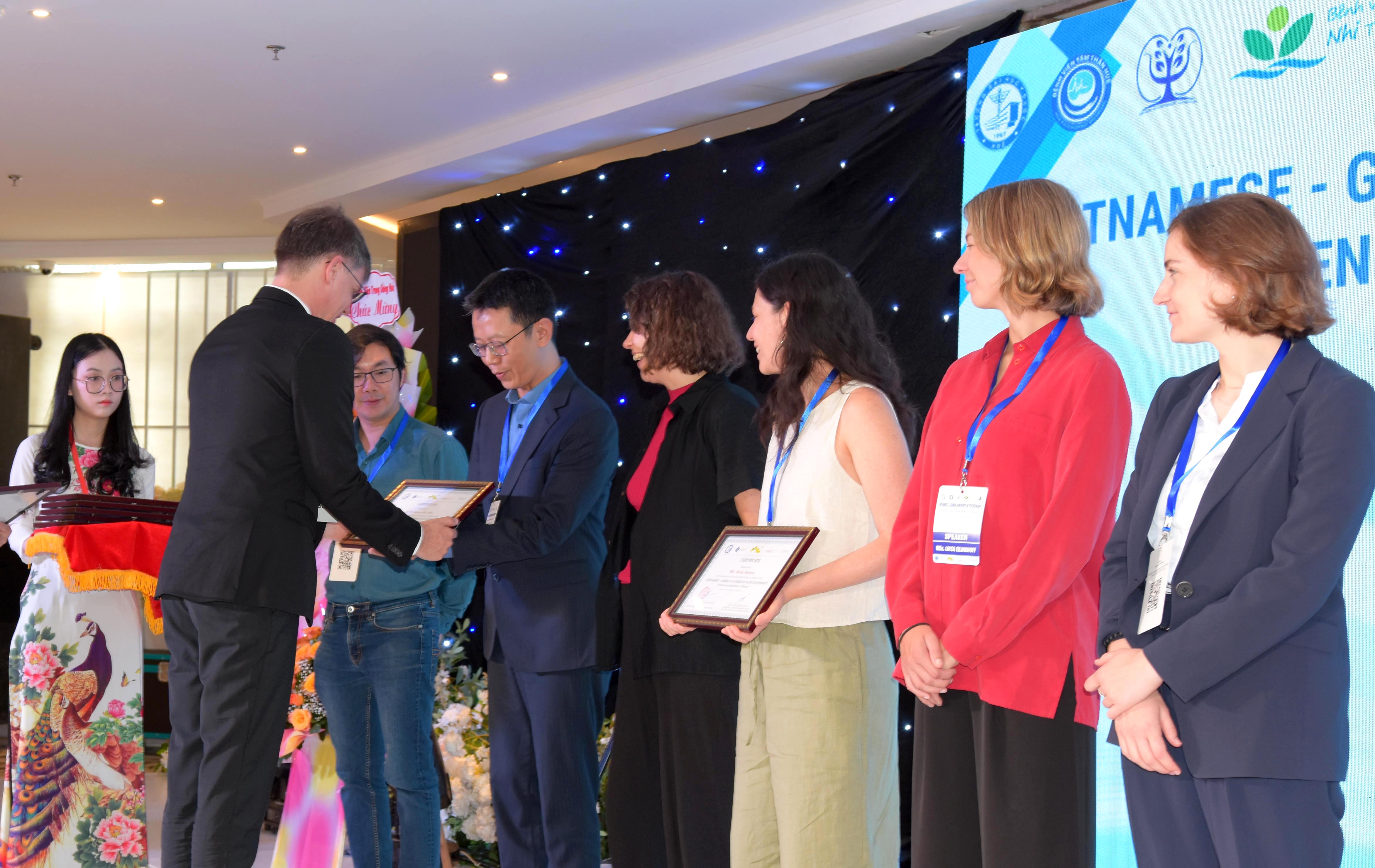 Ban Tổ chức trao Giấy chứng nhận cho các báo cáo viên và chụp ảnh lưu niệm cùng các đại biểu.