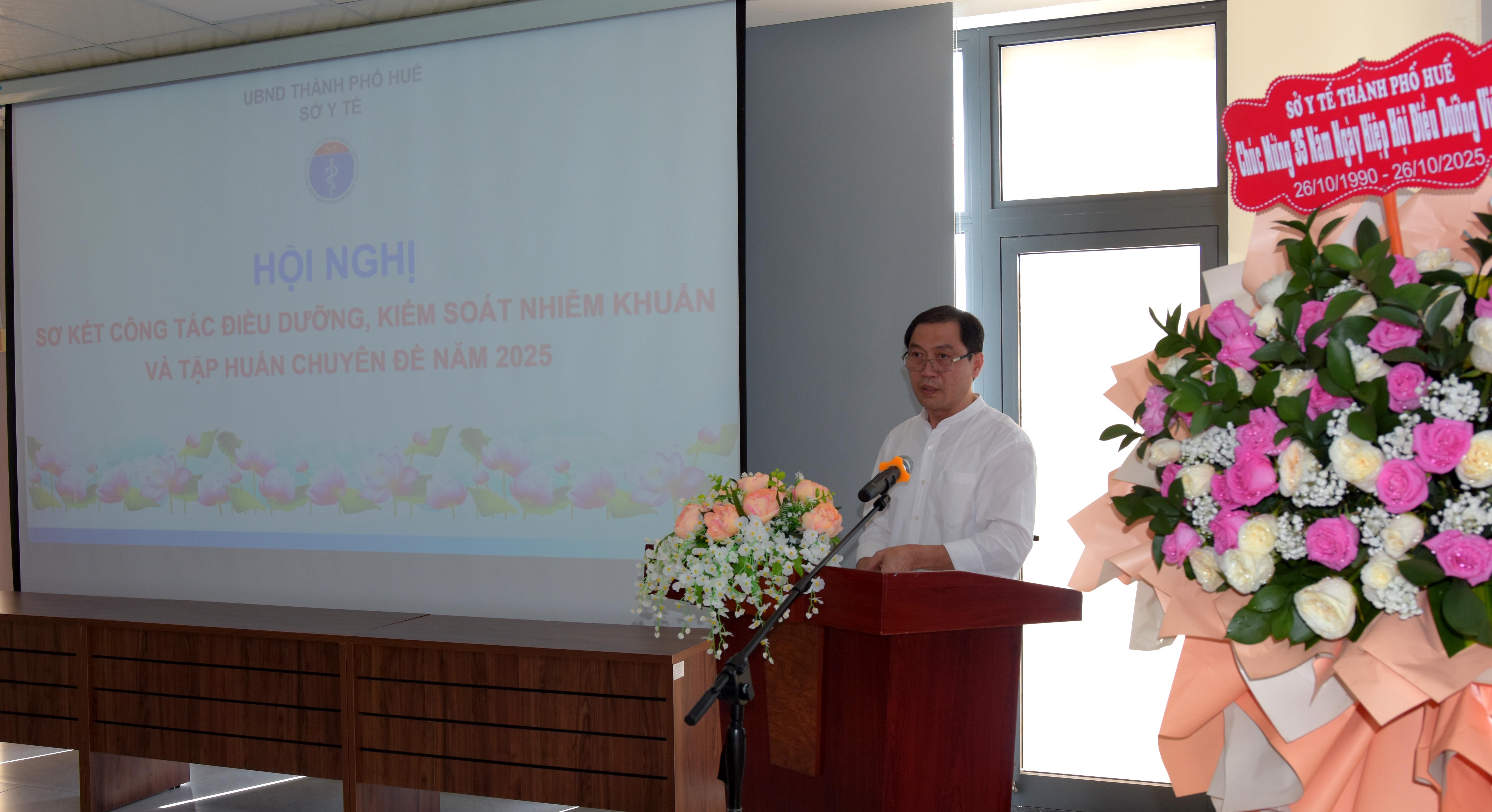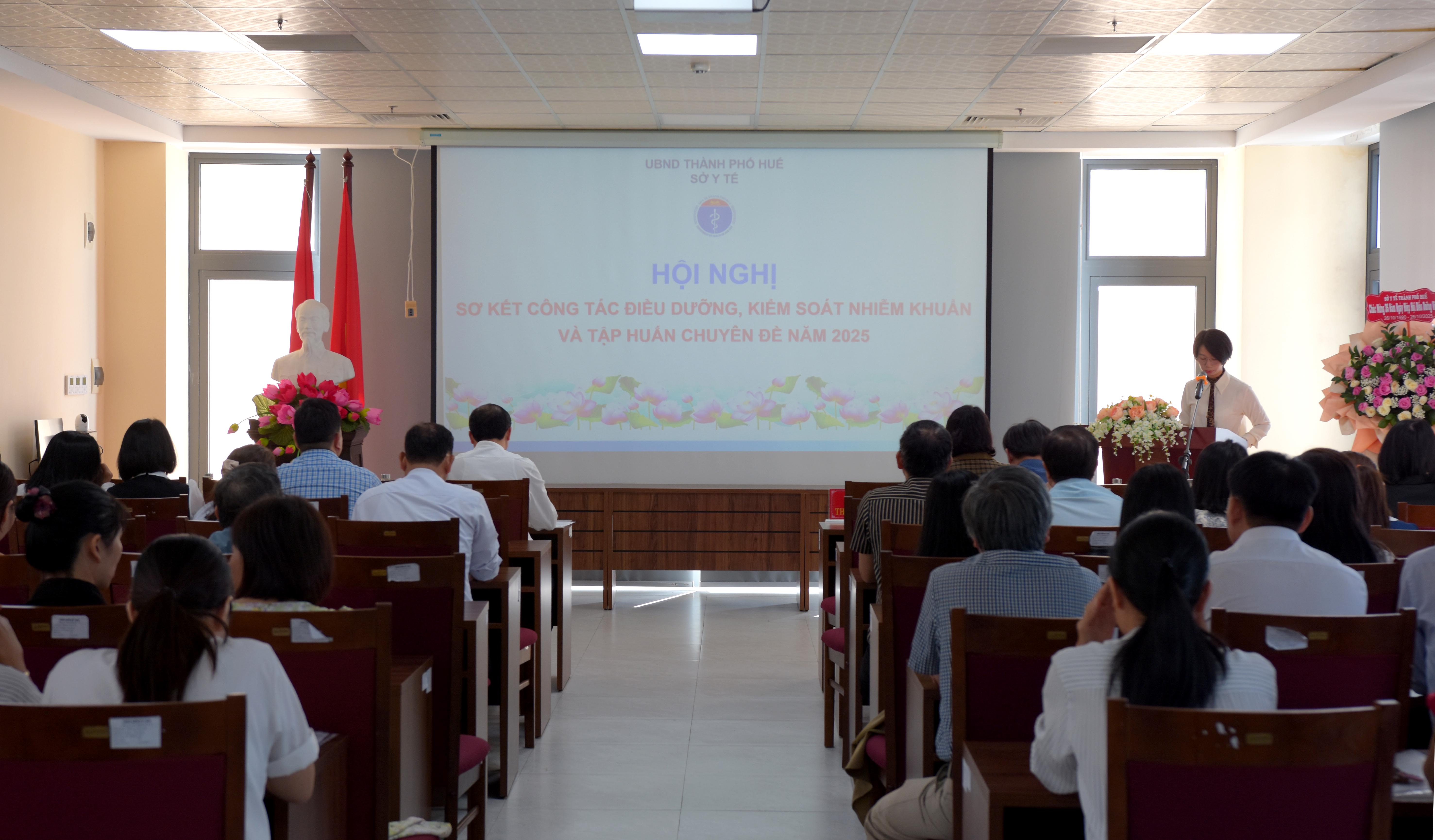 Ngày 14/10, Sở Y tế thành phố Huế, tổ chức Hội nghị sơ kết công tác Điều dưỡng, Kiểm soát nhiễm khuẩn và tập huấn chuyên đề năm 2025, PGS.TS.BS. Trần Kiêm Hảo - Thành ủy viên, Giám đốc Sở Y tế chủ trì hội nghị. Đại diện Hội Kiểm soát nhiễm khuẩn thành phố Huế; Phòng Nghiệp Vụ Y và cán bộ liên quan của Sở Y tế; Đại diện lãnh đạo, trưởng/phó và cán bộ phụ trách công tác Điều dưỡng các TTYT; Trưởng Điều dưỡng/Hộ sinh/KTY các khoa BV đa khoa/chuyên khoa, BV ngoài công lập và cán bộ phụ trách công tác Kiểm soát nhiễm khuẩn của các đơn vị cùng tham dự hội nghị.