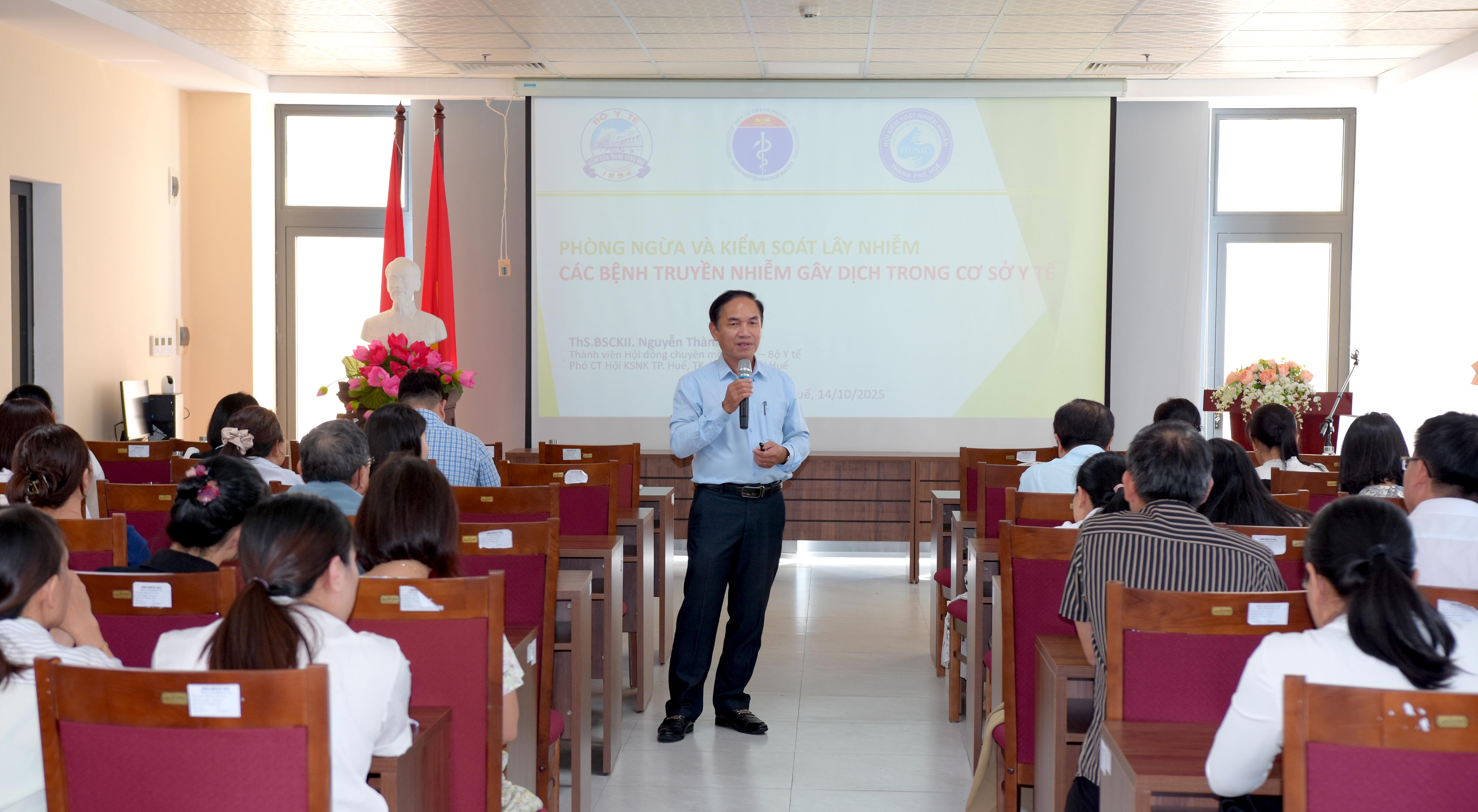 ThS.BSCKII Nguyễn Thành Huy - Thành viên Hội đồng Chuyên môn KSNK Bộ Y tế - Phó Chủ tịch Hội KSNK thành phố Huế, tập huấn các nội dung về Phòng ngừa và kiểm soát lây nhiễm các bệnh truyền nhiễm gây dịch trong cơ sở y tế.