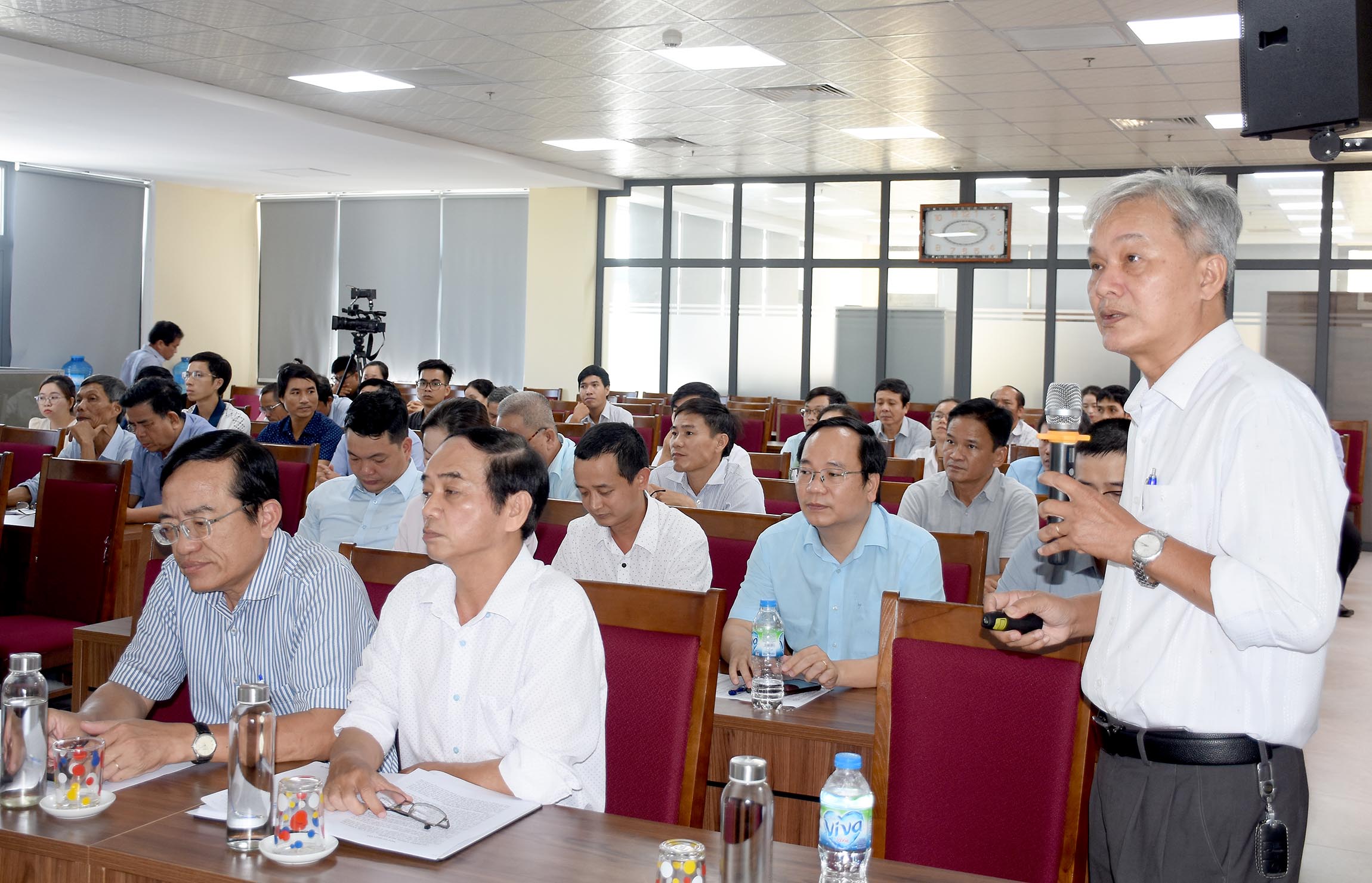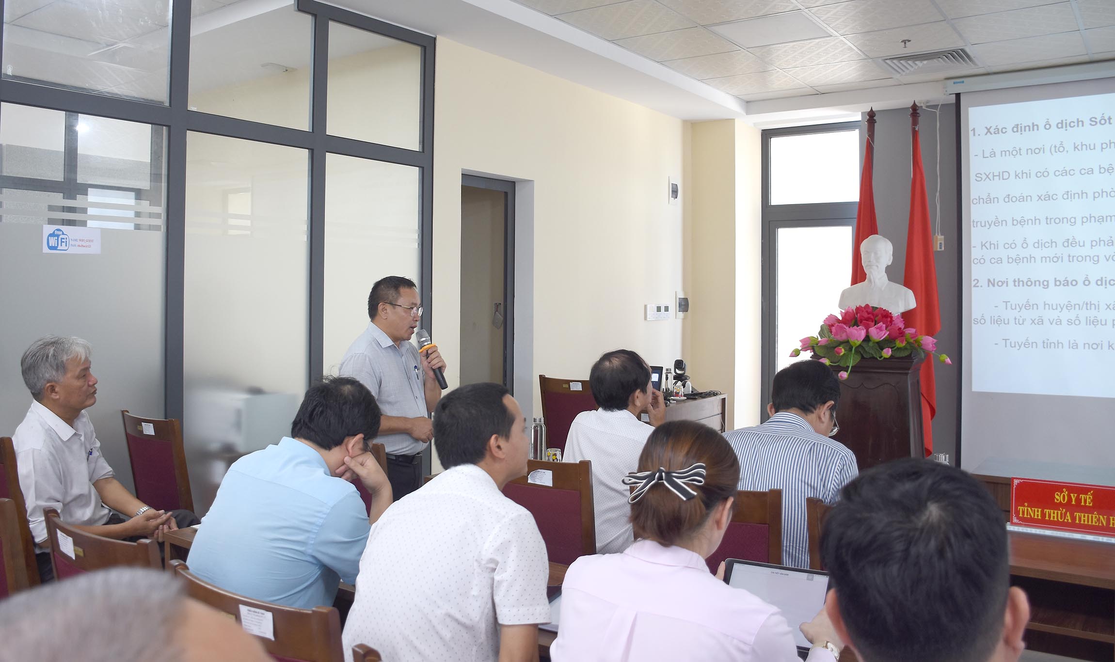 BSCKI Lê Văn Sanh - Trưởng khoa và BSCKI Nguyễn Minh Việt - Phó trưởng khoa Phòng chống bệnh truyền nhiễm - Ký sinh trùng côn trùng báo cáo hoạt động phòng chống dịch bệnh, công tác tiêm chủng mở rộng và trình bày Quy trình giám sát, điều tra, xử lý ổ dịch.