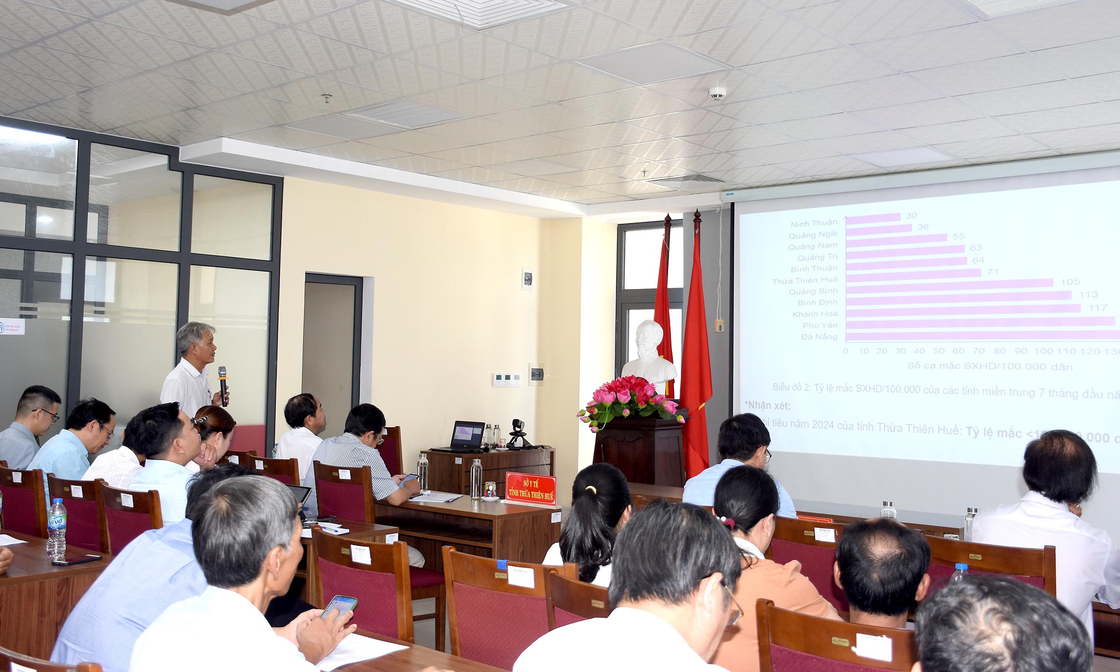 Theo báo cáo trong 7 tháng đầu năm 2024 tỉnh Thừa Thiên Huế phát hiện trên 800 ca SXH (riêng thành phố Huế có 543 ca), trong đó có 8 ca lâm sàng, 12 ca ngoại lai, 01 ca tử vong; Bệnh Tay chân miệng: 72 ca, 1 ca xác định; Sốt rét ngoại lai: 03 ca từ nước ngoài về; Liên cầu lợn và Whitemore mỗi bệnh 01 ca. Tổ chức tẩy giun cho gần 106.500 em học sinh ở 255 trường Tiểu học, đạt 99%. Phun hoá chất chủ động phòng chống SXH bảo vệ cho trên 35.500 hộ gia đình, 25 trường học/cơ quan ở 44 xã/phường/thị trấn. Cung cấp đảm bảo mỗi xã/phường/thị trấn có cơ số hóa chất chống dịch gồm 1 lít hóa chất; 2kg Cloramin B. So cùng kỳ năm trước chương trình TCMR chưa đạt yêu cầu, do tình trạng cung ứng vaccin không đầy đủ nên tỷ lệ tiêm chủng cho trẻ dưới 1 tuổi mới đạt 42,6%; tiêm phòng Uốn ván cho phụ nữ có thai đạt 40,5%.