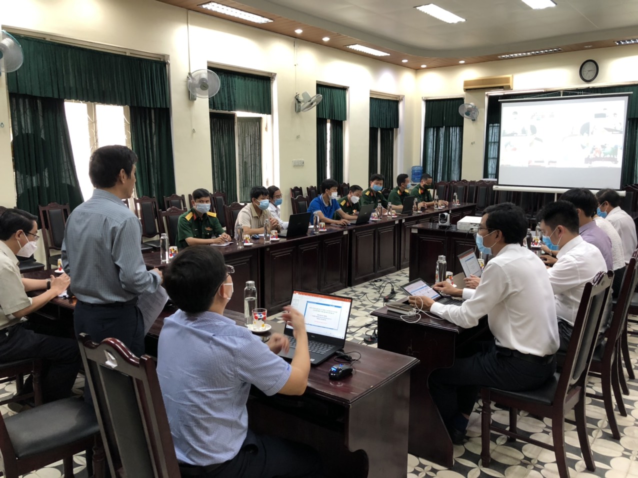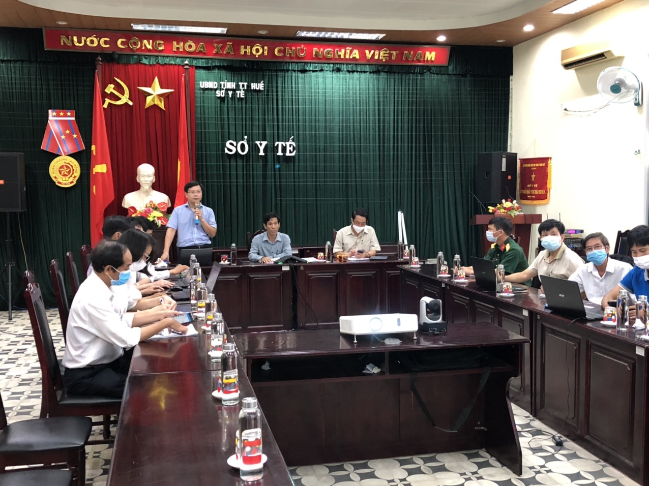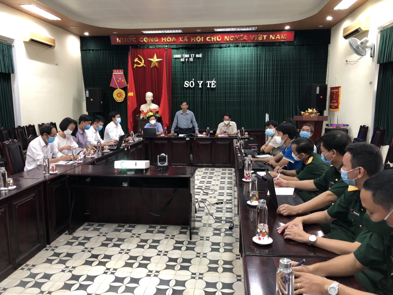 Chủ trì tại điểm cầu Sở Y tế có ông Lê Viết Bắc- Phó Giám đốc Sở Y tế, cùng tham dự có phòng Nghiệp vụ Y, Trung tâm Giám sát Điều hành đô thị thông minh, Trung tâm Kiểm soát bệnh tật, Bộ Chỉ huy Quân sự tỉnh, cán bộ các khung cách ly tập trung; và các điểm cầu của 09 TTYT huyện/thị xã/thành phố, điểm cầu Bệnh viện Hương Sơ (Phổi-Da Liễu) Bệnh viện Bình Điền, Bệnh viện Điều trị COVID-19 Chân Mây,…