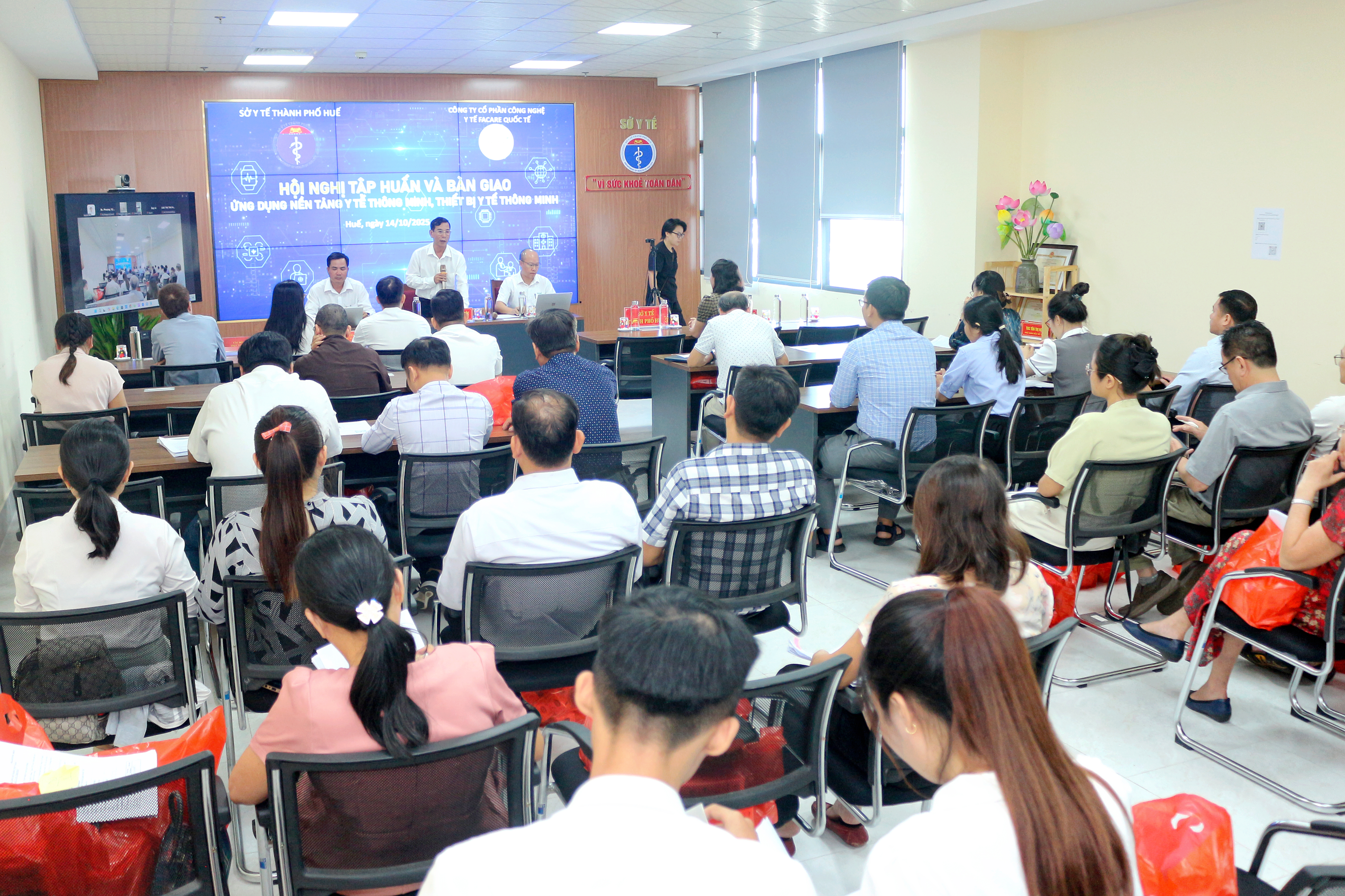 Sáng ngày 14/10/2025, tại Hội trường Sở Y tế thành phố Huế, Sở Y tế tổ chức Hội nghị tập huấn và bàn giao ứng dụng nền tảng y tế thông minh và thiết bị y tế thông minh (IoMT) cho các đơn vị y tế trên địa bàn. Tham dự hội nghị có DSCKI Lê Viết Bắc – Phó Giám đốc Sở Y tế thành phố Huế, đại diện Công ty Cổ phần Công nghệ Y tế FaCare Quốc tế, cùng lãnh đạo, nhân viên các đơn vị y tế, trung tâm y tế, bệnh viện và phòng khám đa khoa tư nhân trên địa bàn thành phố, cùng các điểm cầu trực tuyến trên địa bàn.