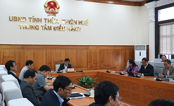 Chủ tịch UBND tỉnh Nguyễn Văn Phương và đại diện lãnh đạo các sở, Phòng/Ban của tỉnh, các đơn vị tại điểm cầu UBND tỉnh.