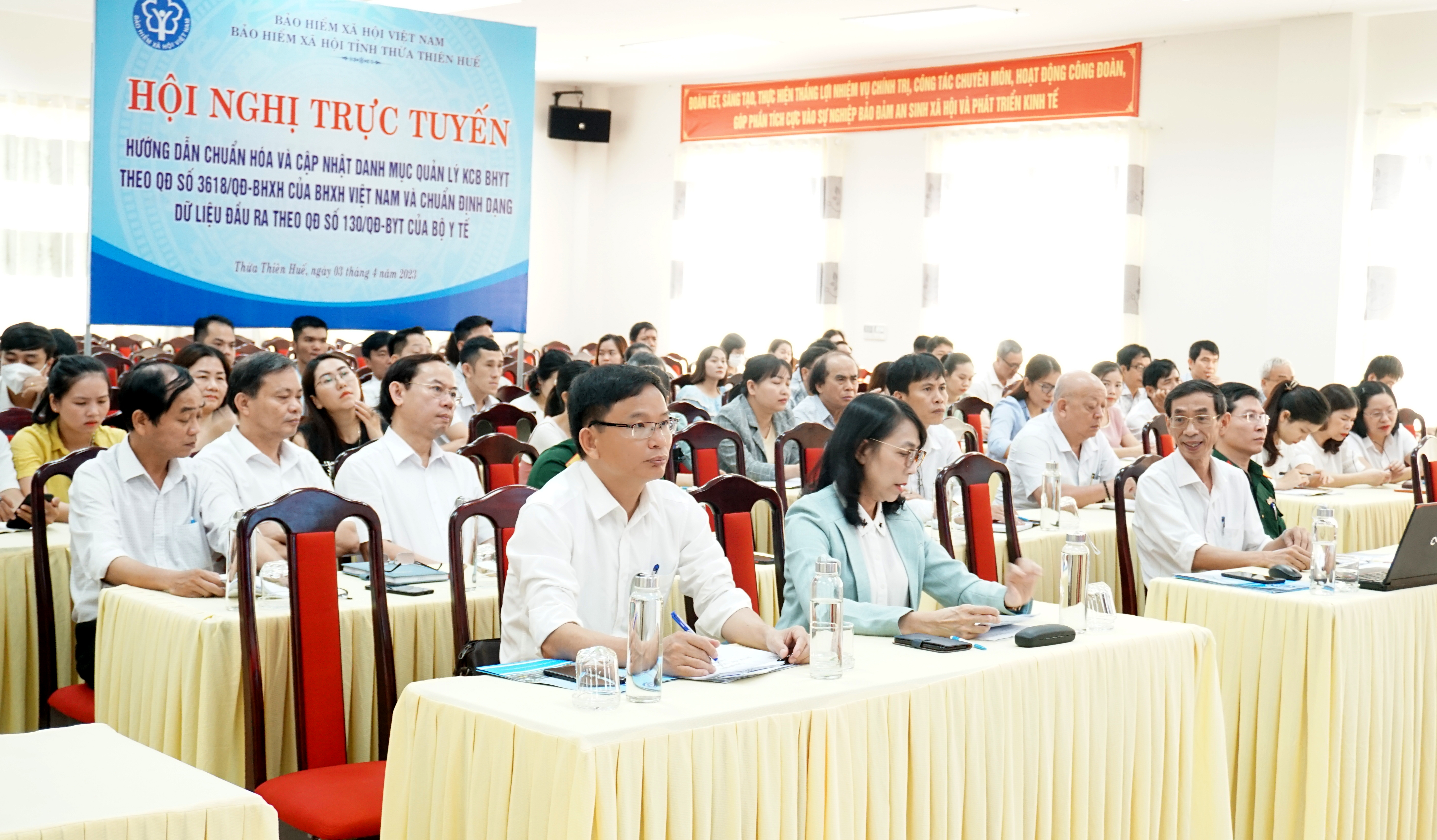 Ngày 03-4-2023, Bảo hiểm Xã hội Việt Nam phối hợp với Ngành Y tế tổ chức Hội nghị trực tuyến về Hướng dẫn chuẩn hóa, cập nhật các danh mục và chỉ tiêu theo Quy trình giám định BHYT và KCB BHYT. Ông Nguyễn Đức Hòa - Phó Tổng giám đốc BHXH Việt Nam chủ trì hội nghị tại đầu cầu Hà Nội. Tham dự hội nghị trực tuyến tại điểm cầu BHXH tỉnh Thừa Thiên Huế có lãnh đạo BHXH tỉnh; lãnh đạo sở, chuyên viên các phòng nghiệp vụ Sở Y tế; lãnh đạo và các cán bộ quản lý công tác KCB BHYT, cán bộ phụ trách CNTT của các cơ sở KCB BHYT; hội nghị được kết nối với 9 TTYT trên địa bàn toàn tỉnh.