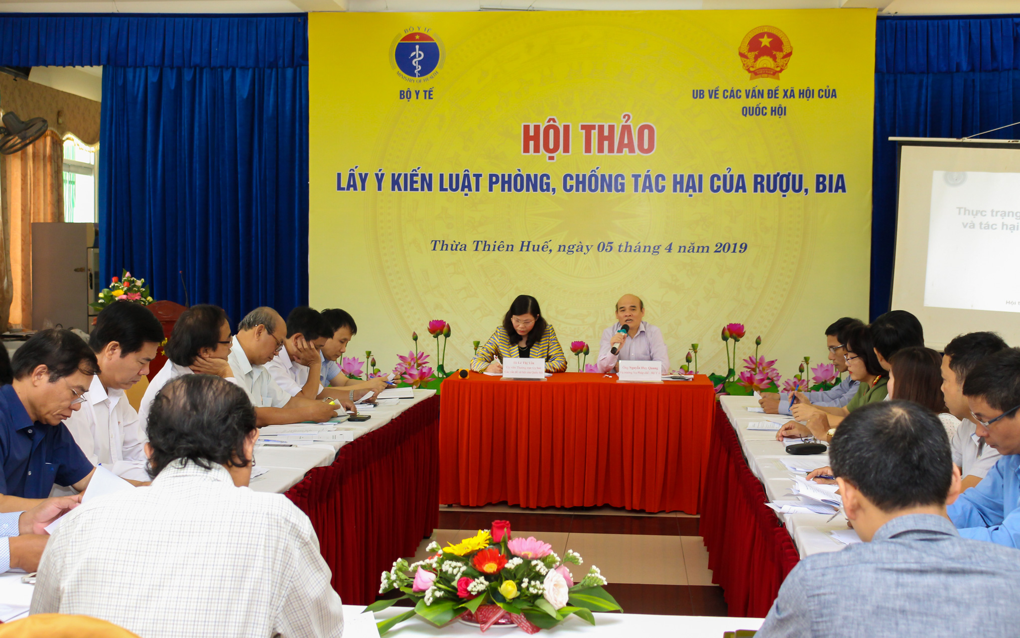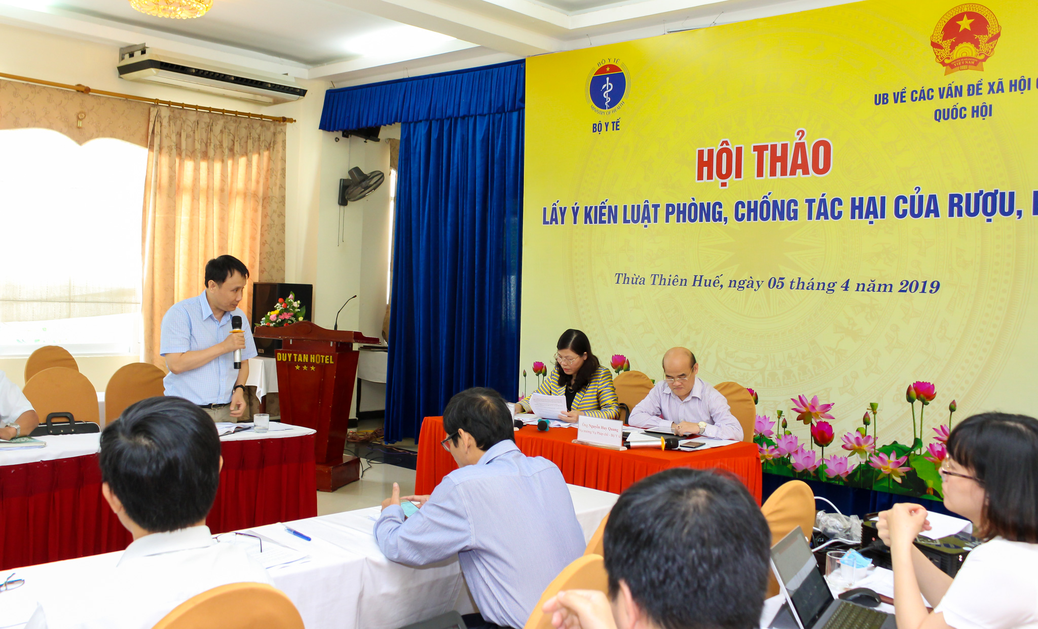 Ngày 5/04/2019 tại thành phố Huế, Bộ Y tế phối hợp với Ủy ban các vấn đề xã hội của Quốc hội tổ chức “Hội thảo lấy ý kiến Luật phòng, chống tác hại của rượu, bia”. Chủ trì Hội thảo có bà Lê Thị Yến-Ủy viên thường trực Ủy ban các các vấn đề xã hội của Quốc hội; ông Nguyễn Huy Quang-Vụ trưởng Vụ pháp chế Bộ Y tế- Thành viên Ban soạn thảo tổ biên tập- Tổ trưởng Tổ biên tập Dự án luật; cùng ông Phạm Như Hiệp-Đại biểu Quôc hội tỉnh TT Huế- Giám đốc Bệnh viện TW Huế; ông Nguyễn Quang Dũng- Viện trưởng VKSND cấp cao Đà Nẵng; đại diện UB kinh tế Quốc hội; đại diện các Sở, Ban, ngành, tổ chức liên quan của tỉnh TT Huế và các tỉnh lân cận.