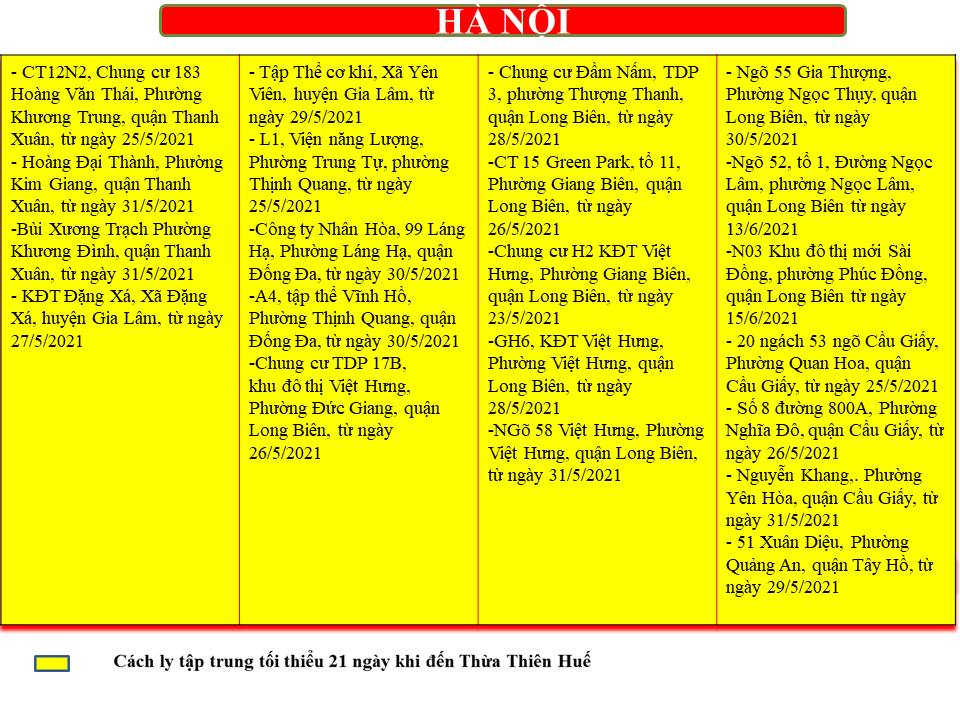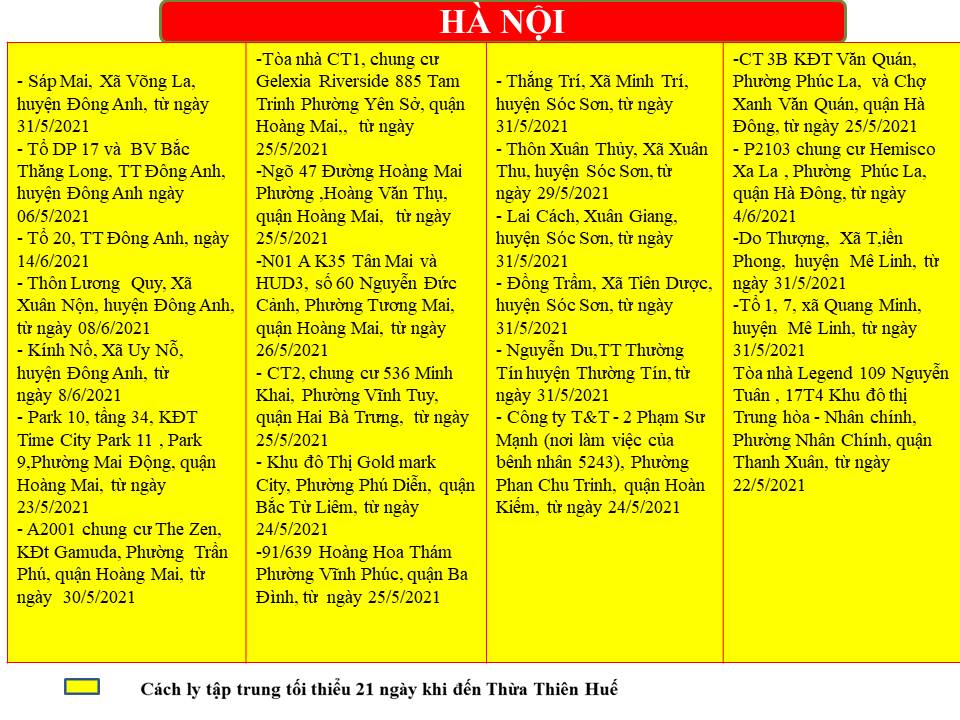 CẬP NHẬT THAY ĐỔI MỚI ĐIỂM DỊCH 10h NGÀY 20/6/2021 STT Tỉnh/ thành phố quận / huyện xã/ phường/ thị trấn Điểm dịch đã qua 28 không có ca mắc tại cộng đồng 1 Hà Nội Gia Lâm Cổ Bi 2 Hà Nội Cầu Giấy Nghĩa Đô 3 Hải Dương TP Hải Dương Nguyễn Trãi 4 Lạng Sơn Hữu Lũng Thiện Tân Cập nhật điểm dịch mới trong ngày