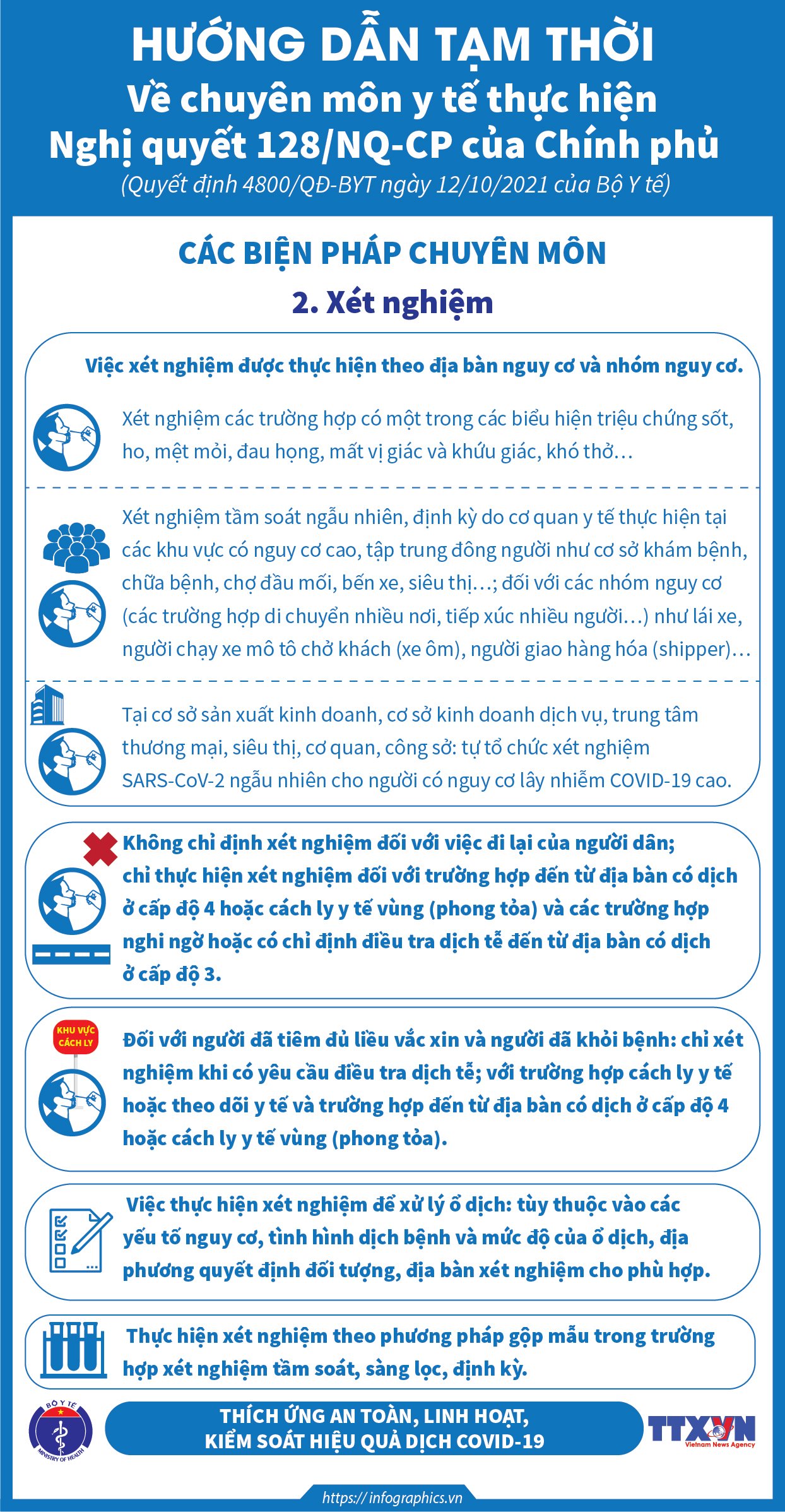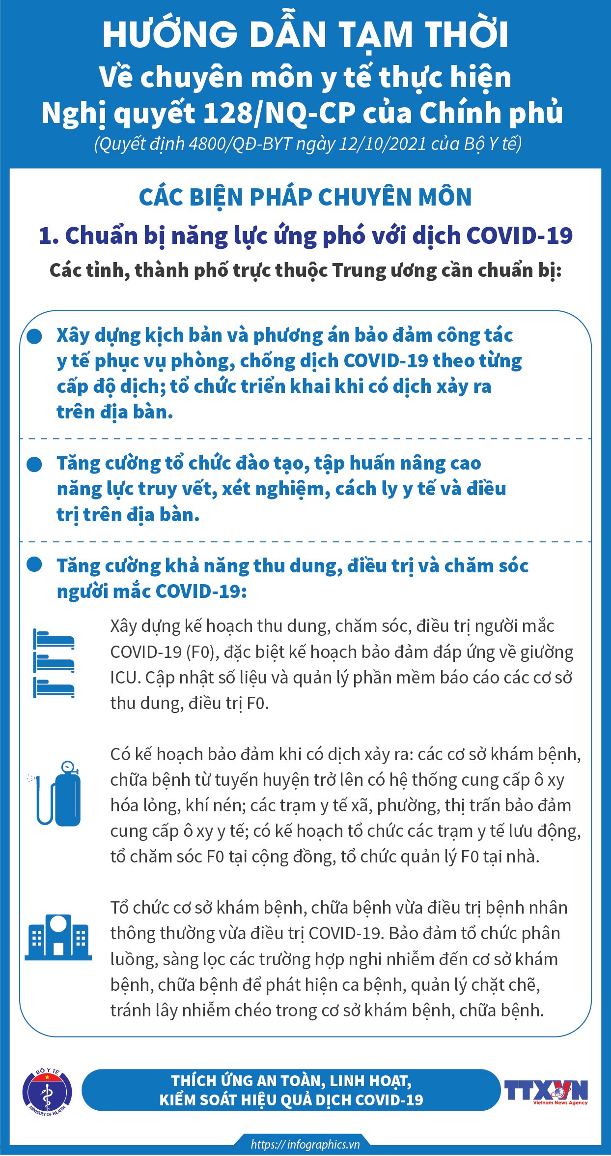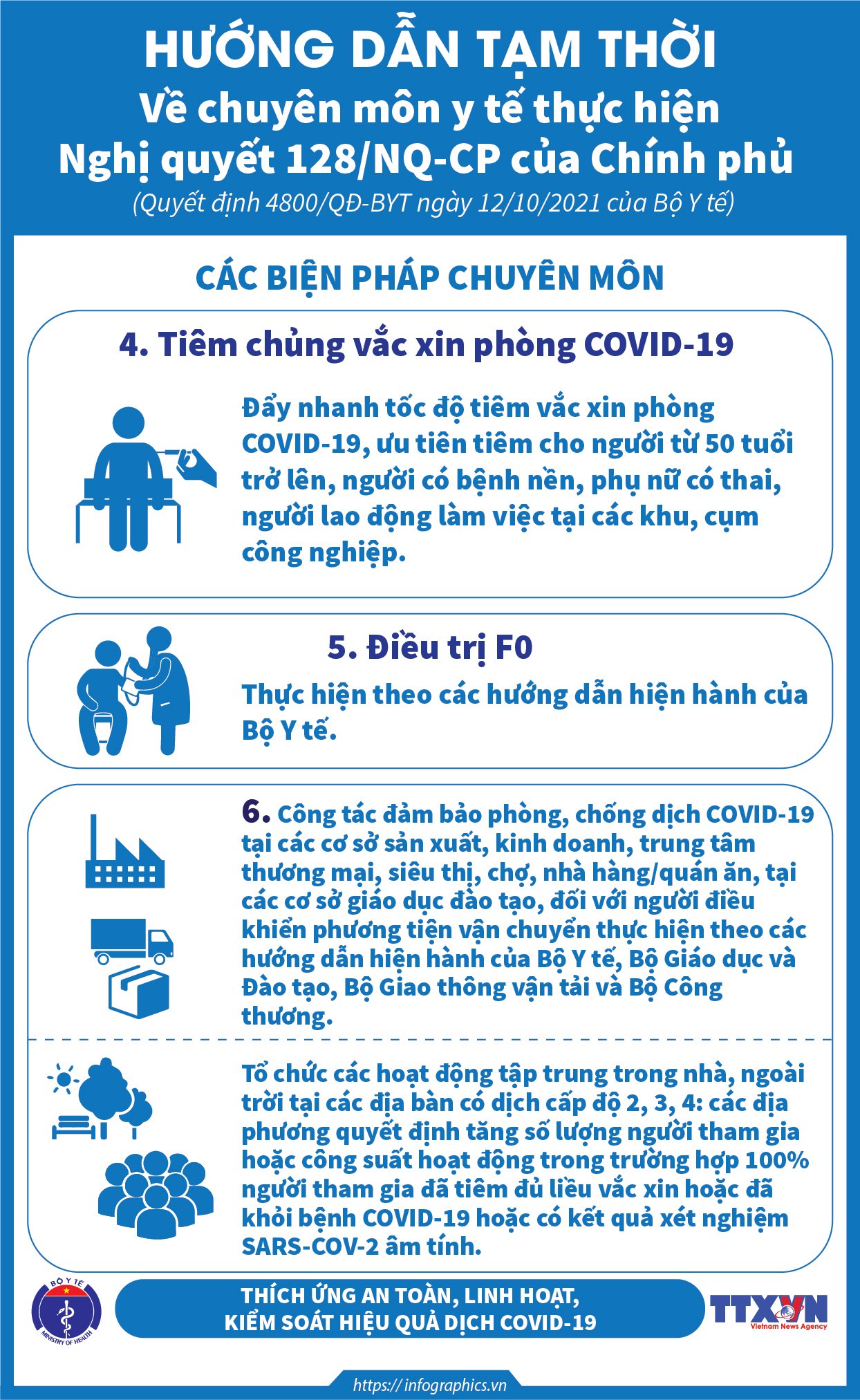 Thực hiện Nghị quyết 128/NQ-CP ngày 11/10/2021 của Chính phủ, Bộ Y tế đã ban hành Quyết định 4800/QĐ-BYT ngày 12/10/2021 hướng dẫn tạm thời các biện pháp chuyên môn y tế thực hiện Nghị quyết số 128/NQ-CP ngày 11 tháng 10 năm 2021 của Chính phủ ban hành Quy định tạm thời "thích ứng an toàn, linh hoạt, kiểm soát hiệu quả dịch COVID-19". Các Infographic xây dựng theo các nội dung chính của Quyết định 4800/QĐ-BYT.