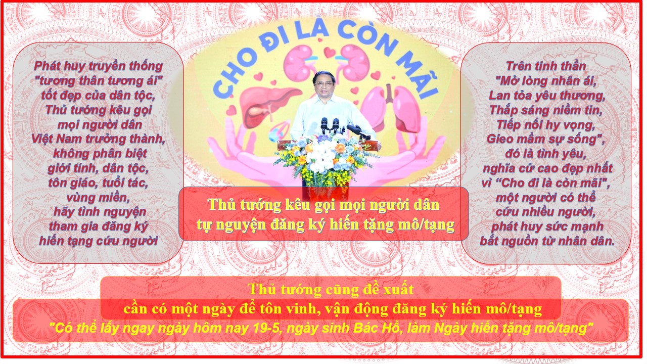 Tôi đề nghị: Các bộ, cơ quan, địa phương, nhất là Bộ Y tế, Trung tâm điều phối ghép tạng Quốc gia phối hợp chặt chẽ, đồng bộ, hiệu quả hơn nữa với Bộ Thông tin và Truyền thông, Hội vận động hiến mô tạng Việt Nam, Hội Chữ thập Đỏ Việt Nam, các tổ chức chính trị - xã hội, những người có ảnh hưởng trong xã hội ủng hộ và tăng cường công tác truyền thông, lan toả ý nghĩa cao đẹp, vận động người dân đăng ký hiến mô, tạng với tinh thần "cho đi là còn mãi".