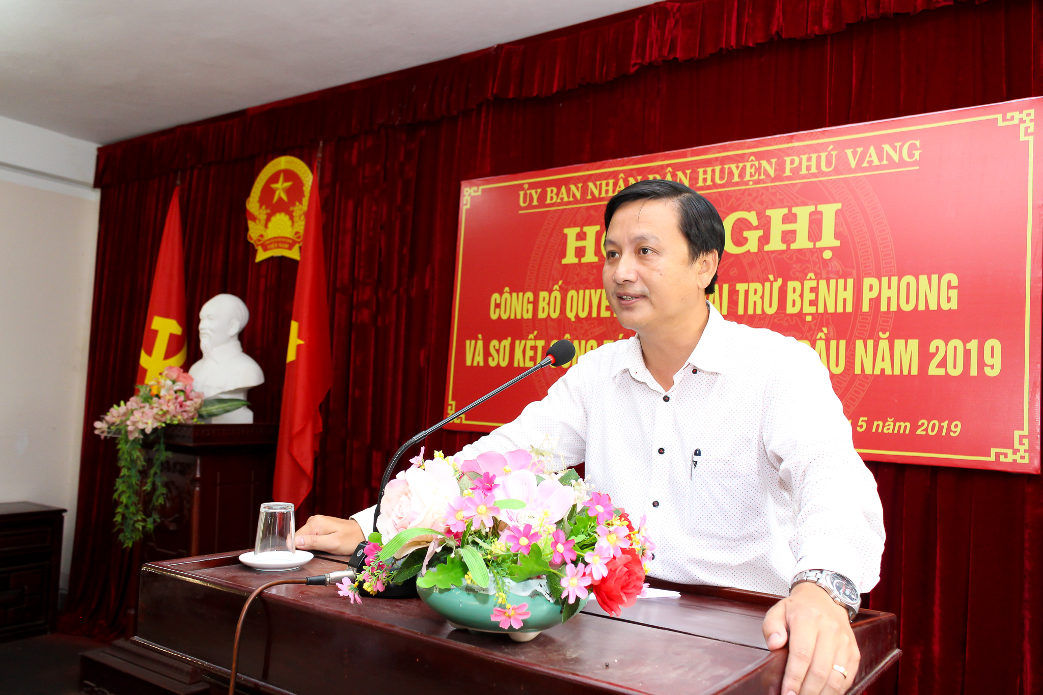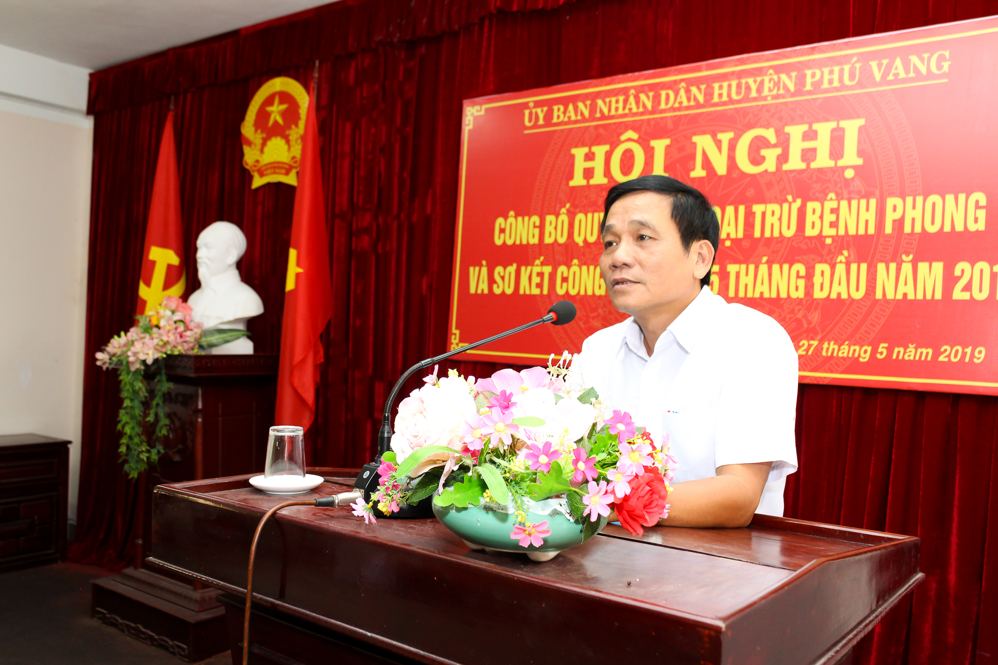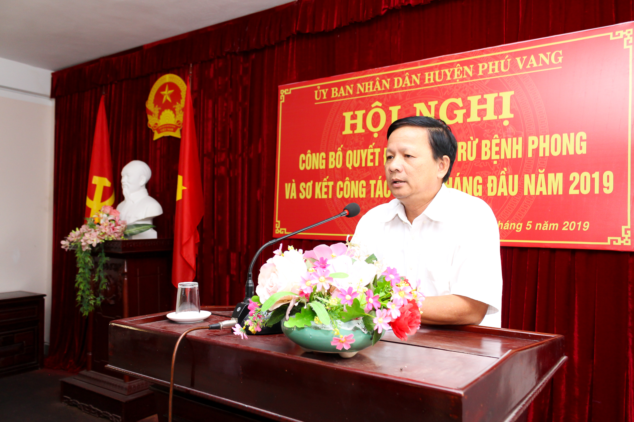 Chiều ngày 27/5/2019, UBND huyện Phú Vang đã tổ chức Hội nghị công bố quyết định công nhận loại trừ bệnh phong và sơ kết công tác Y tế 5 tháng đầu năm 2019. Đến dự hội nghị có Ths Bs Phan Đăng Tâm - PGĐ TT KSBT tỉnh, Bs CKI Lê Đông - PGĐ Bệnh viện Phong - Da liễu tỉnh. Đồng chí Lê Đình Lộc - Huyện ủy viên , Phó chủ tịch UBND huyện chủ trì hội nghị. Tham dự hội nghị có đại diện lãnh đạo HĐND huyện, UBMTTQVN huyện, các thành viên BCĐ, các ban ngành đoàn thể cấp huyện, lãnh đạo UBND và trưởng trạm Y tế của 20 xã, thị trấn.