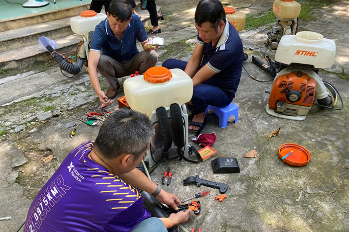 Cán bộ kỹ thuật tiến hành sửa chửa, kiểm tra hoạt động của máy phun