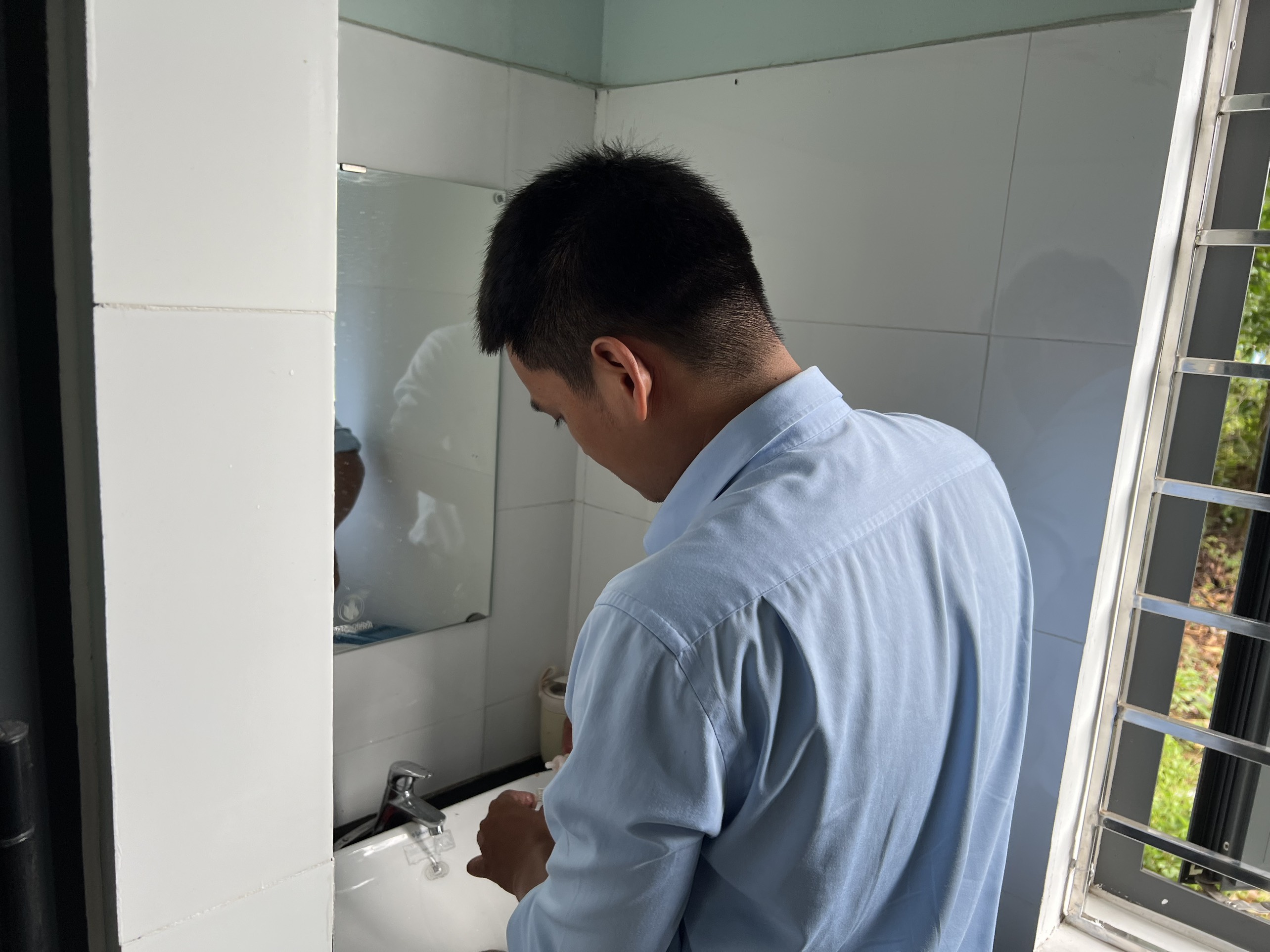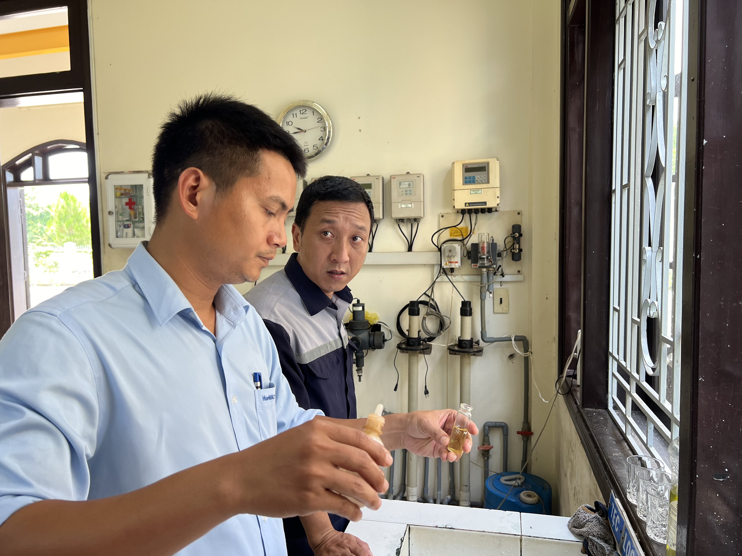 Cán bộ HueWACO lấy mẫu nước tại Trạm y tế xã Lộc An, huyện Phú Lộc