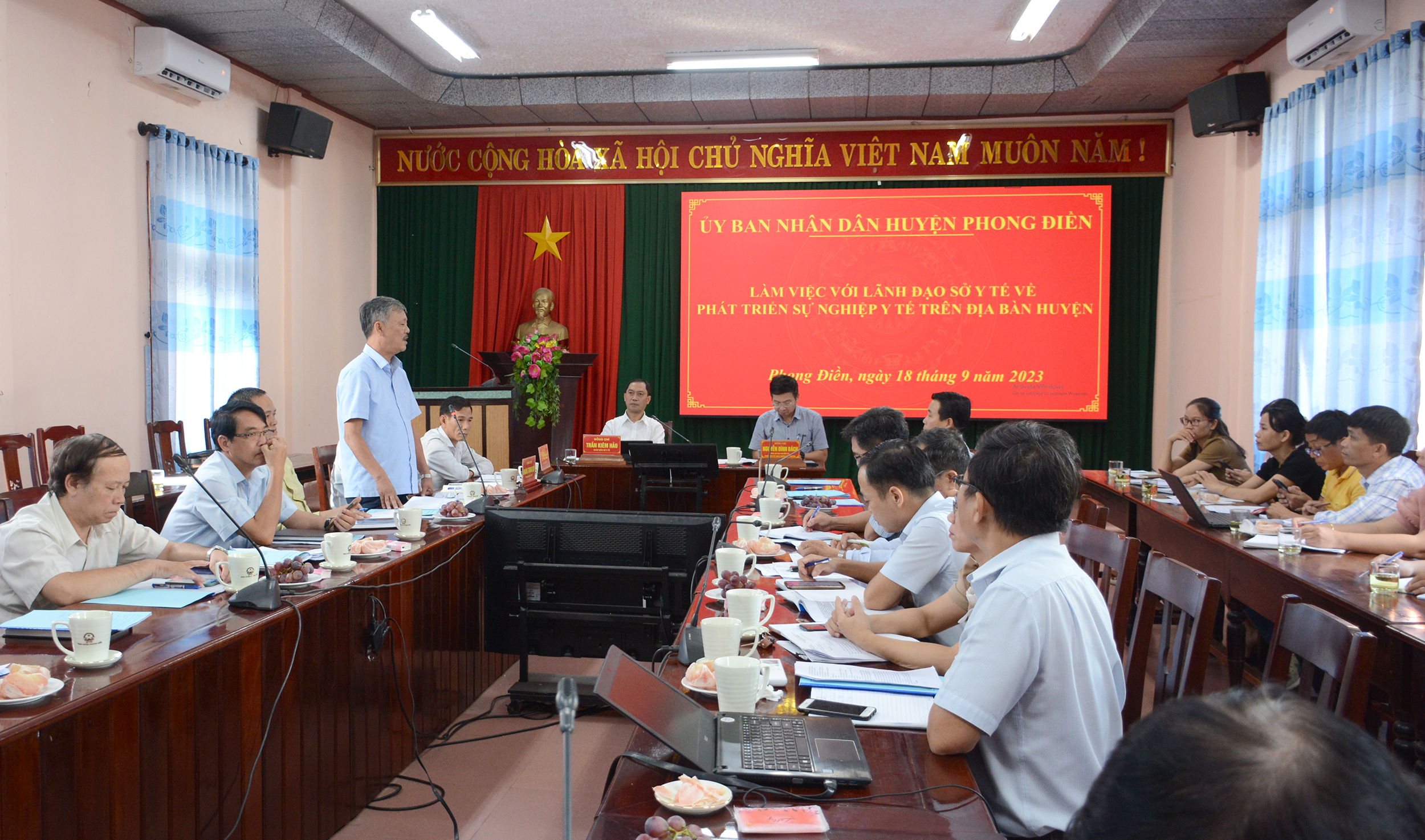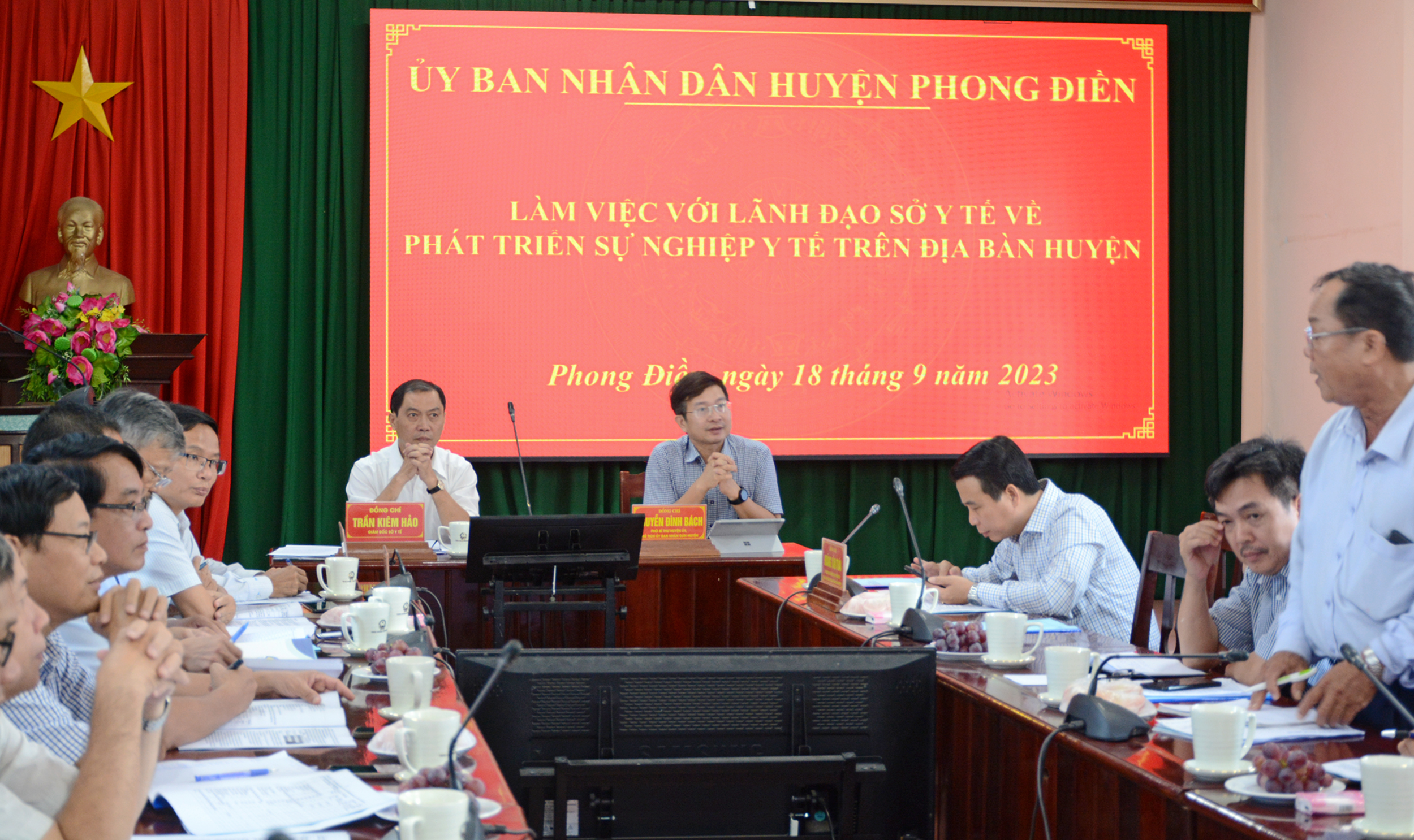 Ngày 18/9/2023, tại huyện Phong Điền, Đoàn công tác Sở Y tế do PGS.TS.BS Trần Kiêm Hảo - Giám đốc làm trưởng đoàn, cùng các Phó Giám đốc, Chánh Văn phòng, Chánh Thanh tra, lãnh đạo/chuyên viên các phòng chuyên môn và nghiệp vụ Sở Y tế có buổi làm việc về phát triển Ngành Y tế huyện Phong Điền. Đồng chí Nguyễn Đình Bách - Phó Bí thư huyện ủy, Chủ tịch UBND cùng các đồng chí Phó Chủ tịch huyện, Ban Giám đốc, các bộ phận chuyên môn TTYT và lãnh đạo các phòng/ban liên quan của huyện Phong Điền tiếp và làm việc với Đoàn.