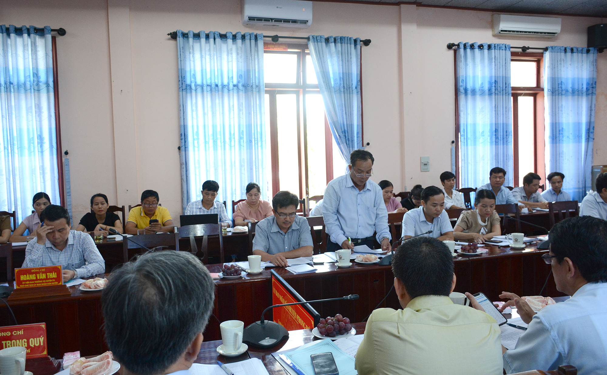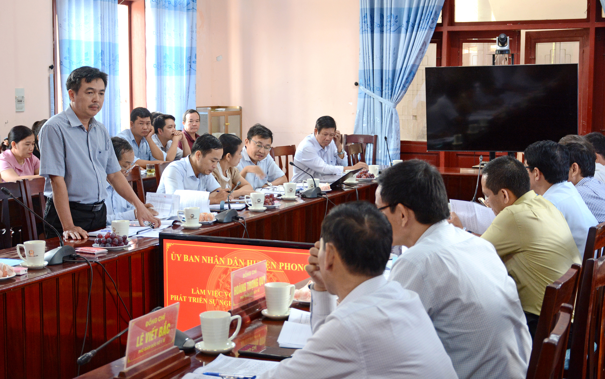 Đ/c Hoàng Văn Thái - Ủy viên Ban Thường vụ huyện ủy, Phó Chủ tịch UBND và đại diện các đơn vị huyện Phong Điền phát biểu tại buổi làm việc.