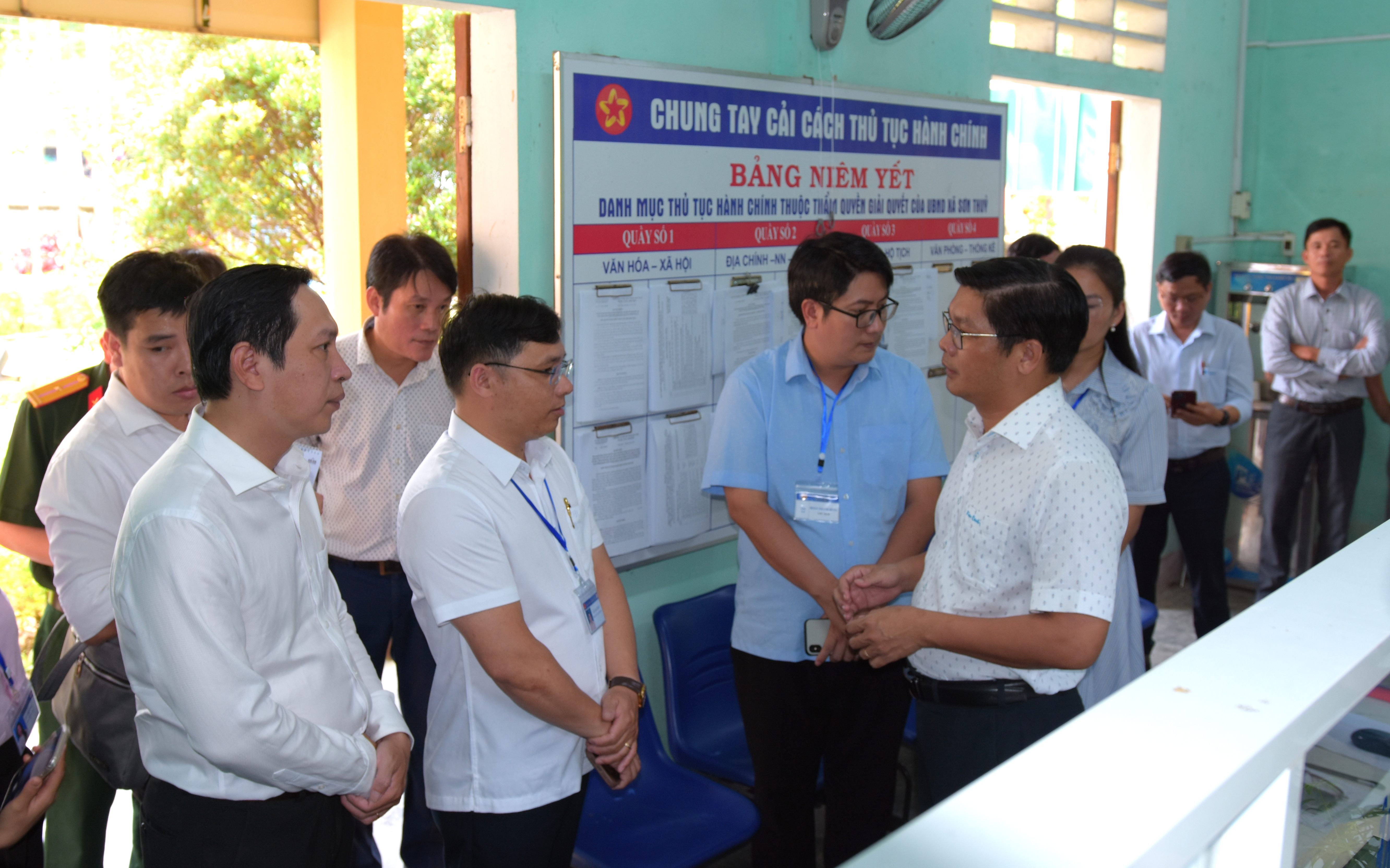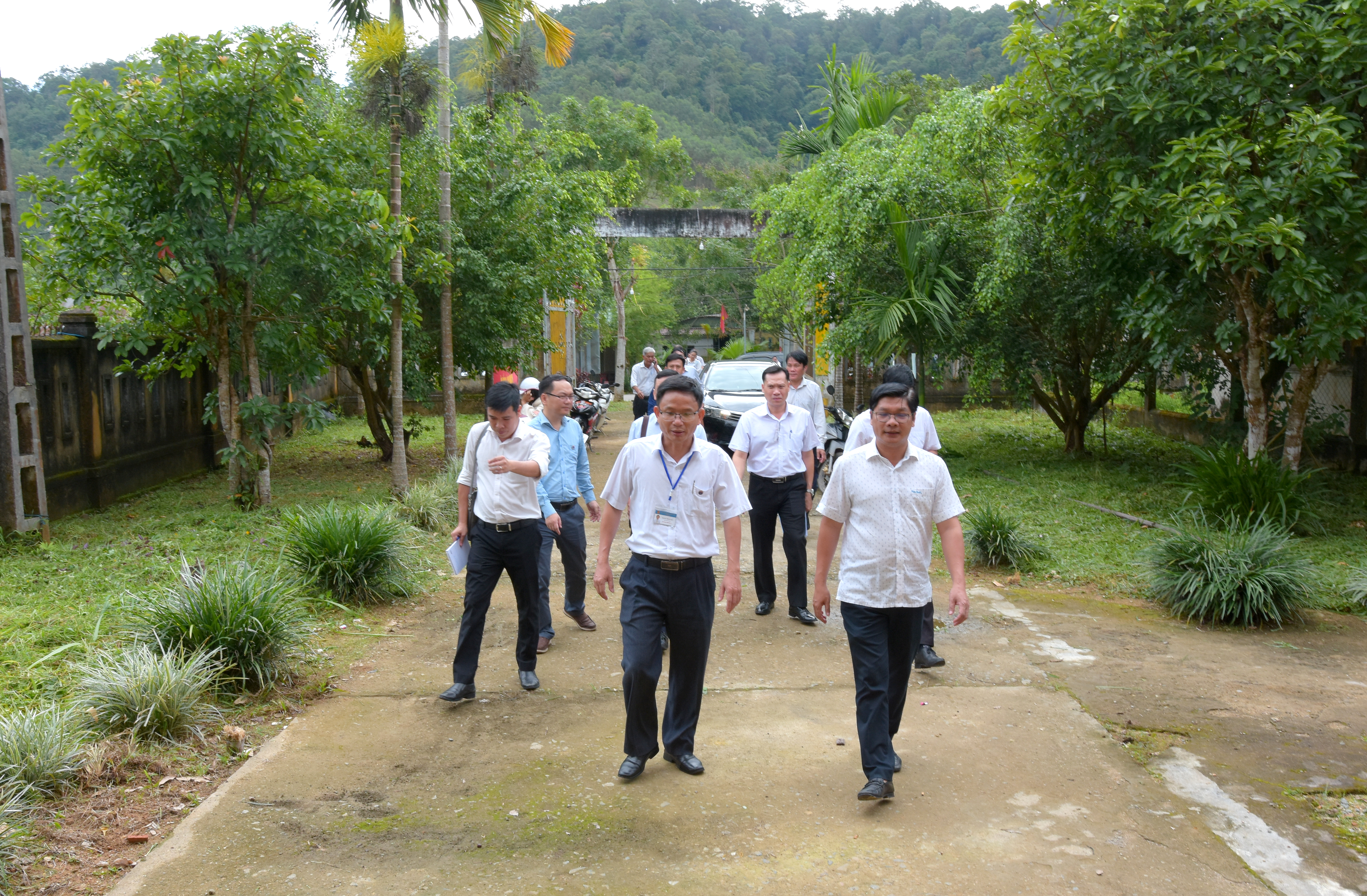 Đồng chí Nguyễn Chí Tài - UVTV Thành ủy, Phó Chủ tịch UBND thành phố (mặt áo chấm) cùng Đoàn công tác thăm và làm việc với Trung tâm hành chính công và trạm Y tế xã A Lưới 3.