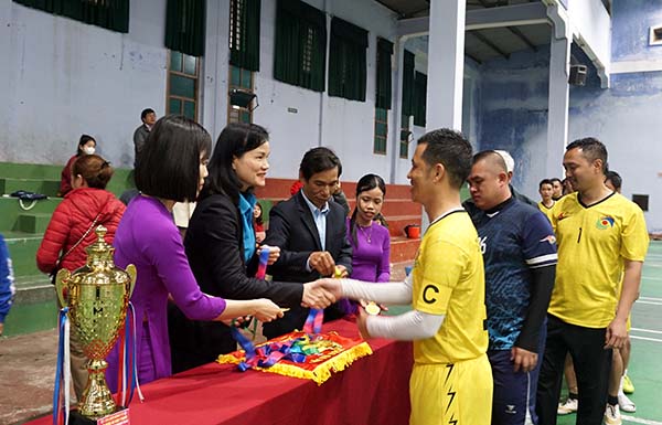Đ/c Trần Thị Minh Nguyệt, Phó Chủ tịch Liên đoàn Lao động tỉnh và đ/c Lê Viết Bắc - Chủ tịch Công đoàn Ngành trao huy chương và cúp Vàng cho đội Liên quân BV Mắt + BV Chấn thương chỉnh hình.