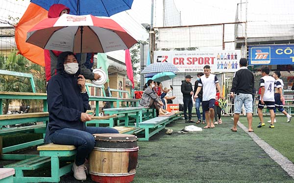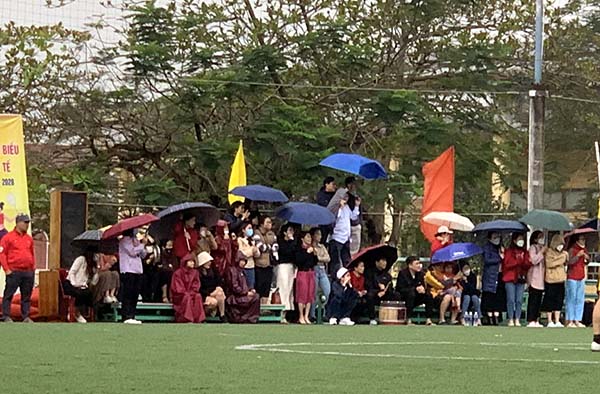 Các cổ động viên nhiệt tình dùng dù che mưa cổ động cho các đội bóng.