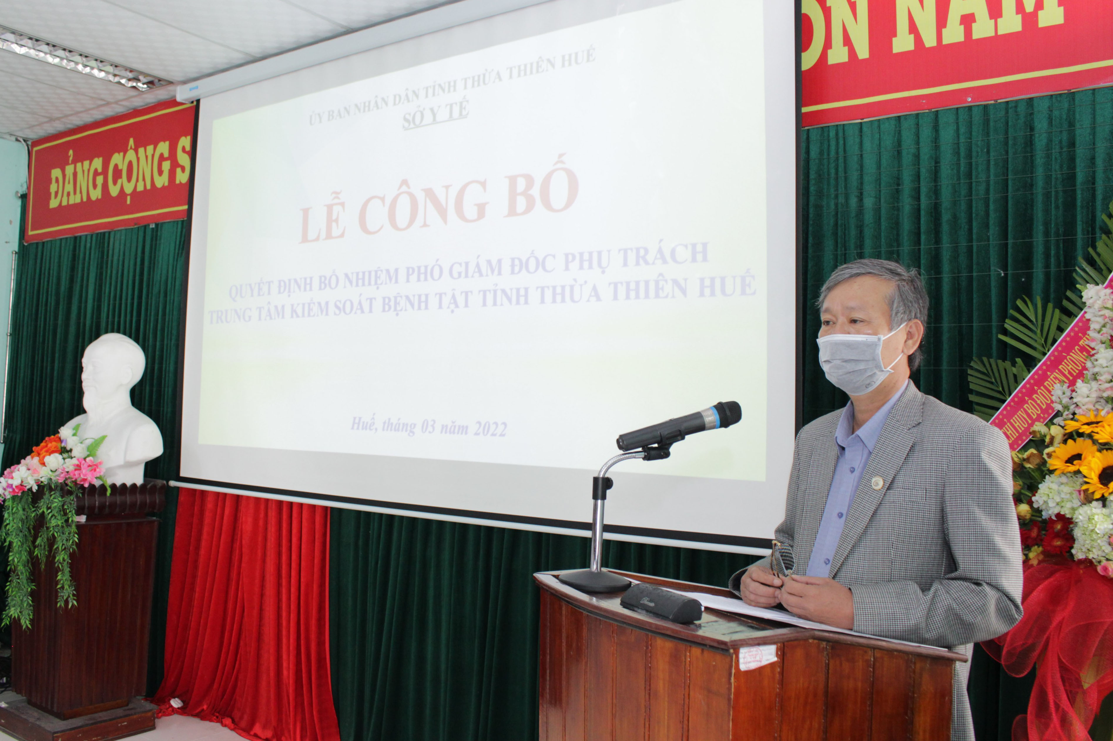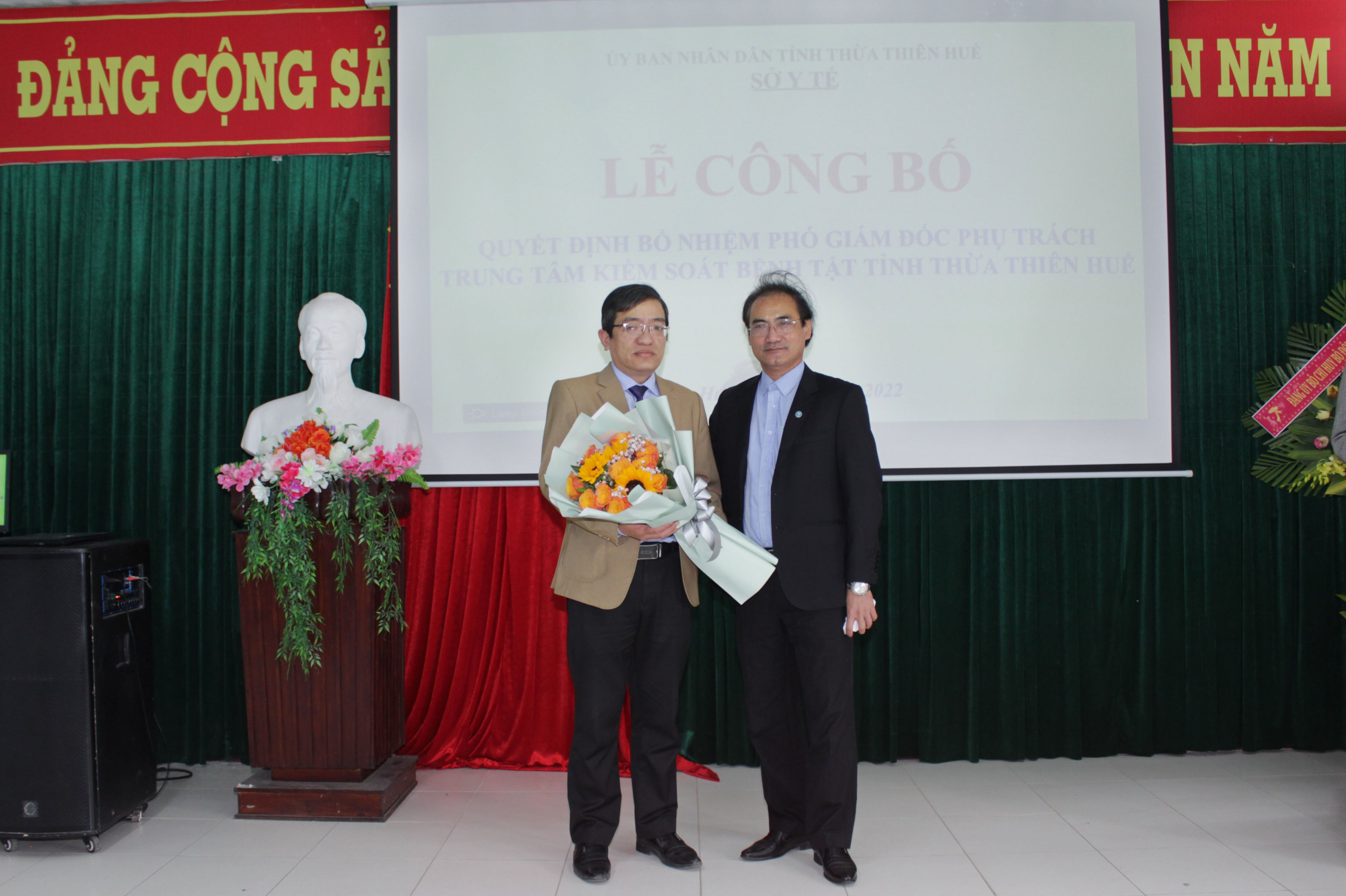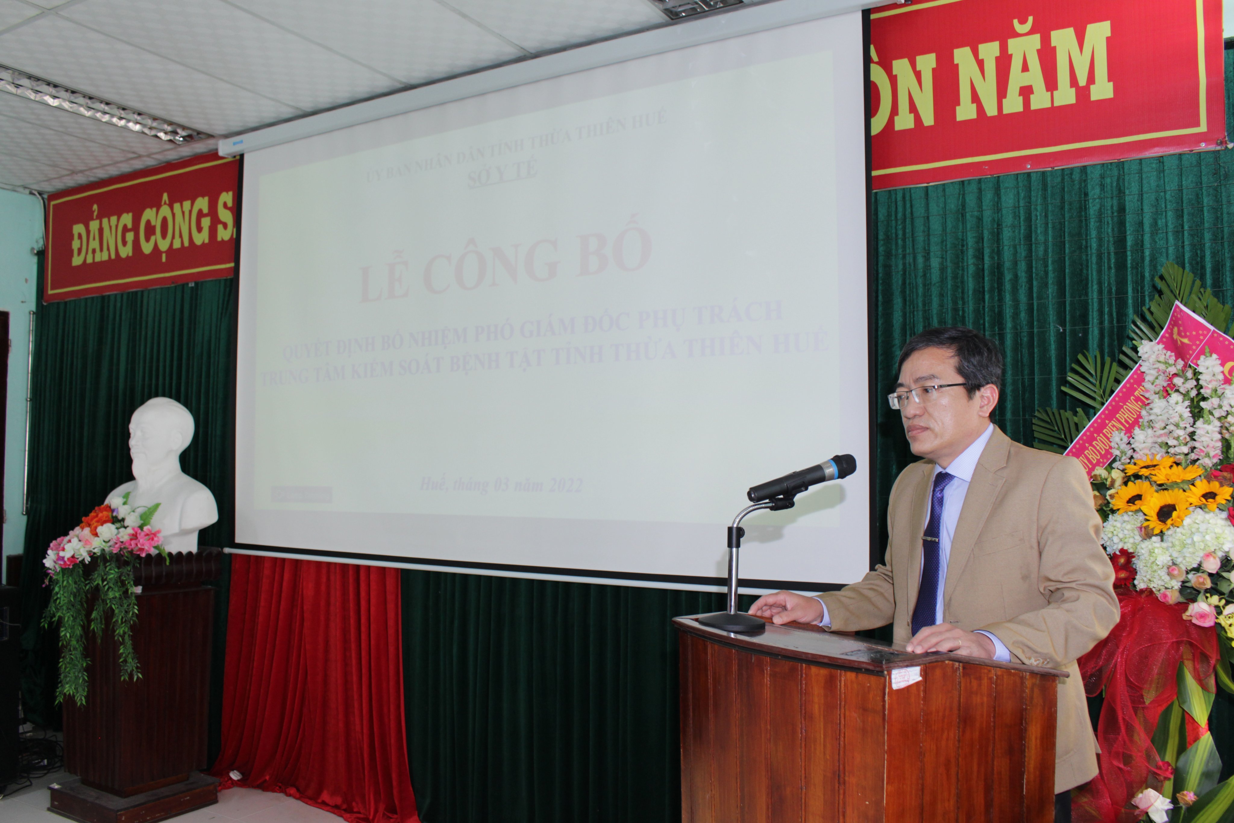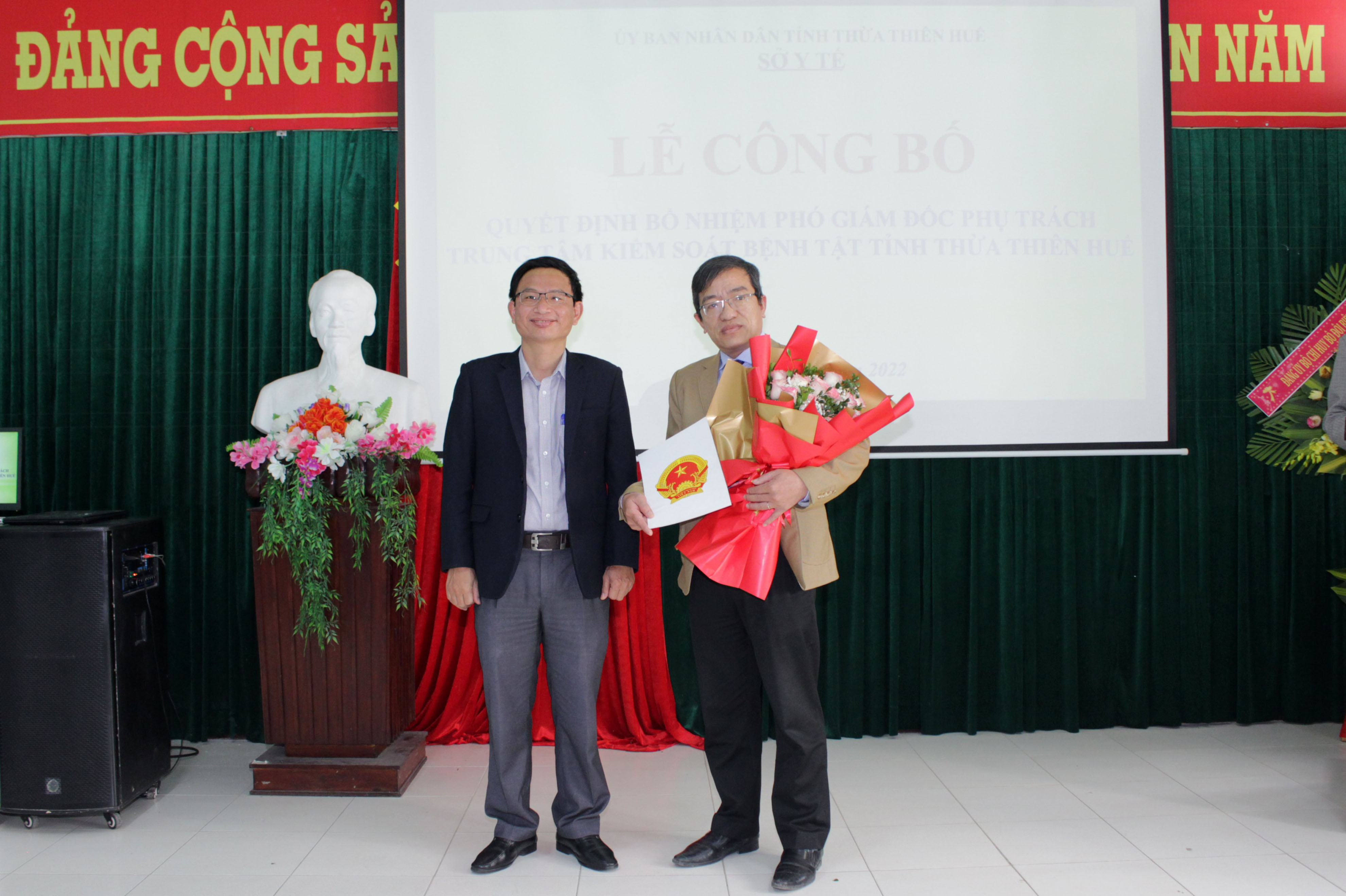 Ngày 03 tháng 3 năm 2022, Trung tâm Kiểm soát bệnh tật tỉnh đã tổ chức Lễ công bố Quyết định của UBND tỉnh Thừa Thiên Huế về việc bổ nhiệm Phó Giám đốc phụ trách Trung tâm Kiểm soát bệnh tật tỉnh Thừa Thiên Huế. Tham dự buổi lễ có Ths.BSCKII Hoàng Trọng Qúy - Phó Giám đốc Sở Y tế, các phòng chức năng liên quan của Sở Y tế cùng Ban Giám đốc và các trưởng phó khoa, phòng Trung tâm Kiểm soát bệnh tật tỉnh.