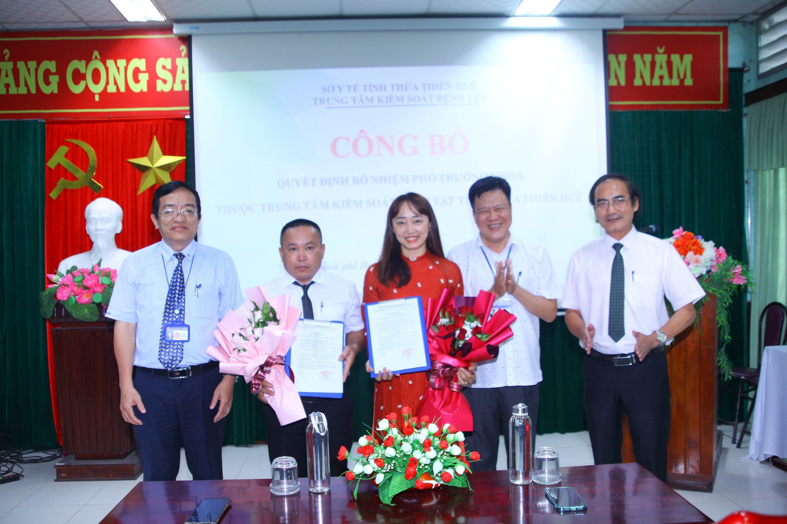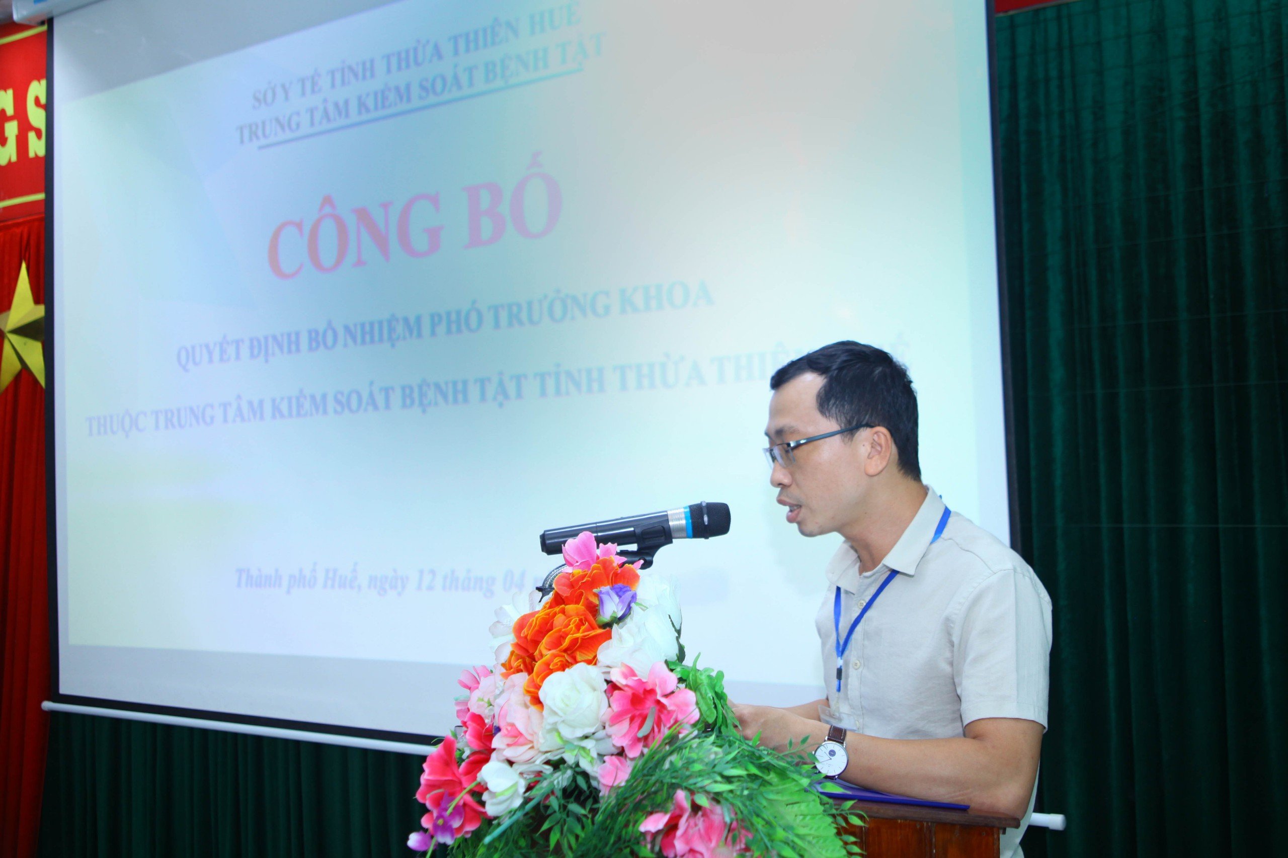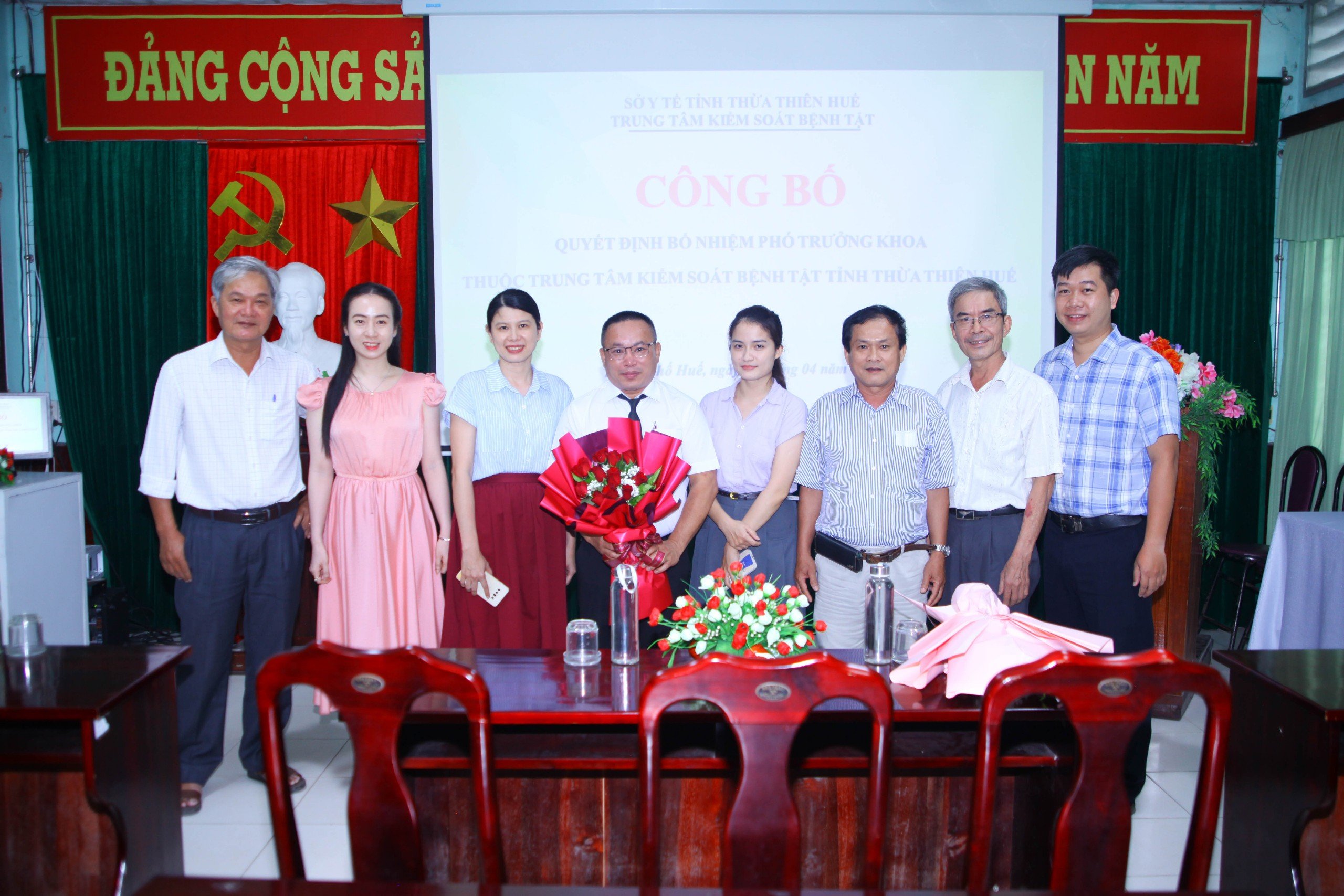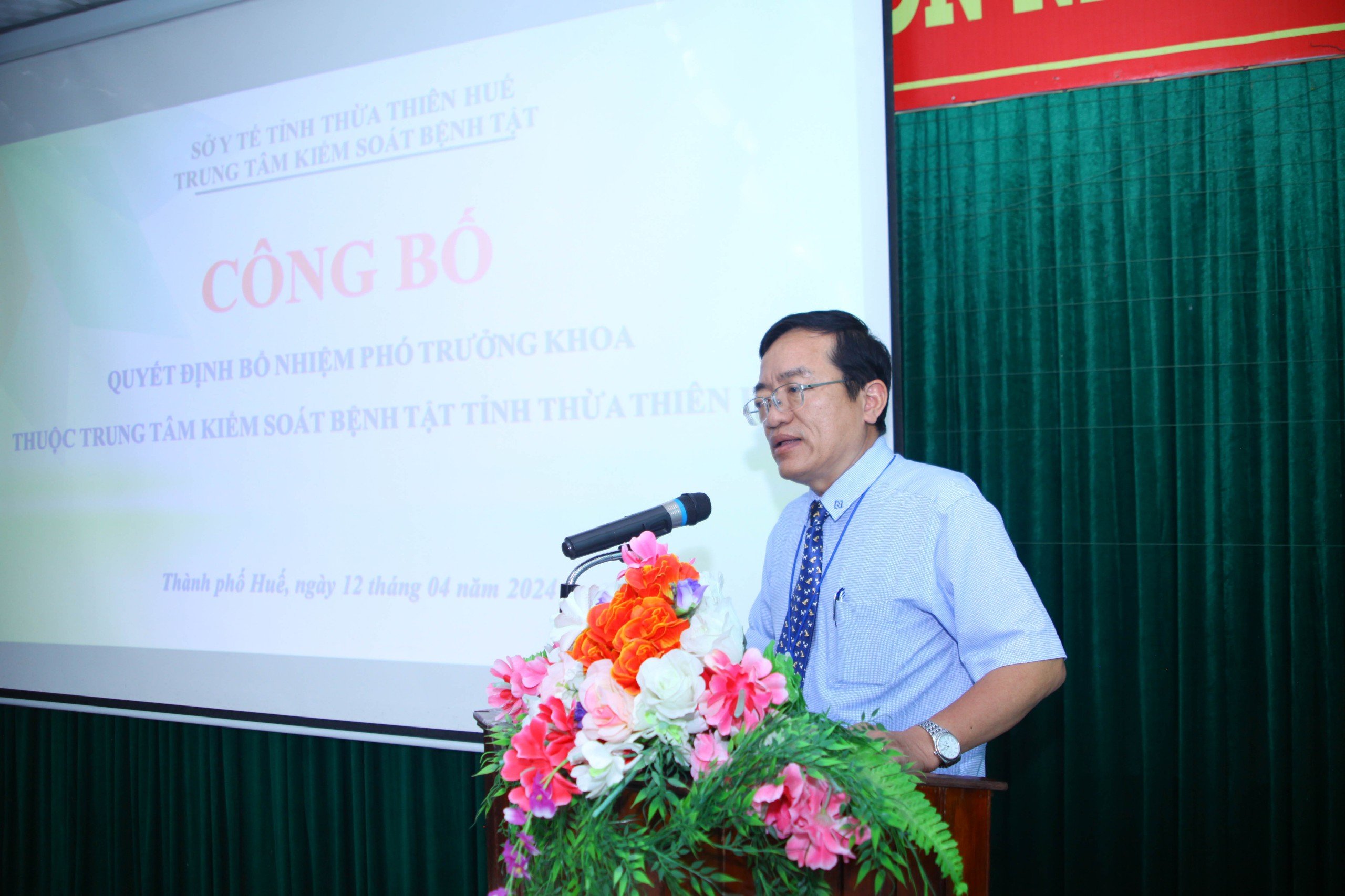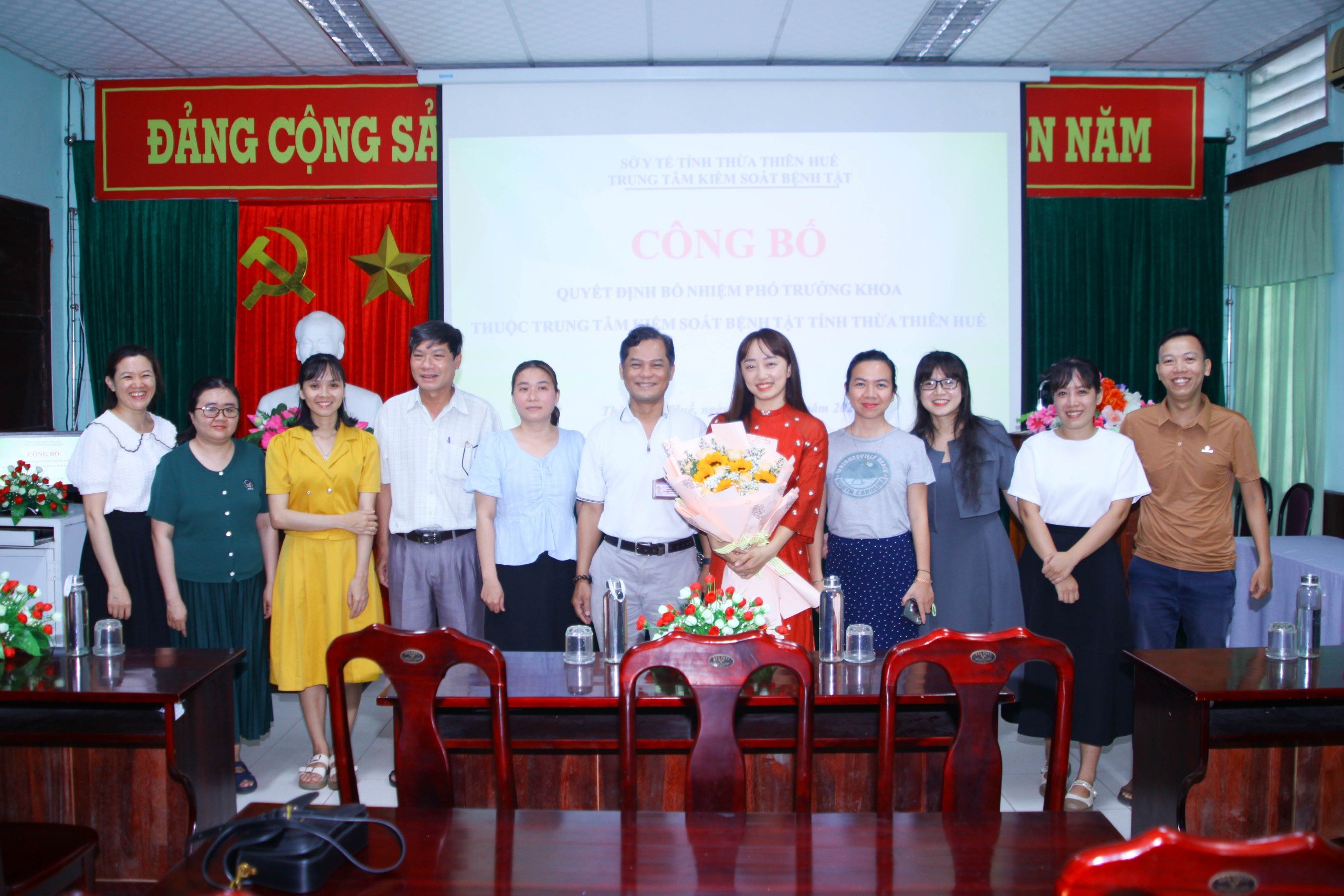 Thực hiện các Quyết định số 38/QĐ-KSBT và Quyết định số 39/QĐ-KSBT ngày 08 tháng 4 năm 2024 của Trung tâm Kiểm soát bệnh tật tỉnh Thừa Thiên Huế về việc bổ nhiệm viên chức quản lý, chiều ngày 12/4/2024, Trung tâm Kiểm soát bệnh tật đã tổ chức Lễ công bố Quyết định bổ nhiệm viên chức quản lý của đơn vị. Dự buổi lễ có Ths. BS CKII Nguyễn Lê Tâm, Phó Bí thư Đảng bộ bộ phận, Phó Giám đốc phụ trách Trung tâm Kiểm soát bệnh tật, BS.CKII Hoàng Văn Thám, Đảng ủy viên Đảng bộ bộ phận, Phó Giám đốc Trung tâm, Ths. BS Hồ Xuân Vũ, Đảng ủy viên Đảng bộ bộ phận, Phó Giám đốc Trung tâm; Ban Chủ nhiệm và toàn thể viên chức Khoa Phòng, chống Bệnh truyền nhiễm - Ký sinh trùng - Côn trùng và Khoa Phòng, chống HIV/AIDS.