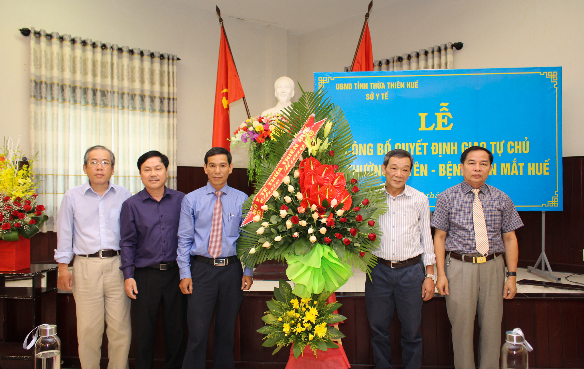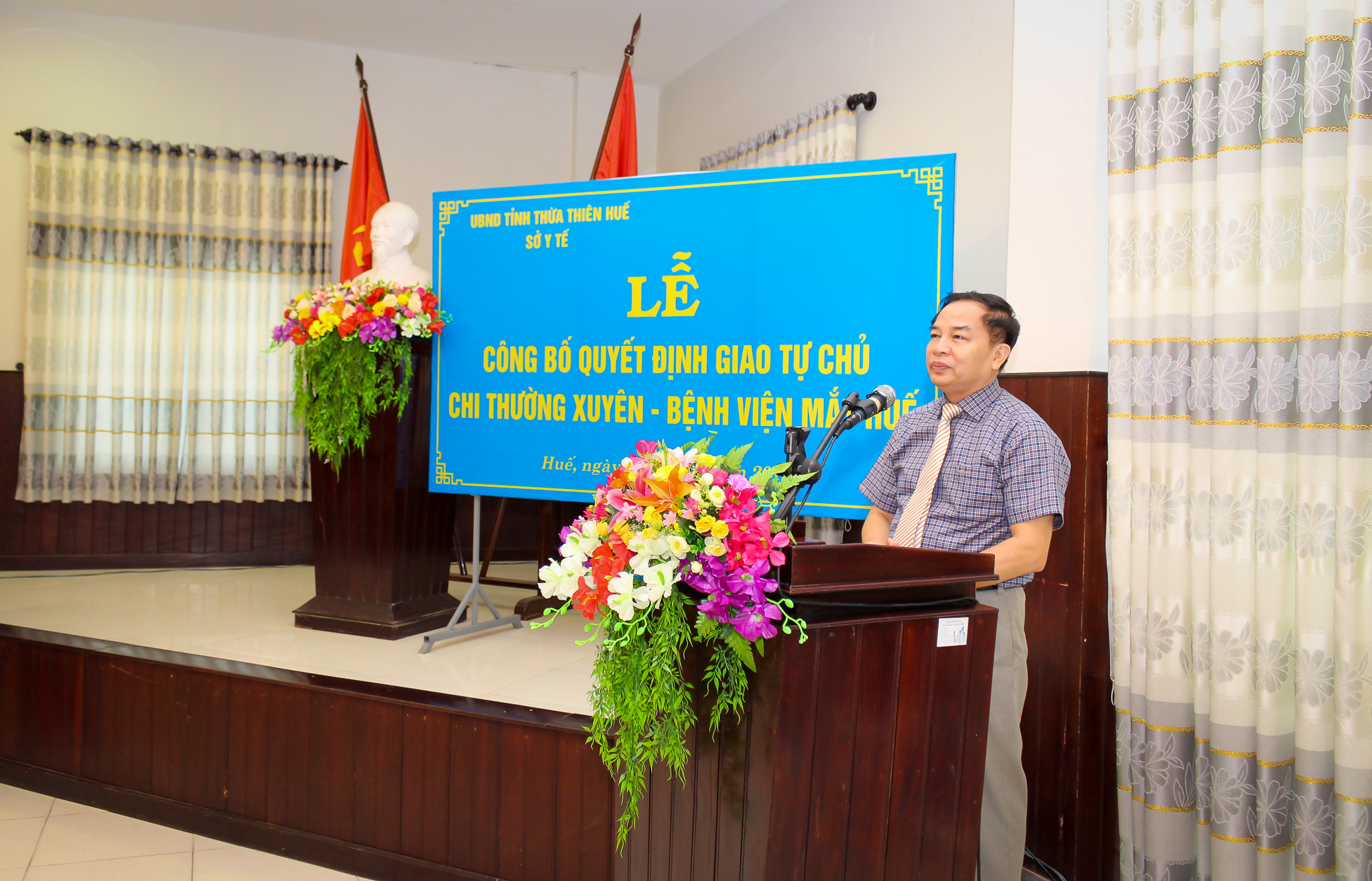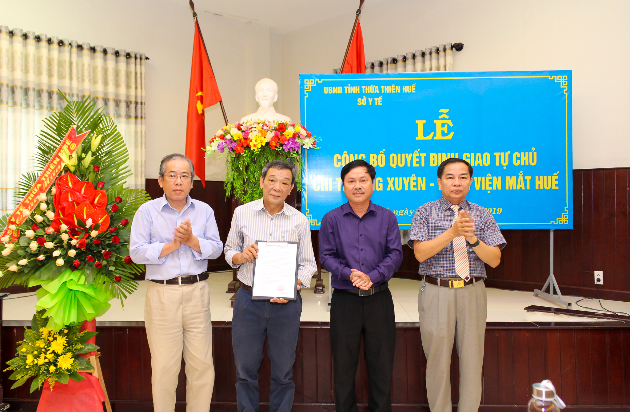 Thừa ủy quyền của UBND tỉnh, BSCKII Nguyễn Đắc Ngọc – Trưởng phòng Tổ chức Sở Y tế đã đọc Quyết định số 1727/QĐ-UBND ngày 19 tháng 7 năm 2019 của UBND tỉnh về việc trao quyền tự chủ, tự chịu trách nhiệm về thực hiện nhiệm vụ, tổ chức bộ máy, biên chế và tài chính đối với đơn vị sự nghiệp công lập theo Nghị định 43/2006/NĐ-CP cho bệnh viện Mắt Huế trực thuộc Sở Y tế giai đoạn 2019-2021, với loại hình “Đơn vị sự nghiệp tự bảo đảm chi phí hoạt động thường xuyên”. Quyết định có hiệu lực kể từ ngày ký.