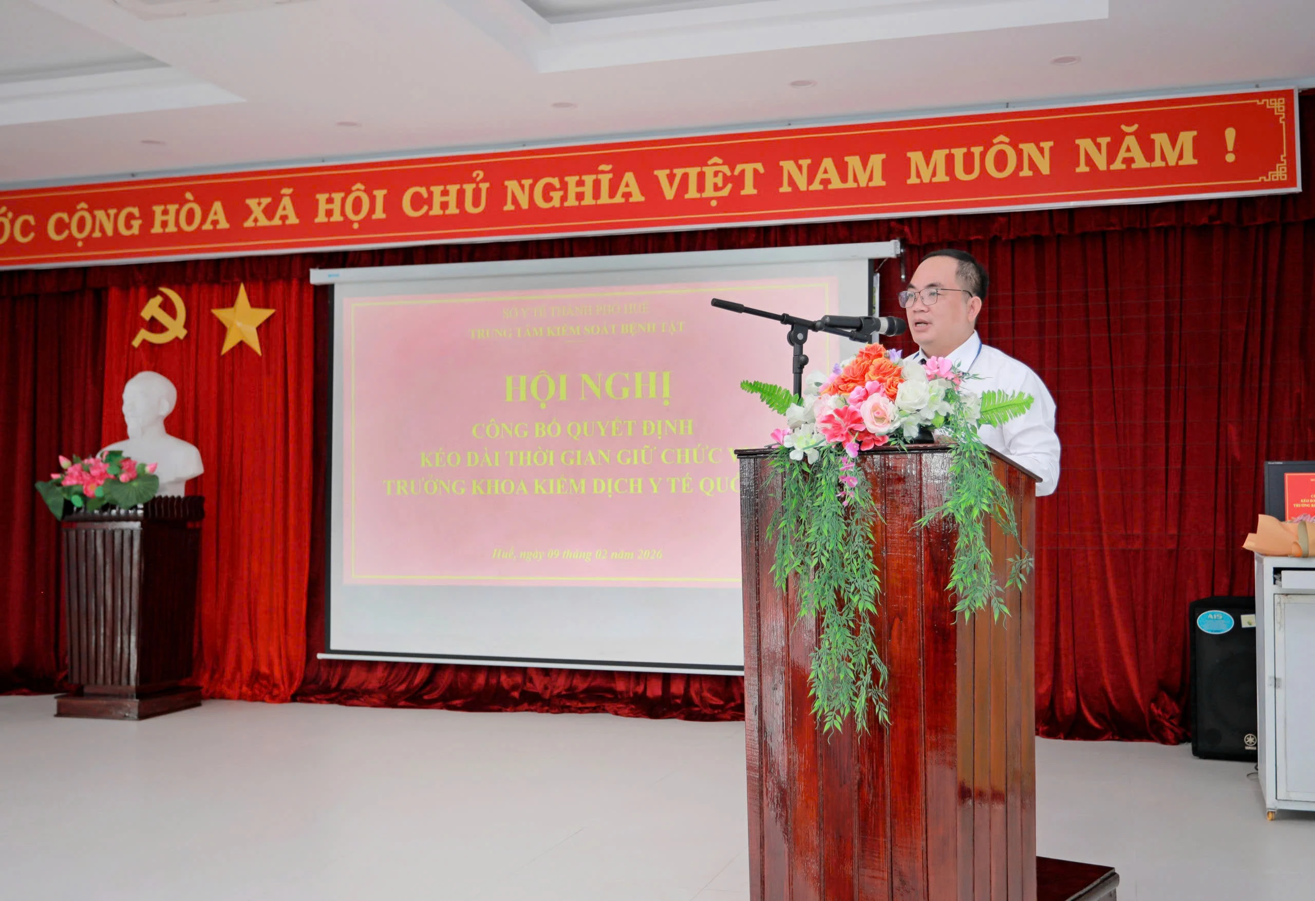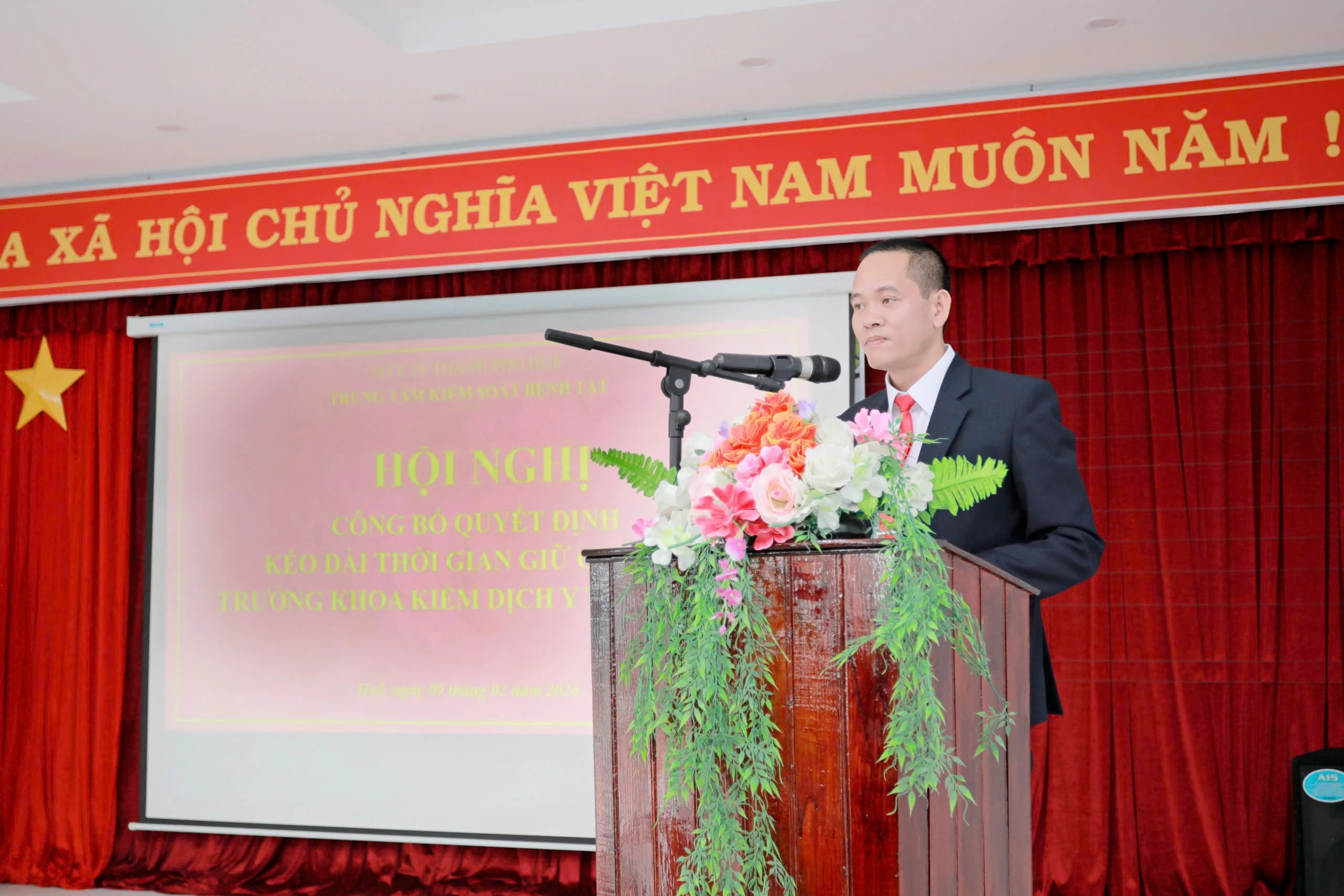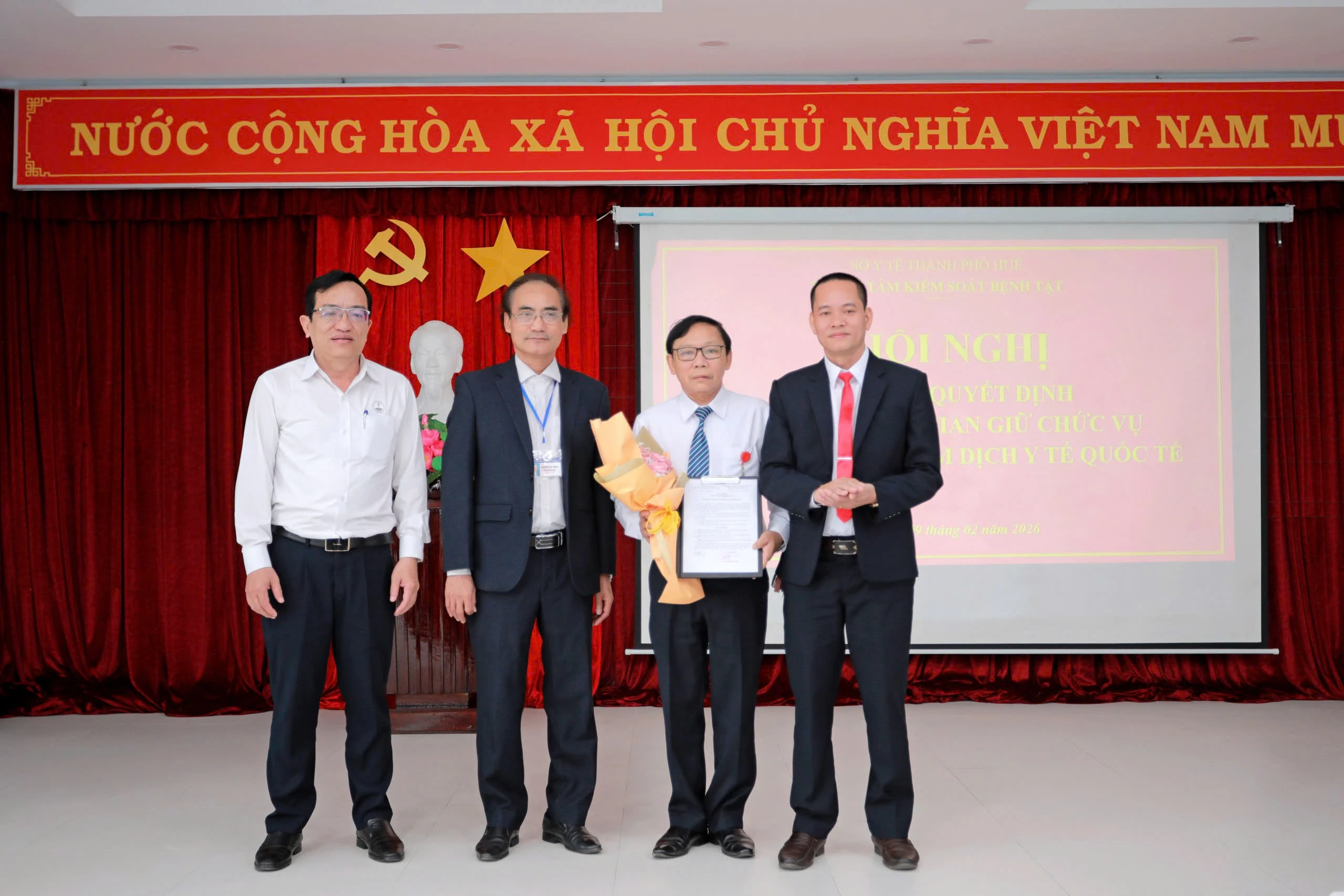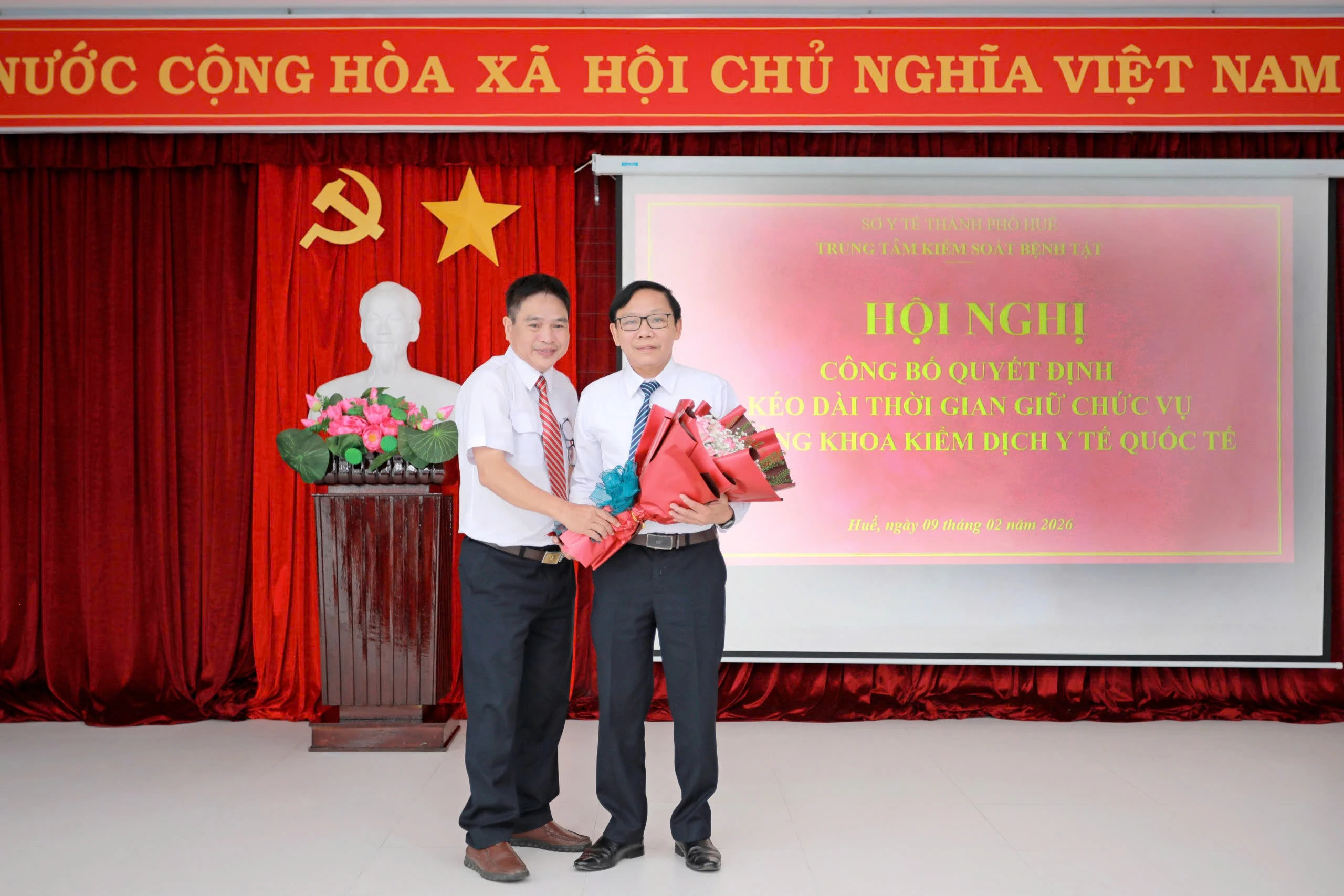 Thực hiện Quyết định số 24/QĐ-KSBT ngày 02 tháng 02 năm 2026 của Trung tâm Kiểm soát bệnh tật thành phố Huế về việc kéo dài thời gian giữ chức vụ. Sáng ngày 09/2/2026, Trung tâm Kiểm soát bệnh tật đã tổ chức Lễ công bố Quyết định Kéo dài thời gian giữ chức vụ Trưởng khoa Kiểm dịch Y tế Quốc tế. Dự buổi lễ có BS CKII Thái Văn Tuấn, Ủy viên Ban chấp hành Đảng bộ Sở Y tế, Bí thư Đảng bộ bộ phận, Giám đốc Trung tâm Kiểm soát bệnh tật; ThS.BSCKII Nguyễn Lê Tâm, Phó Bí Thư Đảng bộ bộ phận, Phó Giám đốc Trung tâm; BS.CKII Hoàng Văn Thám, Đảng ủy viên Đảng bộ bộ phận, Phó Giám đốc Trung tâm; Ban Chủ nhiệm và toàn thể viên chức Khoa Kiểm dịch Y tế Quốc tế.