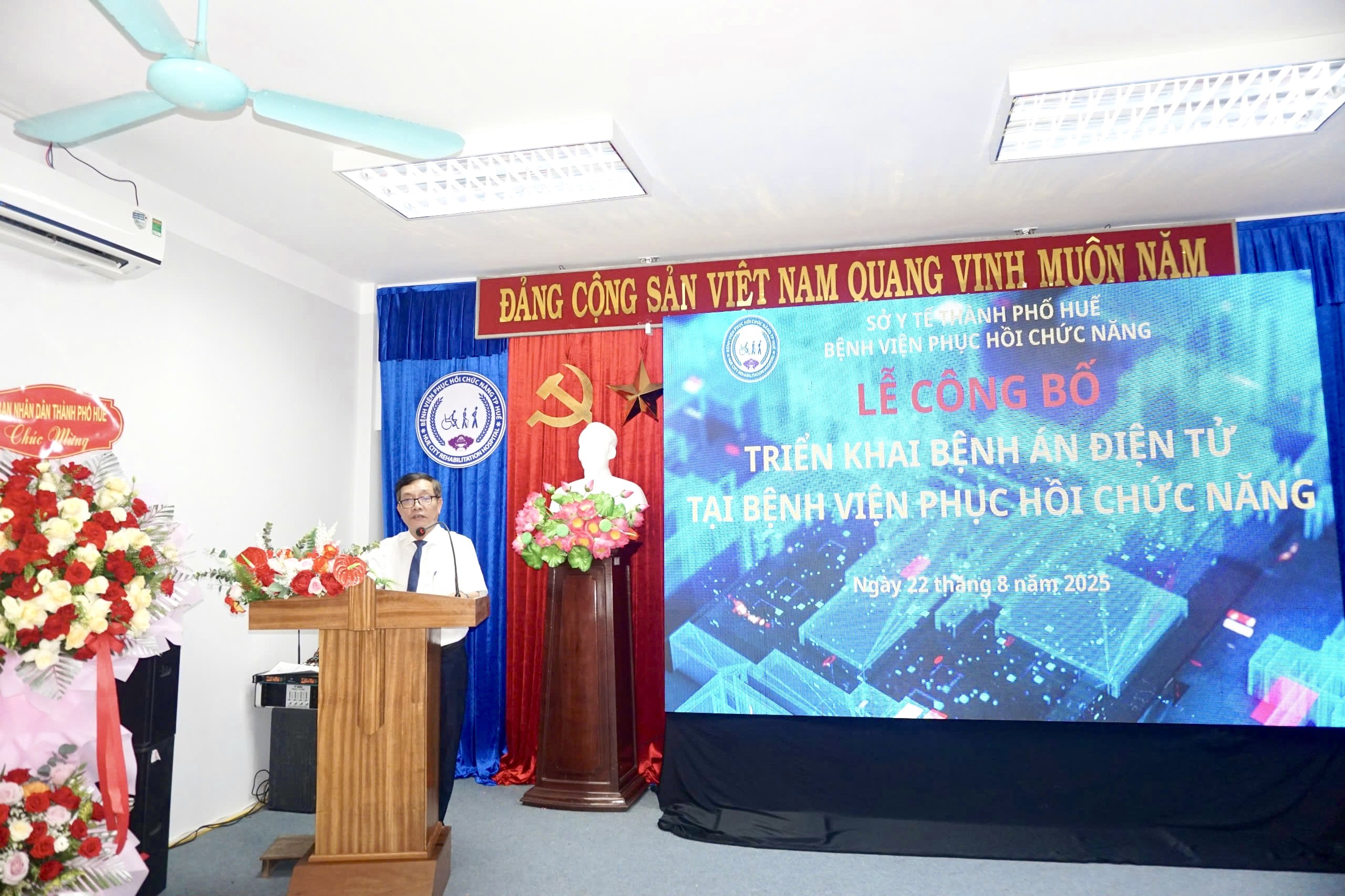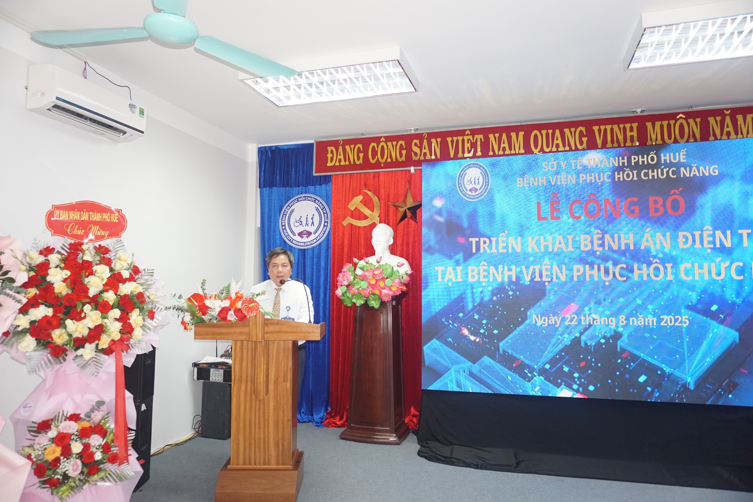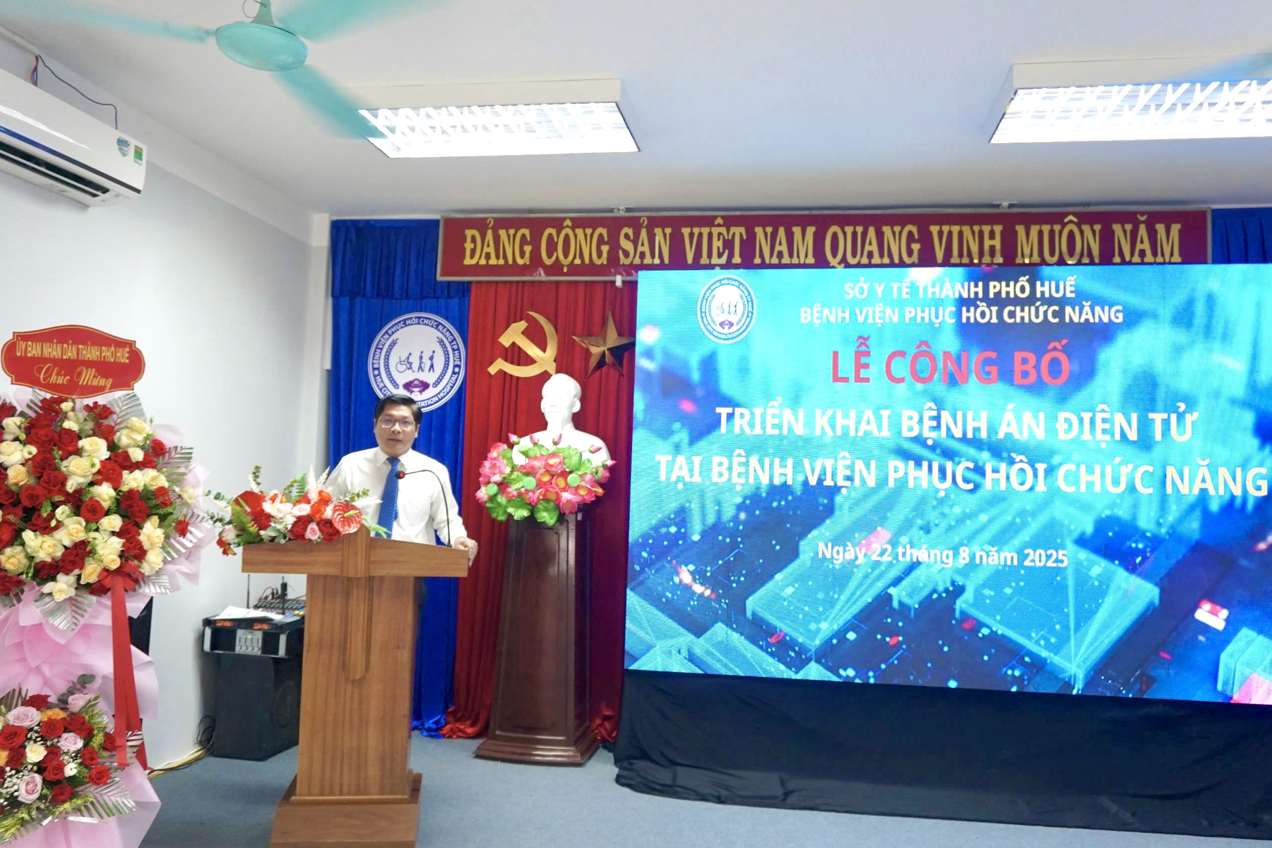 Căn cứ Kế hoạch số 204/KH-UBND ngày 06/5/2025 của Ủy ban nhân dân thành phố Huế về việc triển khai bệnh án điện tử. Chiều ngày 22/8/2025, Bệnh viện Phục hồi chức năng long trọng tổ chức Lễ công bố triển khai hồ sơ bệnh án điện tử, đây là sự kiện đánh dấu bước tiến quan trọng trong hành trình chuyển đổi số của bệnh viện. Đến tham dự buổi Lễ công bố, về phía UBND thành phố Huế có Đồng chí Nguyễn Chí Tài – Phó Chủ tịch UBND thành phố. Về phía Sở Y tế có PGS.TS Trần Kiêm Hảo – Giám đốc Sở Y tế. Về phía Bệnh viện Phục hồi chức năng, có ThS.Bs Nguyễn Khoa Nguyên – Giám đốc Bệnh viện và các thành phần liên quan.