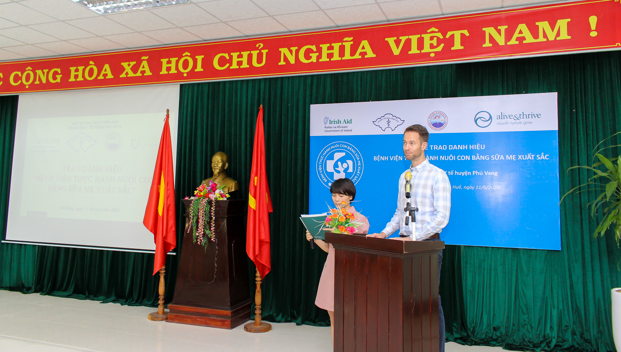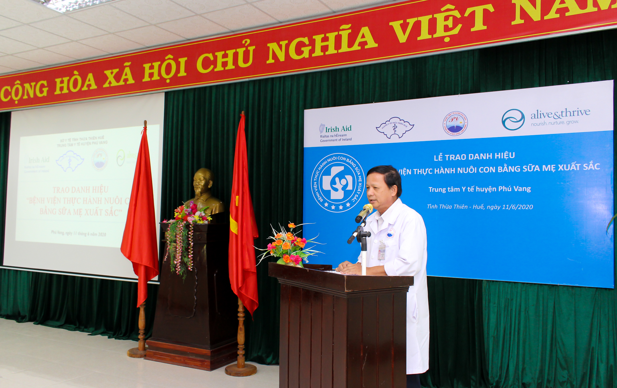 Ngày 11-6-2020, tại Trung tâm Y tế huyện Phú Vang, Sở Y tế tỉnh Thừa Thiên Huế phối hợp với tổ chức Alive & Thrive tổ chức buổi lễ công nhận Bệnh viện huyện Phú Vang đạt tiêu chí “Bệnh viện thực hành nuôi con bằng sữa mẹ xuất sắc”. Tham dự buổi lễ có Ths.BS Nguyễn Khoa Nguyên - Phó Giám đốc Trung tâm KSBT tỉnh; đại diện phòng Nghiệp vụ Y phụ trách hệ chăm sóc SKSS Sở Y tế; BS.CKII Trương Như Sơn- Giám đốc TTYT huyện Phú Vang; ông Roger Mathisen - Giám đốc Chương trình, Alive & Thrive; đại diện lãnh đạo Bệnh viện đa khoa Chân Mây, BVĐK Bình Điền; lãnh đạo TTYT và lãnh đạo Khoa Chăm sóc SKSS của các huyện, thị, xã, thành phố.