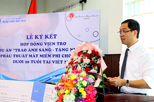 Sáng ngày 13/5, tại Bệnh viện Mắt Huế đã diễn ra lễ ký kết hợp đồng viện trợ Dự án "Trao anh sáng - tặng nụ cười" phẫu thuật mắt miễn phí cho trẻ em dưới 20 tuổi tại Việt Nam.Tham dự, có PGS.TS Trần Kiêm Hảo - Giám đốc Sở Y tế; GS.BS Hattori Tadashi – Giám đốc điều hành Tổ chức phòng chống mù lòa Châu Á – APBA.
