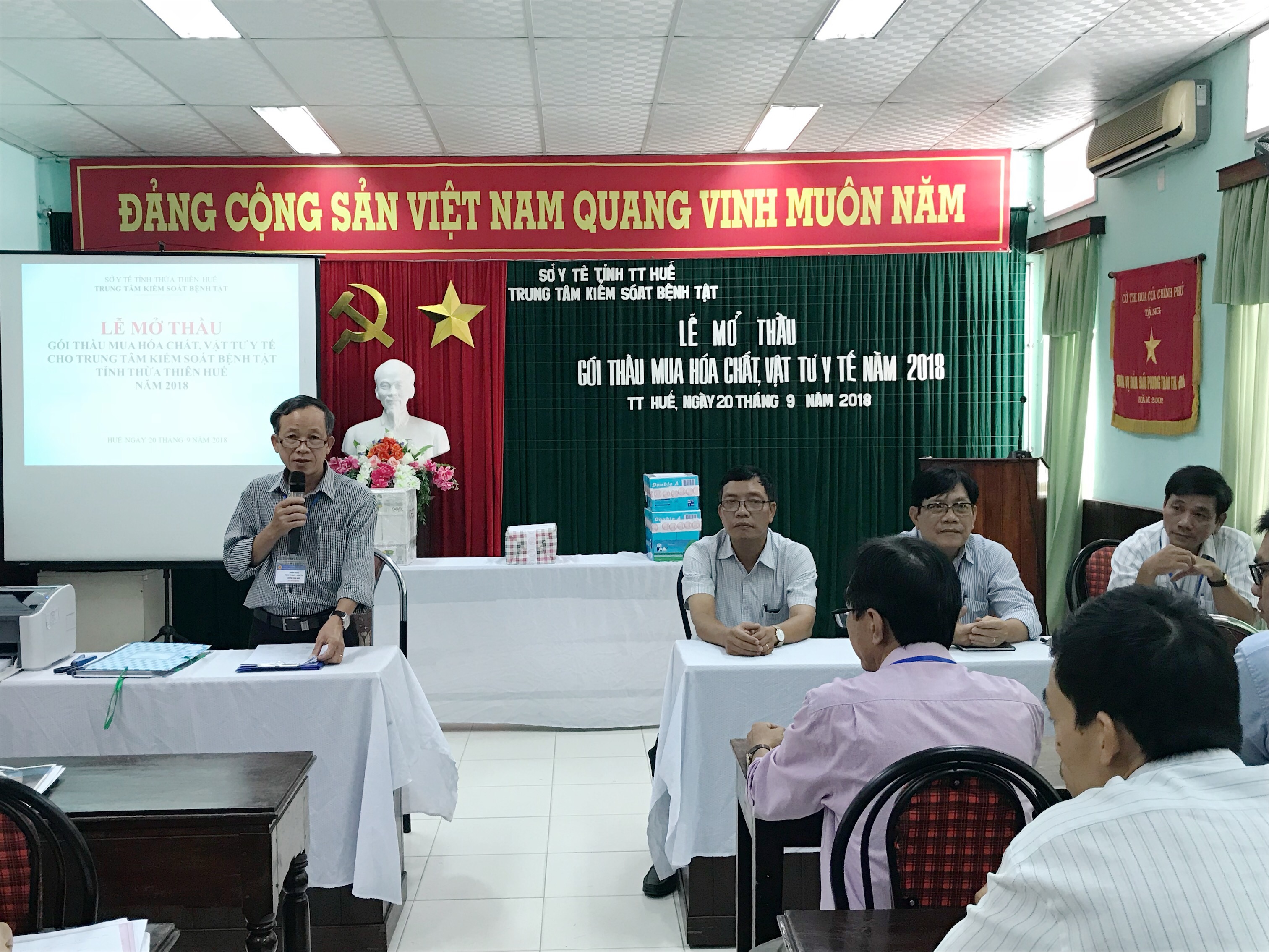 Sáng ngày 20 tháng 9 năm 2018, vào lúc 9 giờ 30, tại Hội trường Trung tâm Kiểm soát bệnh tật (CDC) tỉnh Thừa Thiên Huế, 10-12 Nguyễn Văn Cừ TP Huế, Trung tâm Kiểm soát bệnh tật đã tổ chức Lễ mở thầu gói thầu Mua hóa chất, vật tư y tế năm 2018.