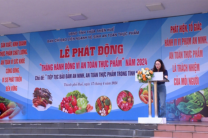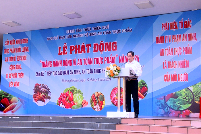 Sáng ngày 17/4, Ban Chỉ đạo liên ngành vệ sinh an toàn thực phẩm (VSATTP) tỉnh tổ chức Lễ phát động Tháng hành động vì an toàn thực phẩm năm 2024 với chủ đề “Bảo đảm an ninh, ATTP trong tình hình mới”. Dự buổi lễ phát động có Phó Chủ tịch HĐND tỉnh Nguyễn Thị Ái Vân; Phó Chủ tịch Thường trực UBND tỉnh Nguyễn Thanh Bình; đại diện Ủy ban MTTQVN tỉnh; lãnh đạo các sở, ban, ngành, đoàn thể; thành viên Ban chỉ đạo VSATTP tỉnh; Ban chỉ đạo VSATTP các huyện, thị xã và thành phố Huế.