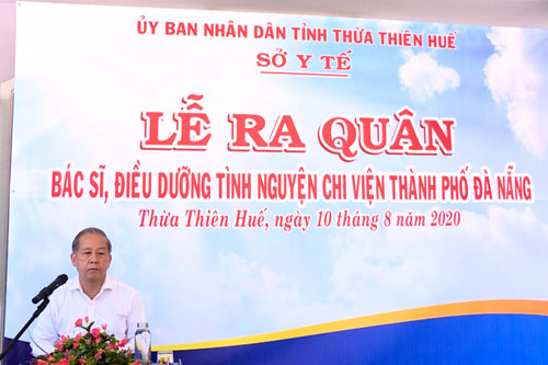 Phát biểu tại buổi lễ, Chủ tịch UBND tỉnh Phan Ngọc Thọ đã biểu dương các “Chiến sĩ áo trắng” đã tham gia chi viện cho Đà Nẵng trong đợt này, đồng thời gửi lời cám ơn, cùng sự tri ân sâu sắc của nhân dân và lãnh đạo tỉnh đến các y bác sĩ đang công tác tại các đơn vị y tế trên địa bàn tỉnh, đã không quản ngại khó khăn hy sinh để phục vụ cho công tác phòng, chống dịch. Đồng chí tin tưởng với tay nghề, quyết tâm cao và trách nhiệm trước cộng đồng, Đoàn công tác của tỉnh Thừa Thiên Huế sẽ hoàn thành xuất sắc nhiệm vụ, giúp người dân Đà Nẵng, giúp cho cả nước trong việc khống chế dịch bệnh COVID-19, trong thời gian sớm nhất.