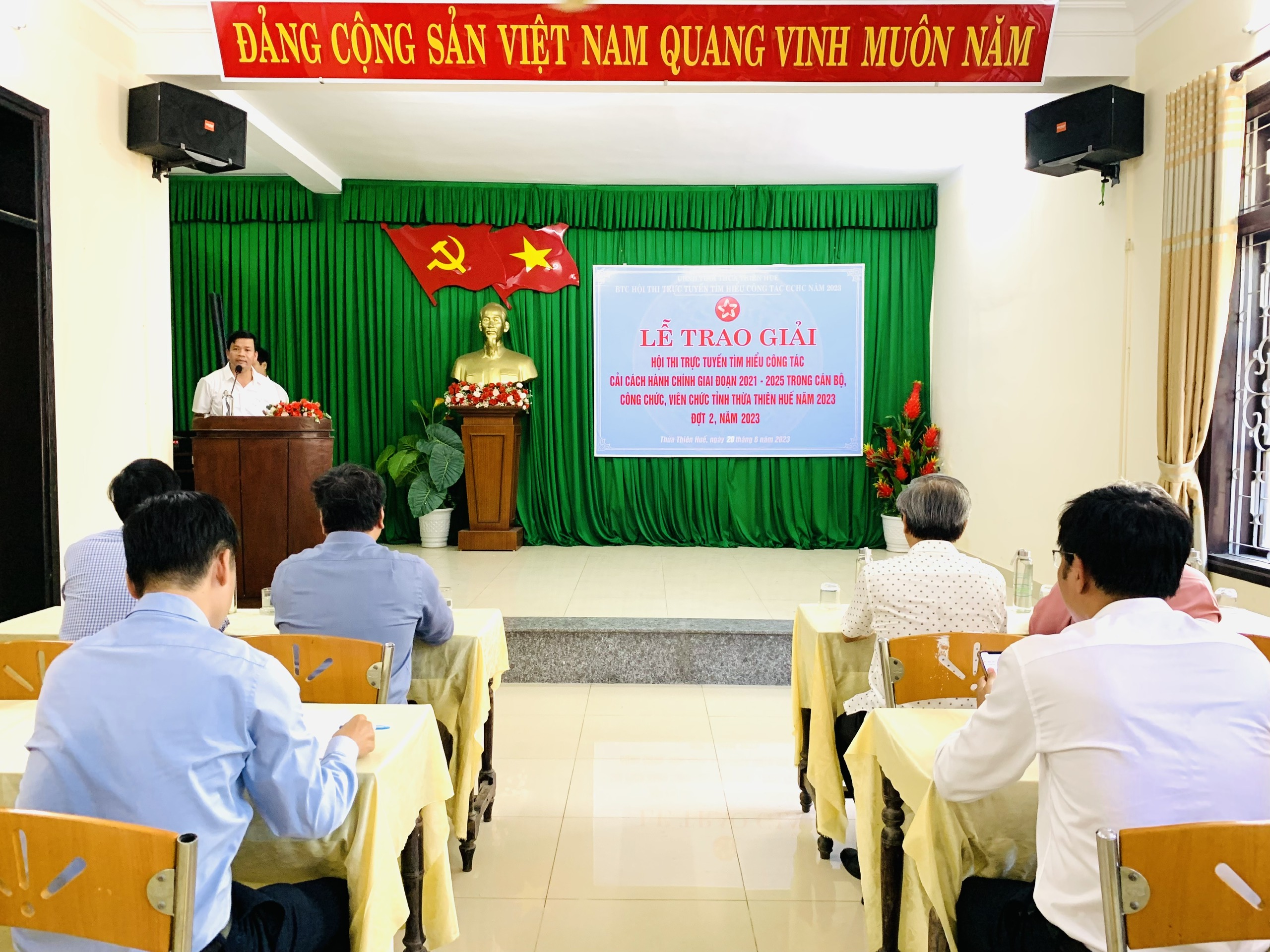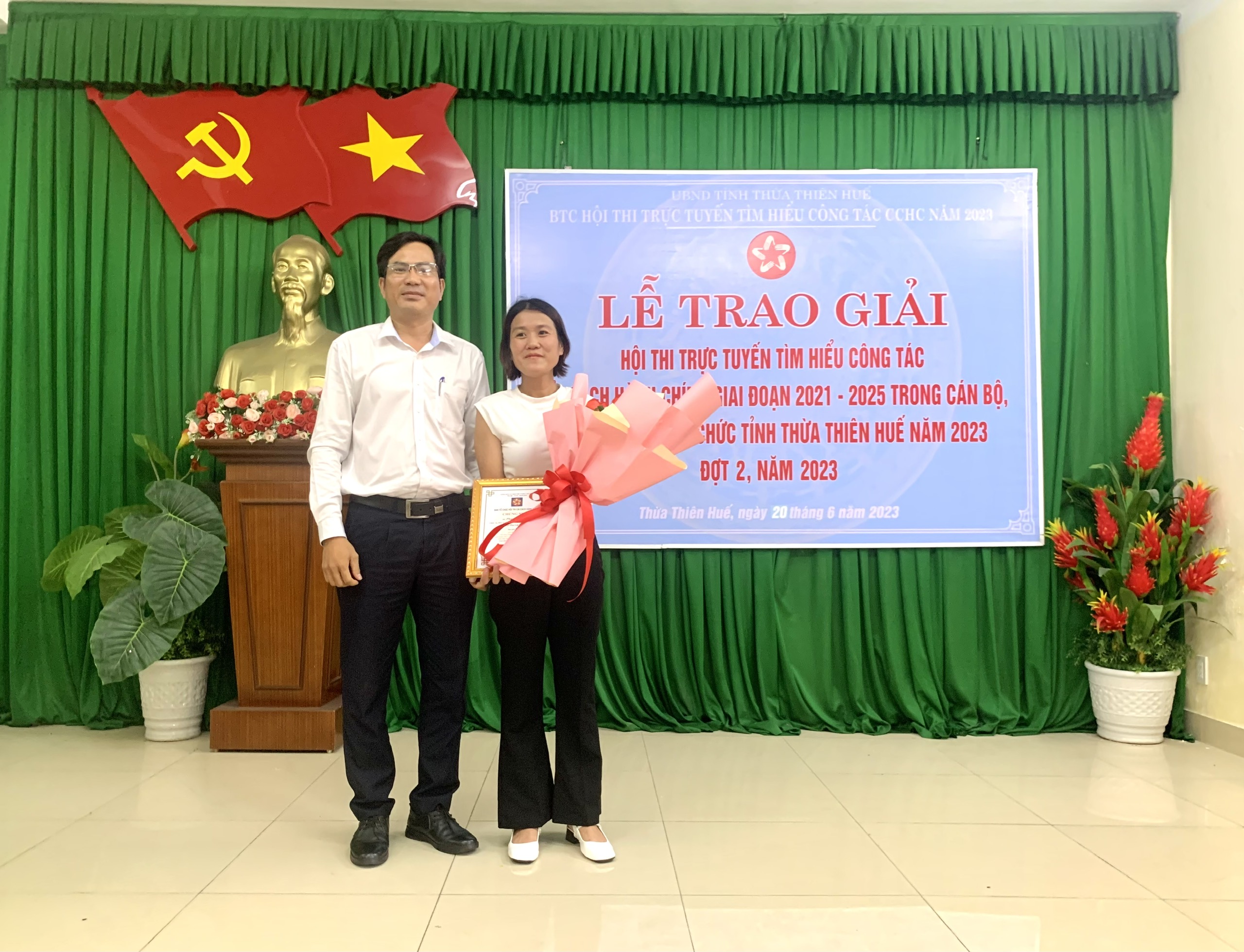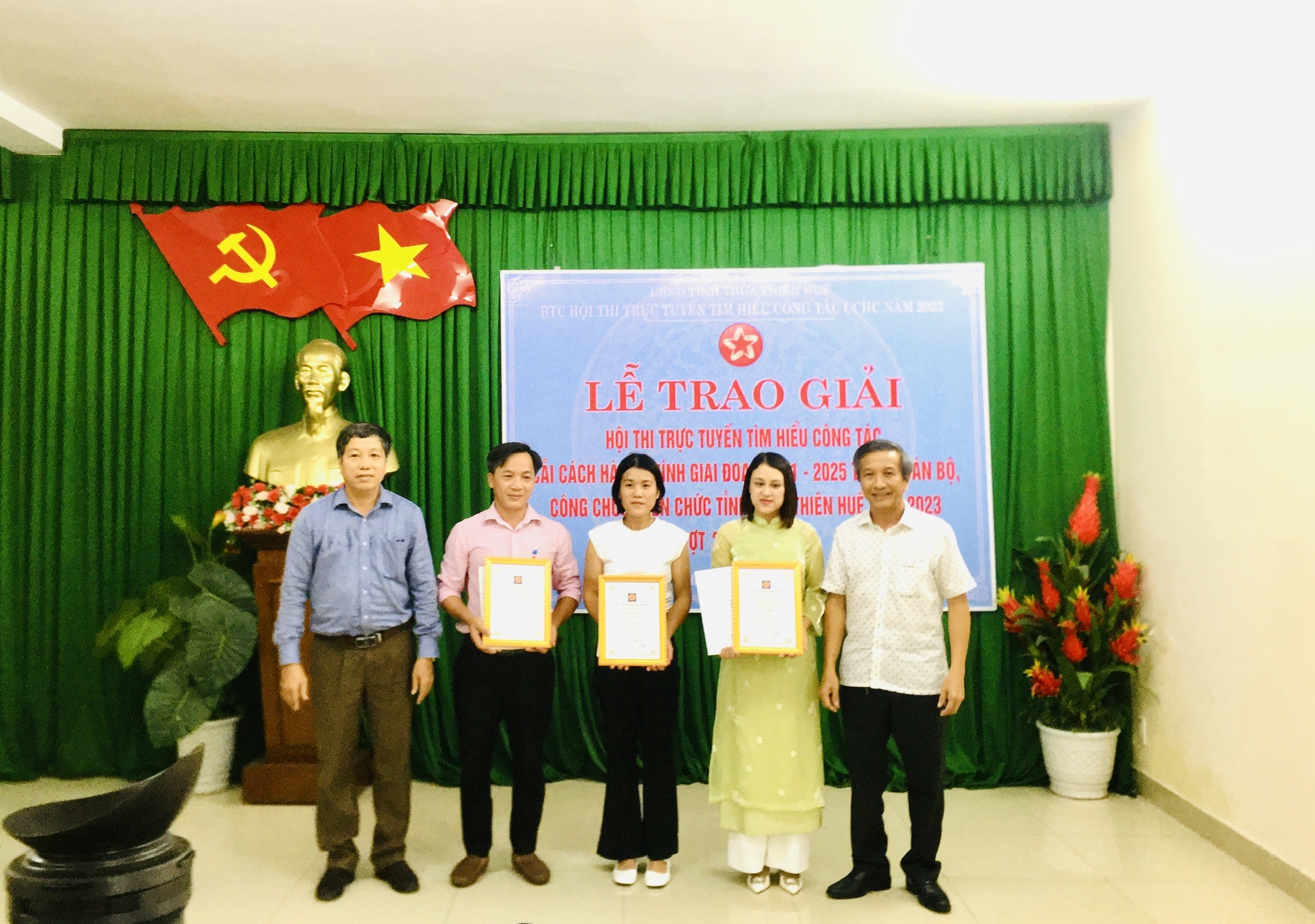 Sáng ngày 20 tháng 6 năm 2023, tại Sở Nội vụ, Ban tổ chức Hội thi trực tuyến tìm hiểu công tác CCHC tỉnh Thừa Thiên Huế năm 2023 đã tổ chức Lễ trao giải (tuần thứ 2, từ ngày 12/6-18/6/2023) Hội thi trực tuyến tìm hiểu công tác CCHC giai đoạn 2021 - 2025 trong cán bộ, công chức, viên chức tỉnh Thừa Thiên Huế năm 2023. Tham dự Lễ trao giải có các thành viên Ban tổ chức Hội thi theo Quyết định số 762/QĐ-UBND ngày 10/4/2023 của UBND tỉnh và các thành viên Ban giám khảo, Tổ chuyên viên giúp việc của Hội thi; Đại diện lãnh đạo Văn phòng Sở Y tế, Phòng Văn hóa và Thông tin thành phố Huế, Trung tâm Y tế huyện Phú Lộc, Trung tâm Phát triển Quỹ đất huyện Nam Đông và các cơ quan thông tấn báo chí trên địa bàn.
