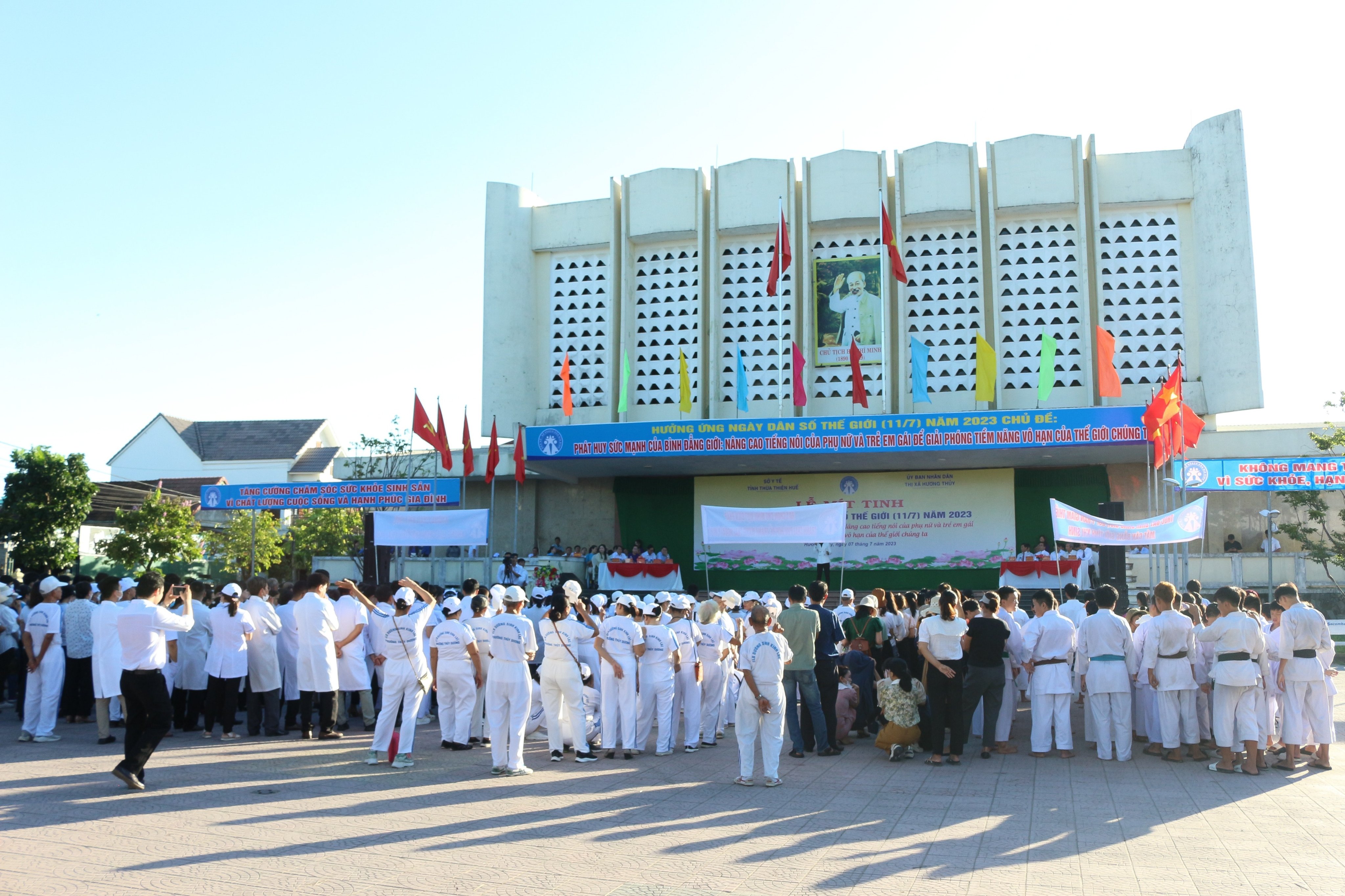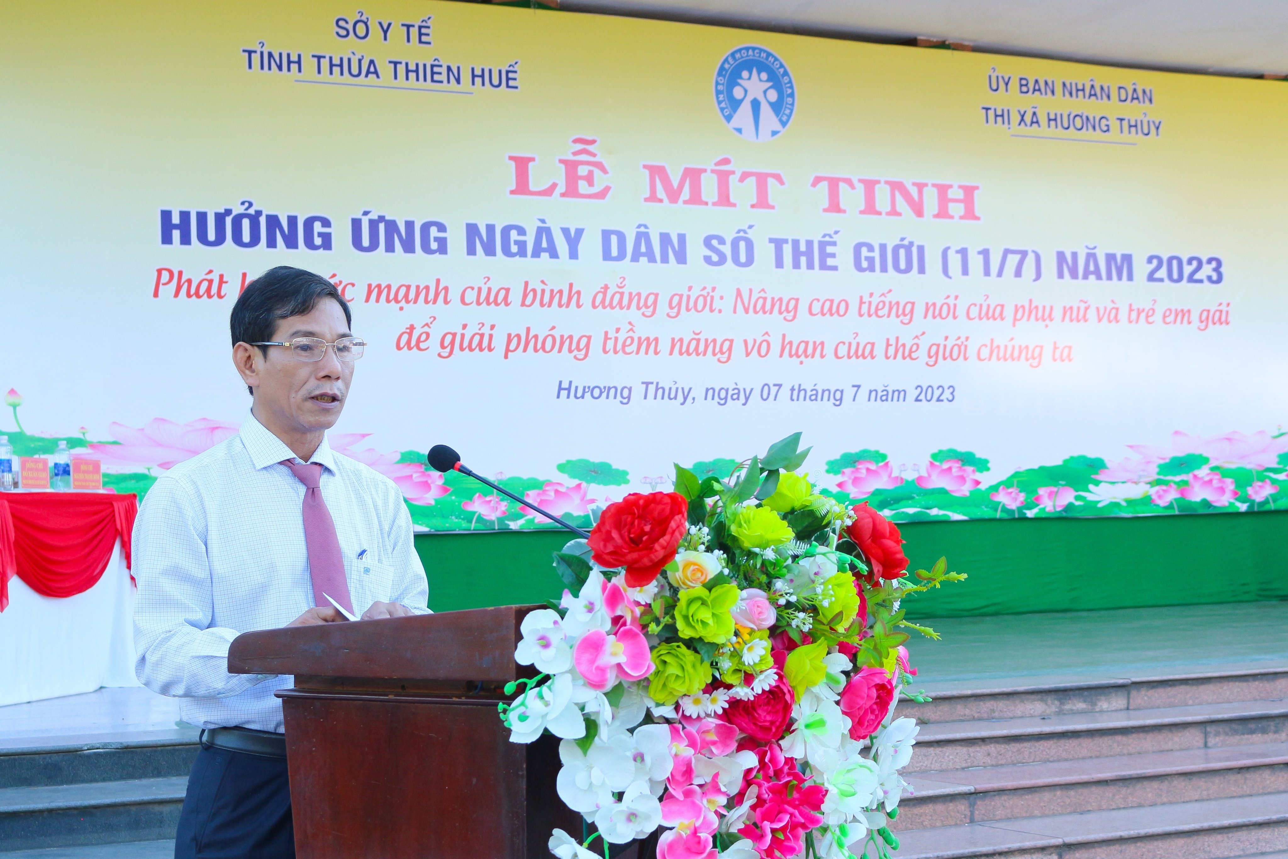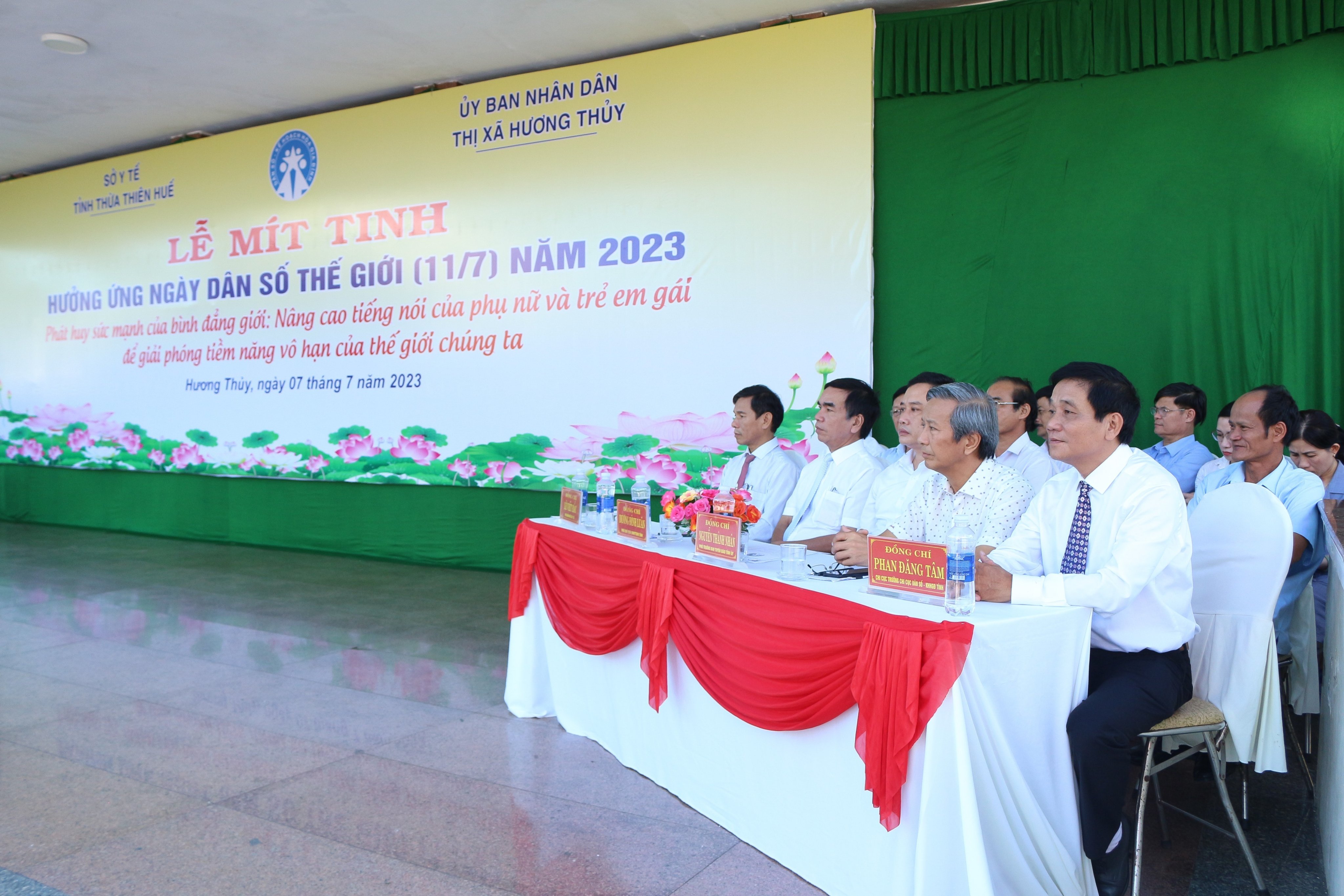 Sáng ngày 07/7/2023, tại tiền sảnh Nhà văn hoá thông tin thị xã Hương Thuỷ, Sở Y tế tỉnh Thừa Thiên Huế phối hợp với UBND thị xã Hương Thuỷ tổ chức Lễ mít tinh kỷ niệm ngày Dân số Thế giới năm 2023. Đến tham dự về phía cấp tỉnh có ông Dương Đình Luân- Phó Chủ tịch UBMTTQVN tỉnh, ông Nguyễn Thành Nhân - Phó ban Tuyên giáo Tỉnh uỷ, ông Nguyễn Thanh Sơn- PGĐ Sở Tư pháp, ông Lê Viết Bắc- PGĐ Sở Y tế, ông Phan Đăng Tâm- Chi cục trưởng Chi cục DS-KHHGĐ và đại diện lãnh đạo các cơ quan thành viên Ban chỉ đạo công tác Dân số và phát triển tỉnh, các đơn vị liên quan. Về phía thị xã Hương Thuỷ có ông Đỗ Xuân Giao- Phó Bí thư thường trực Thị ủy, Chủ tịch HĐND thị xã; ông Nguyễn Thanh Minh- Phó Bí thư Thị ủy, Chủ tịch UBND thị xã cùng đại diện các phòng, ban, đoàn thể, các thành viên Ban Chỉ đạo Dân số và phát triển; lãnh đạo UBND, Trạm trưởng Trạm y tế, cán bộ dân số, CTV dân số, cán bộ Trạm Y tế, Hội Dưỡng sinh, CLB Võ thuật, Đoàn TNCS HCM của các xã, phường thuộc thị xã Hương Thủy; lãnh đạo UBND, Uỷ ban MTTQVN, Trung tâm Y tế, Phòng Dân số-TTGDSK các huyện, thị xã Hương Trà và thành phố Huế.