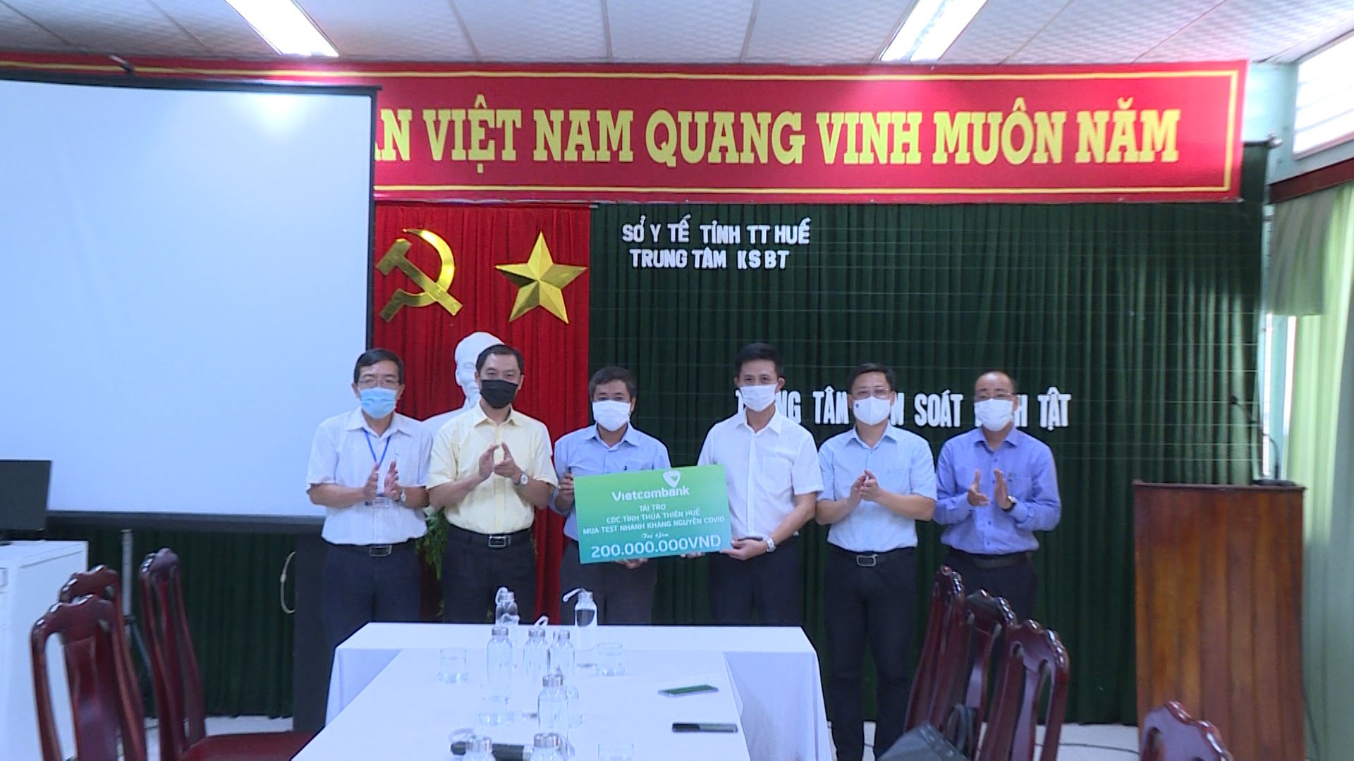 Ngày 22- 6-2021, Ngân hàng Vietcombank chi nhánh Thừa Thiên Huế đã trao hỗ trợ vật tư phòng chống dịch Covid-19 cho Trung tâm Kiểm soát bệnh tật tỉnh . Tham dự buổi tiếp nhận, có ông Nguyễn Thanh Bình- Phó chủ tịch UBND tỉnh, ông Trần Kiêm Hảo - Giám đốc Sở Y tế, ông Hoàng Văn Đức - Giám đốc Trung tâm Kiểm soát bệnh tật tỉnh, ông Lý Hoàng Vũ - Giám đốc Ngân hàng Vietcombank chi nhánh Thừa Thiên Huế.